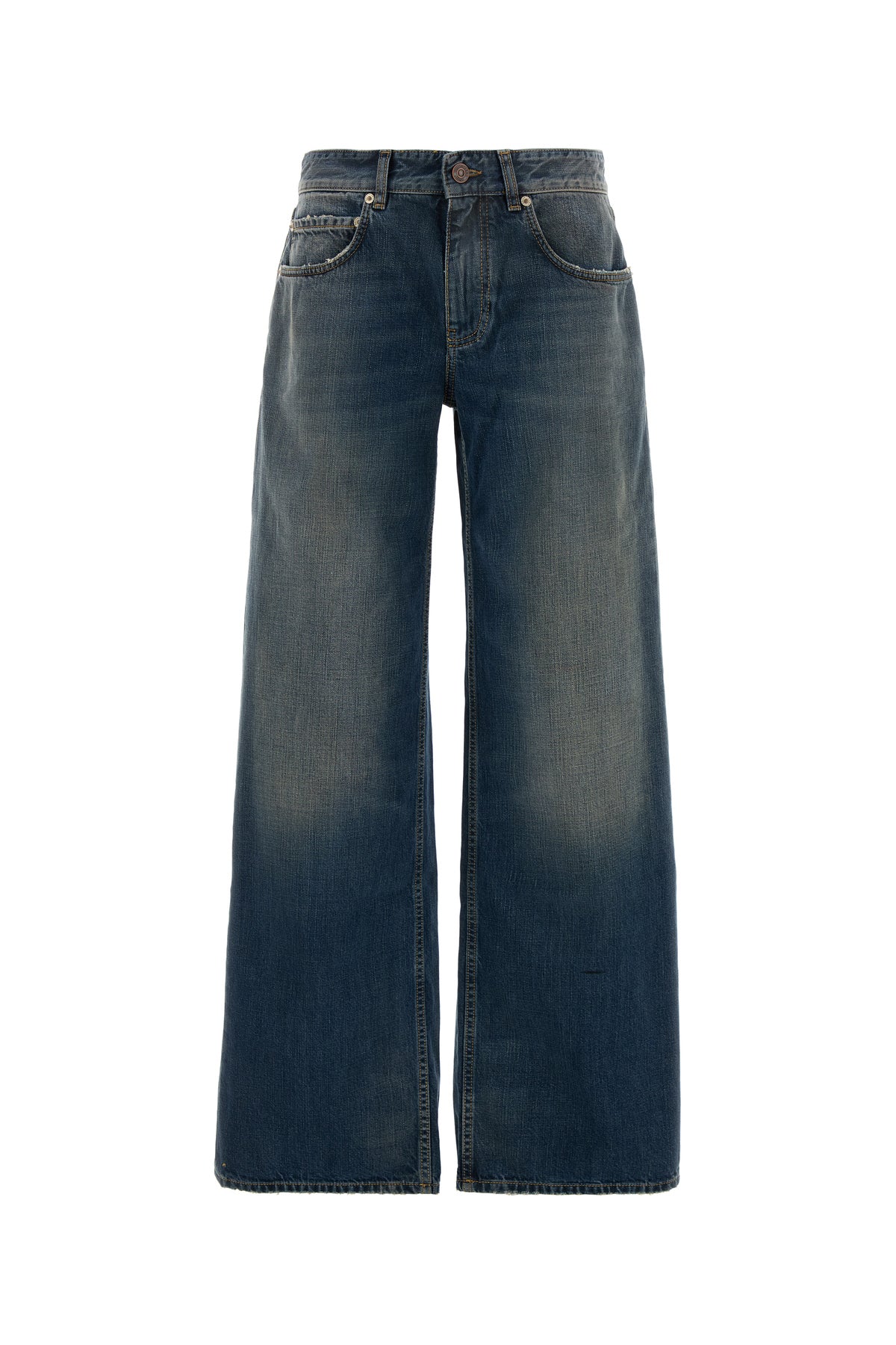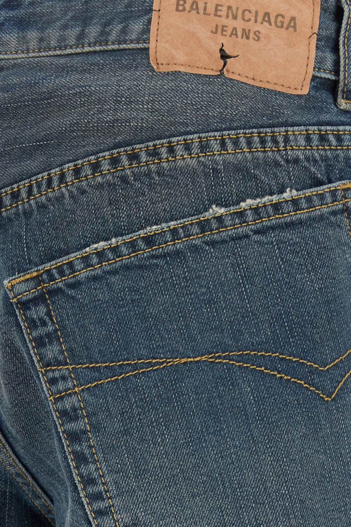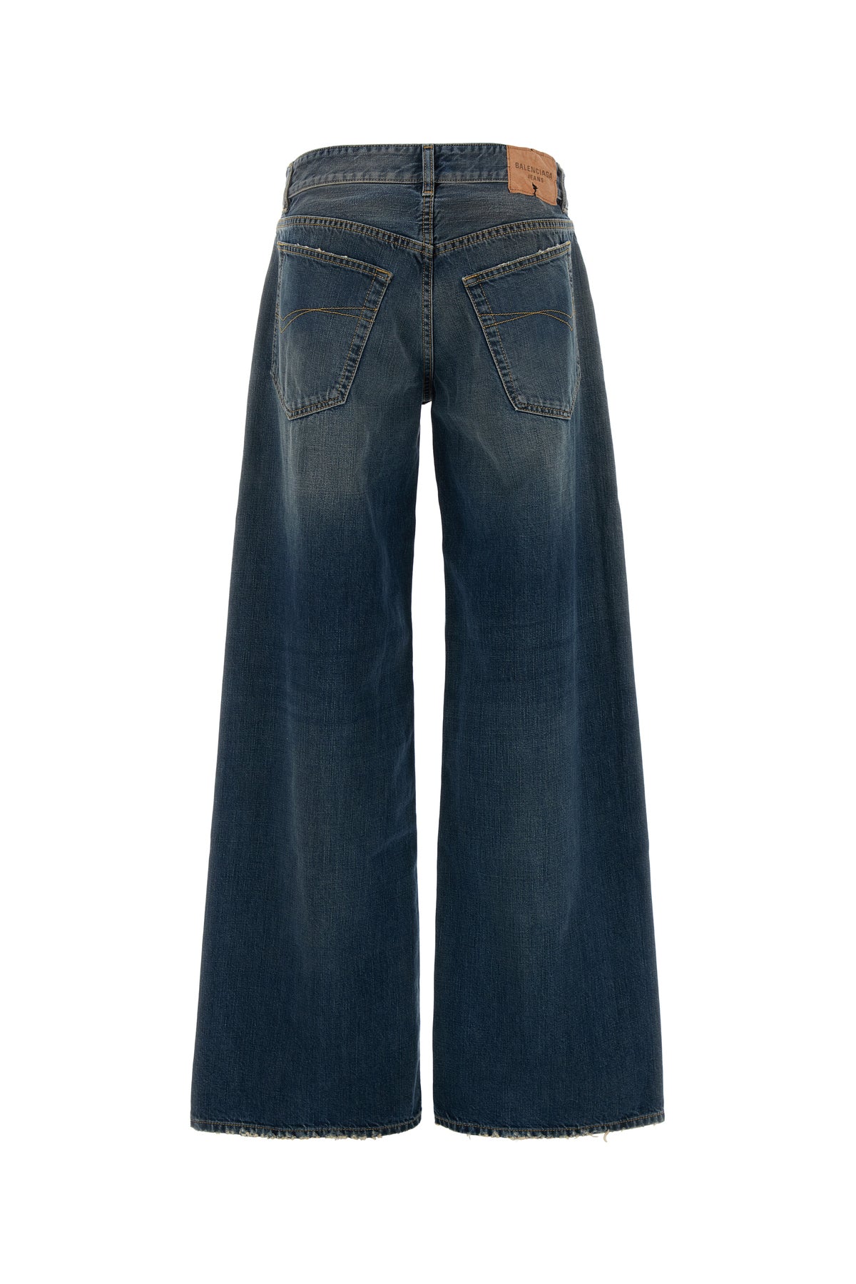 Baggy jeans realized in vintage-effect pure cotton denim enriched by Balenciaga label at the back.