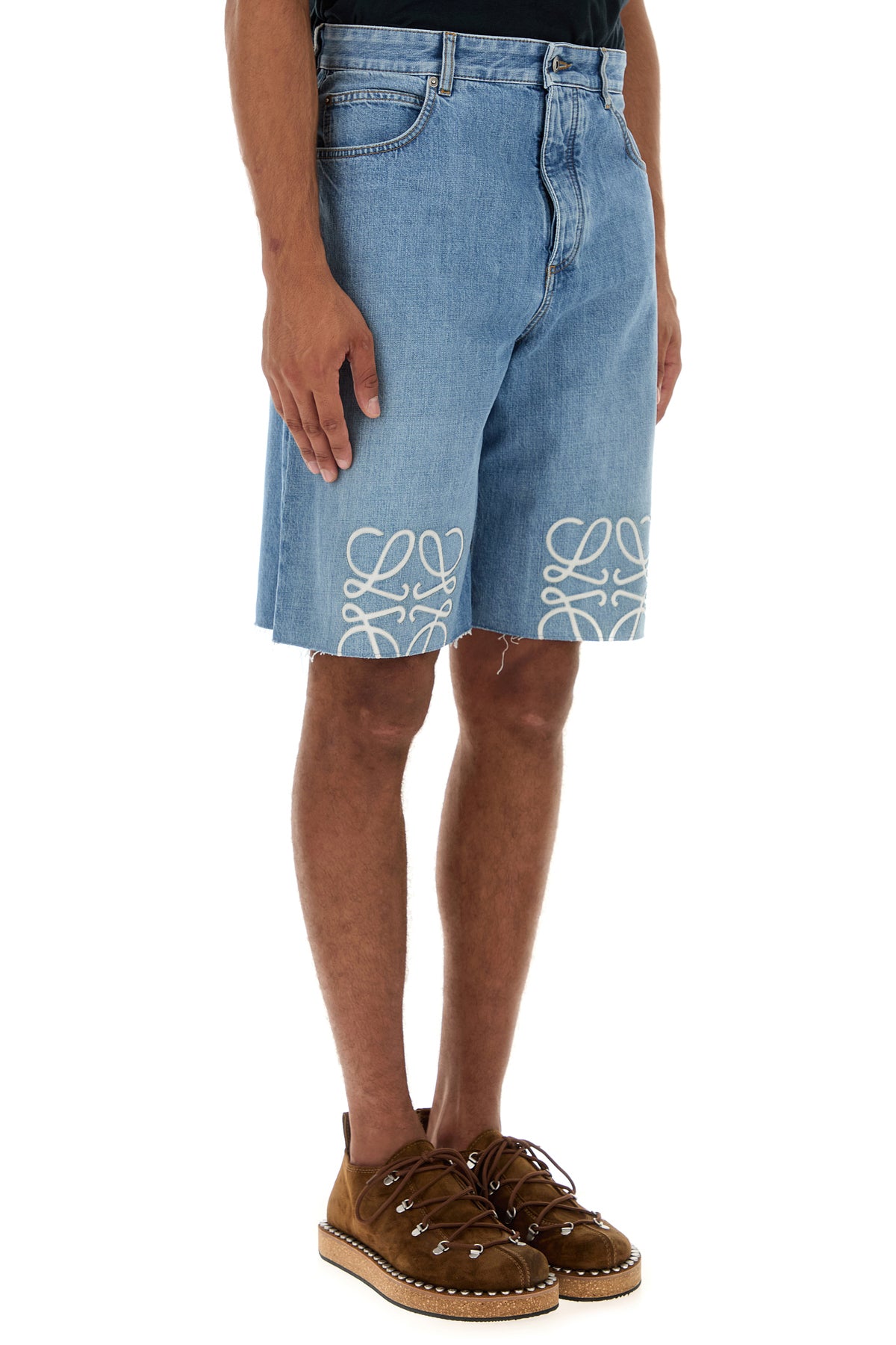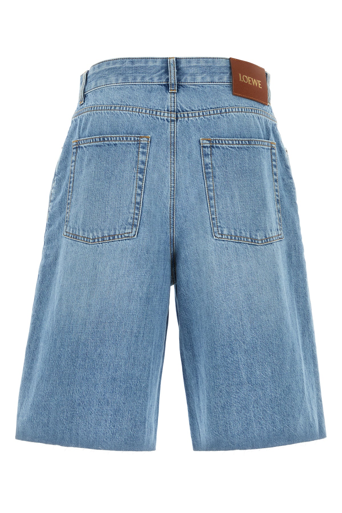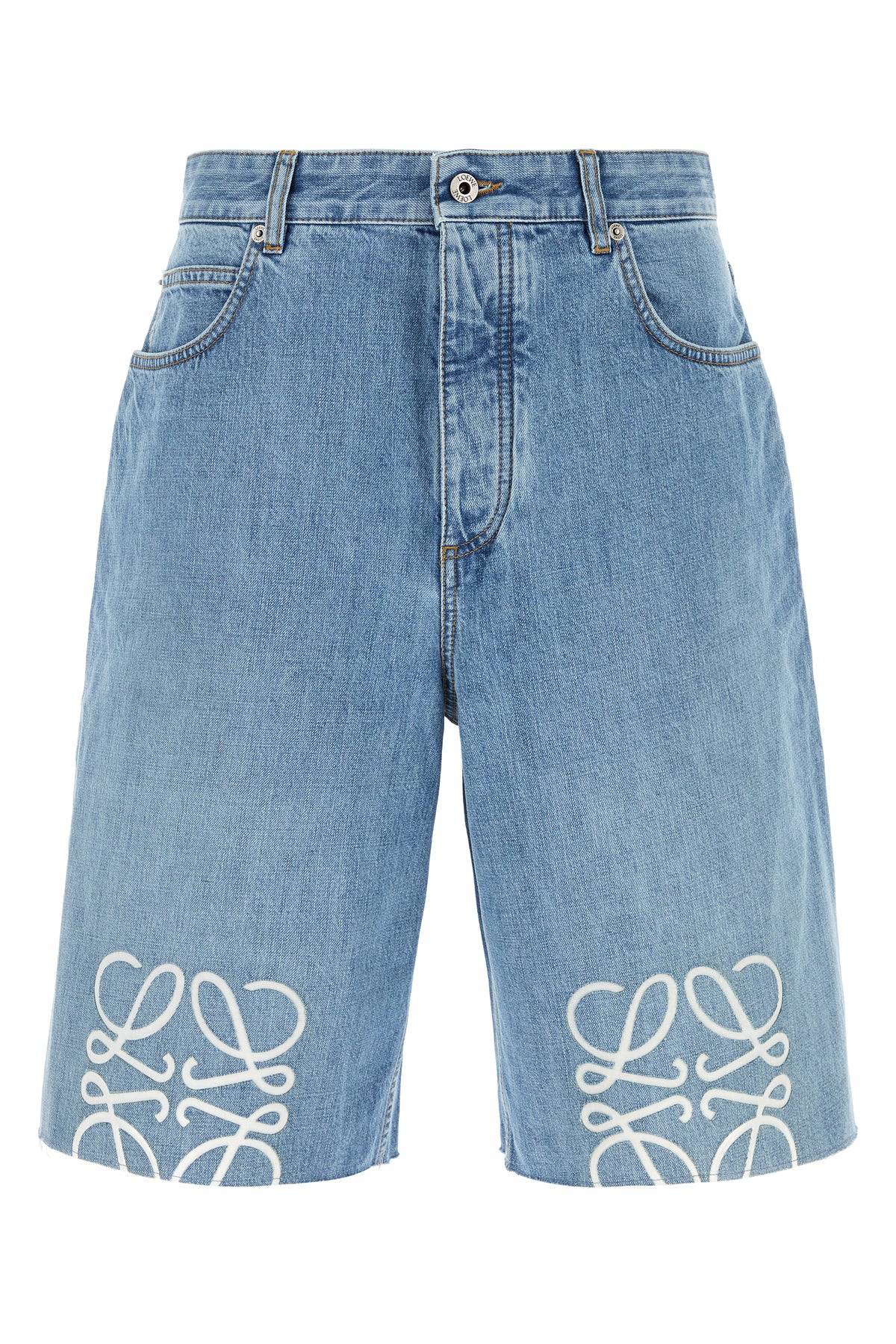 Bermuda shorts realized in slightly stonewashed pure cotton denim characterized by Anagram motif on the hemline enriched by leather LOEWE label at the back.