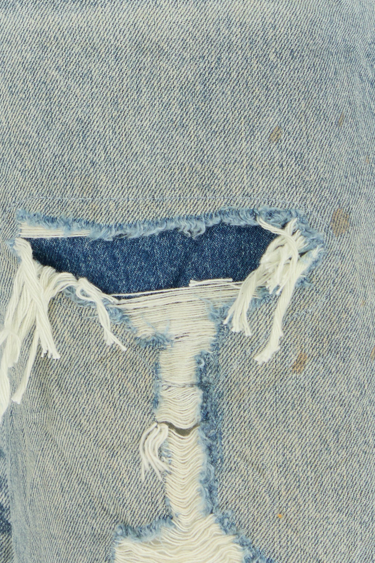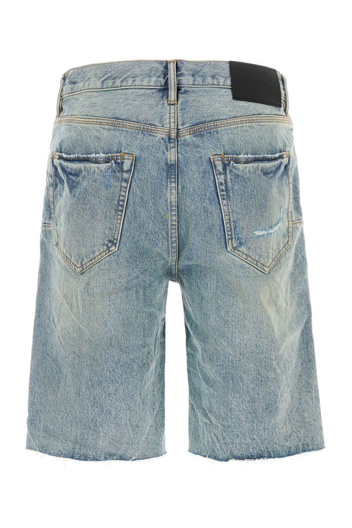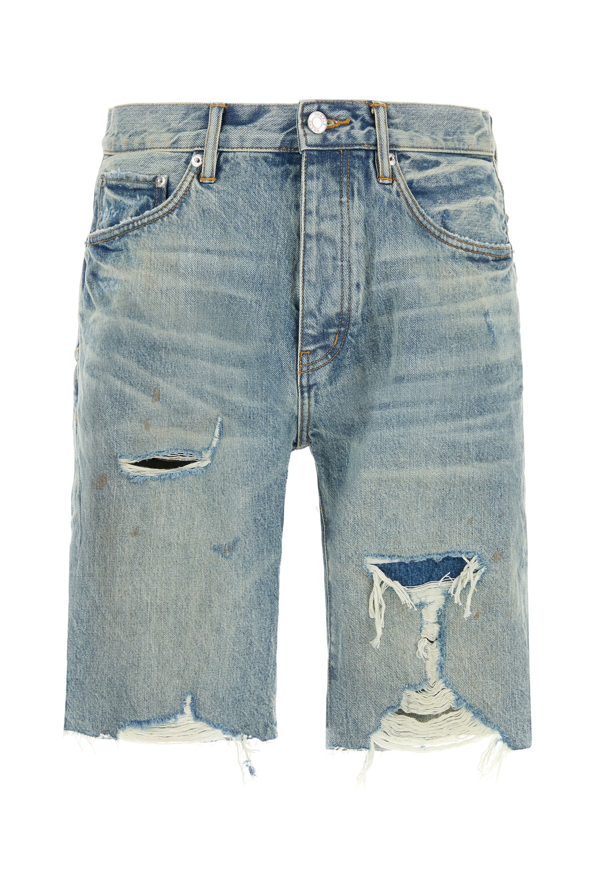 Bermuda shorts realized in stonewashed and slightly distressed pure cotton denim characterized by repaired rips enriched by contrasting logoed label at the back.
