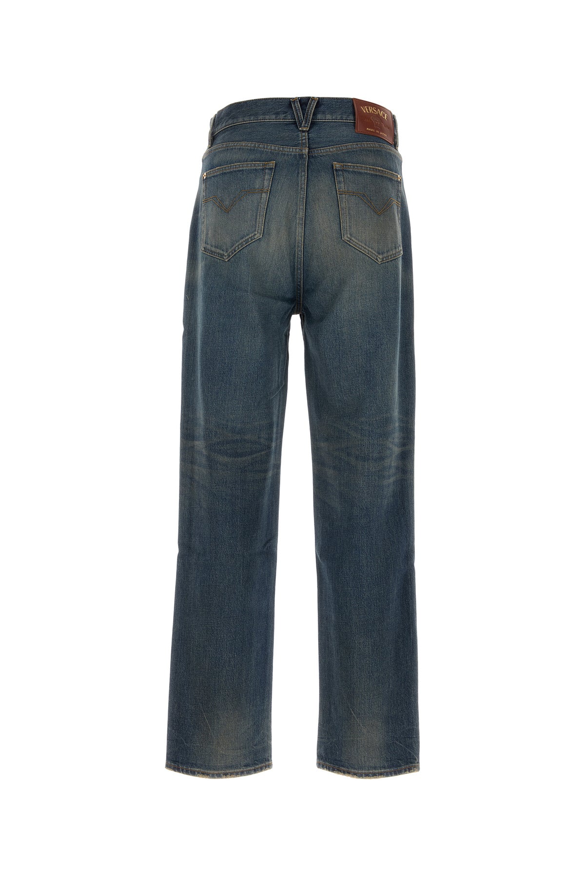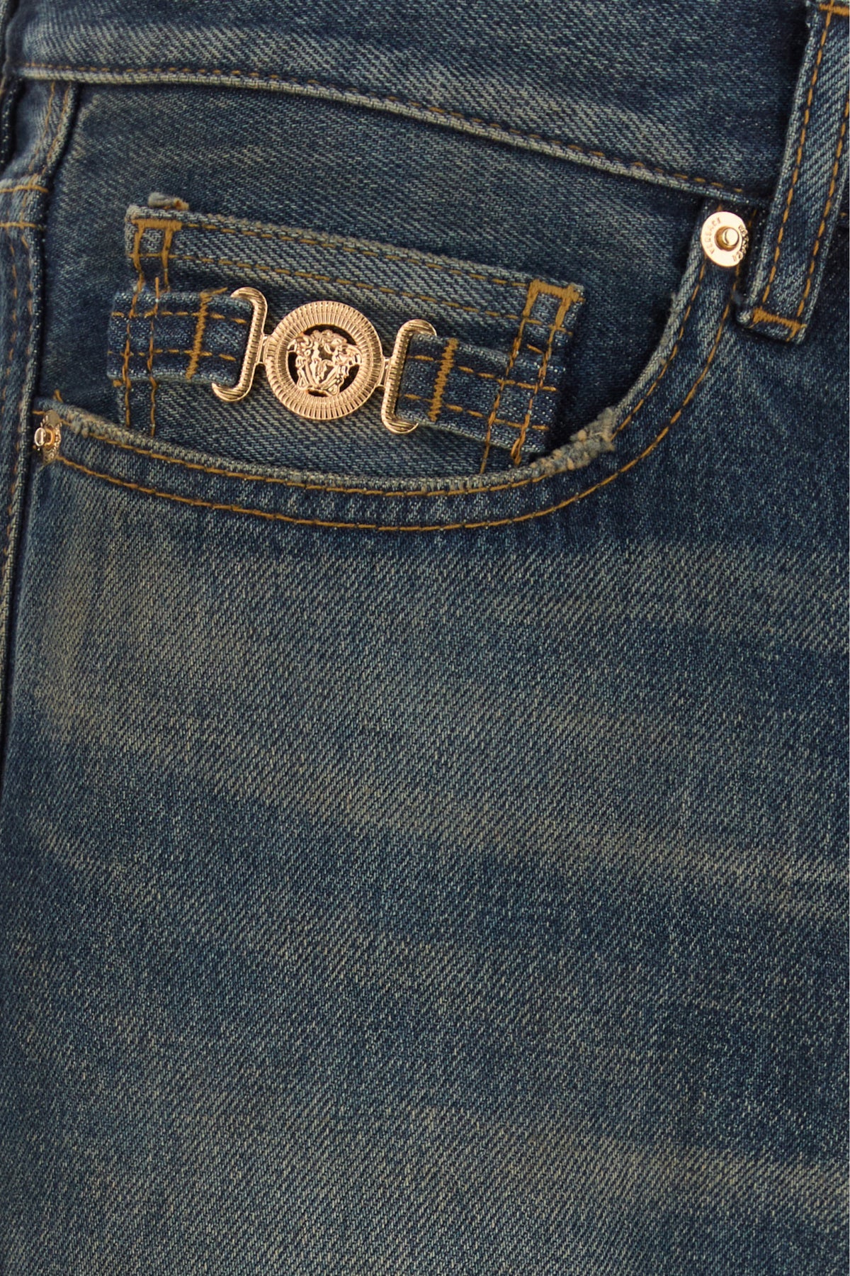 Jeans realized in vintage-effect pure cotton denim enriched by metal Medusa Biggie detail at the front and Versace Logo Made in Japan label at the back.