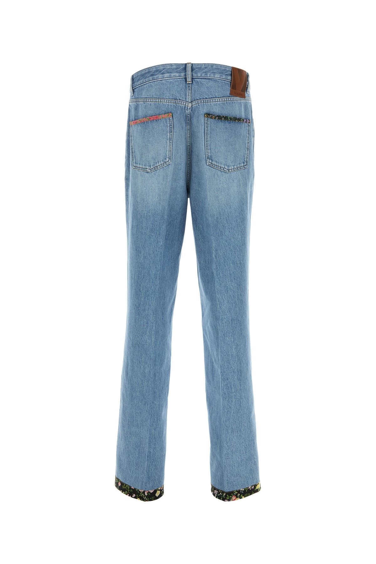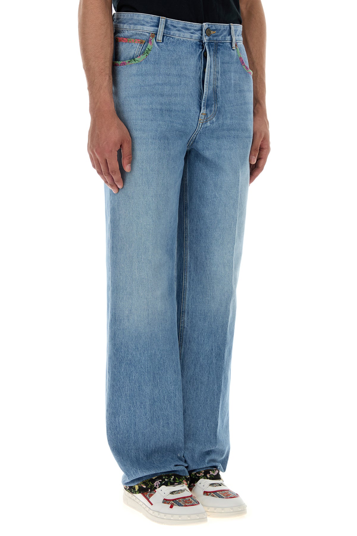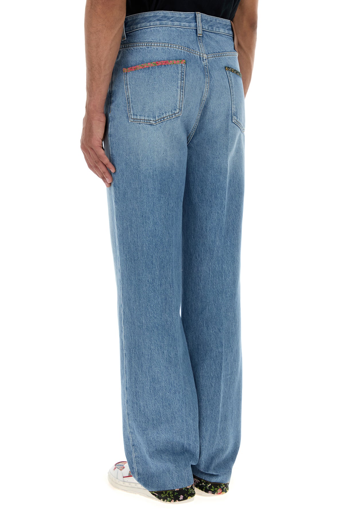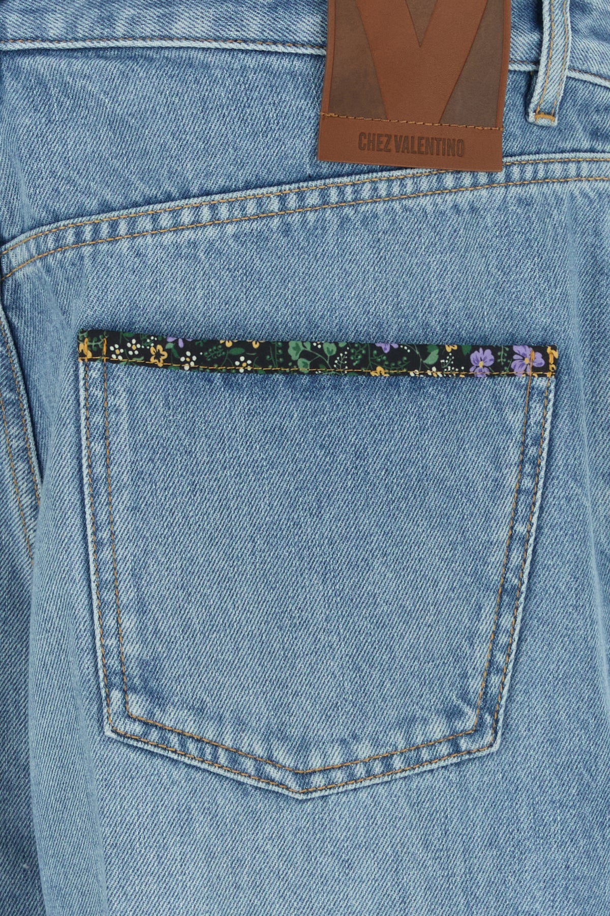 Jeans realized in slightly stonewashed pure cotton denim enriched by fabric inserts with floral print at the top and on the hemline.