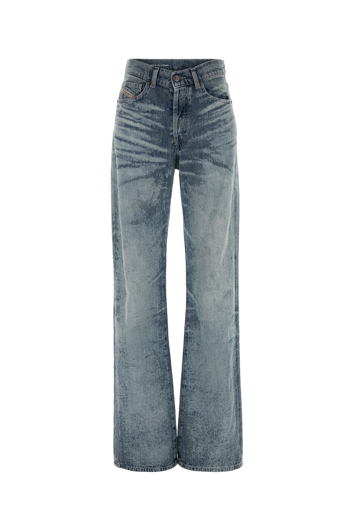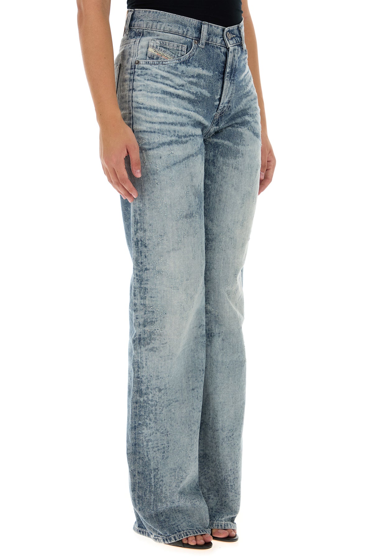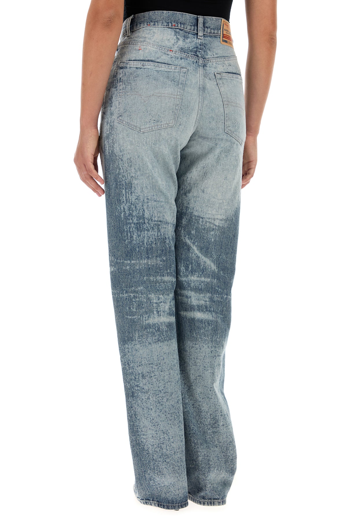 Jeans realized in stonewashed and distressed pure cotton enriched by logoed label at the back.
