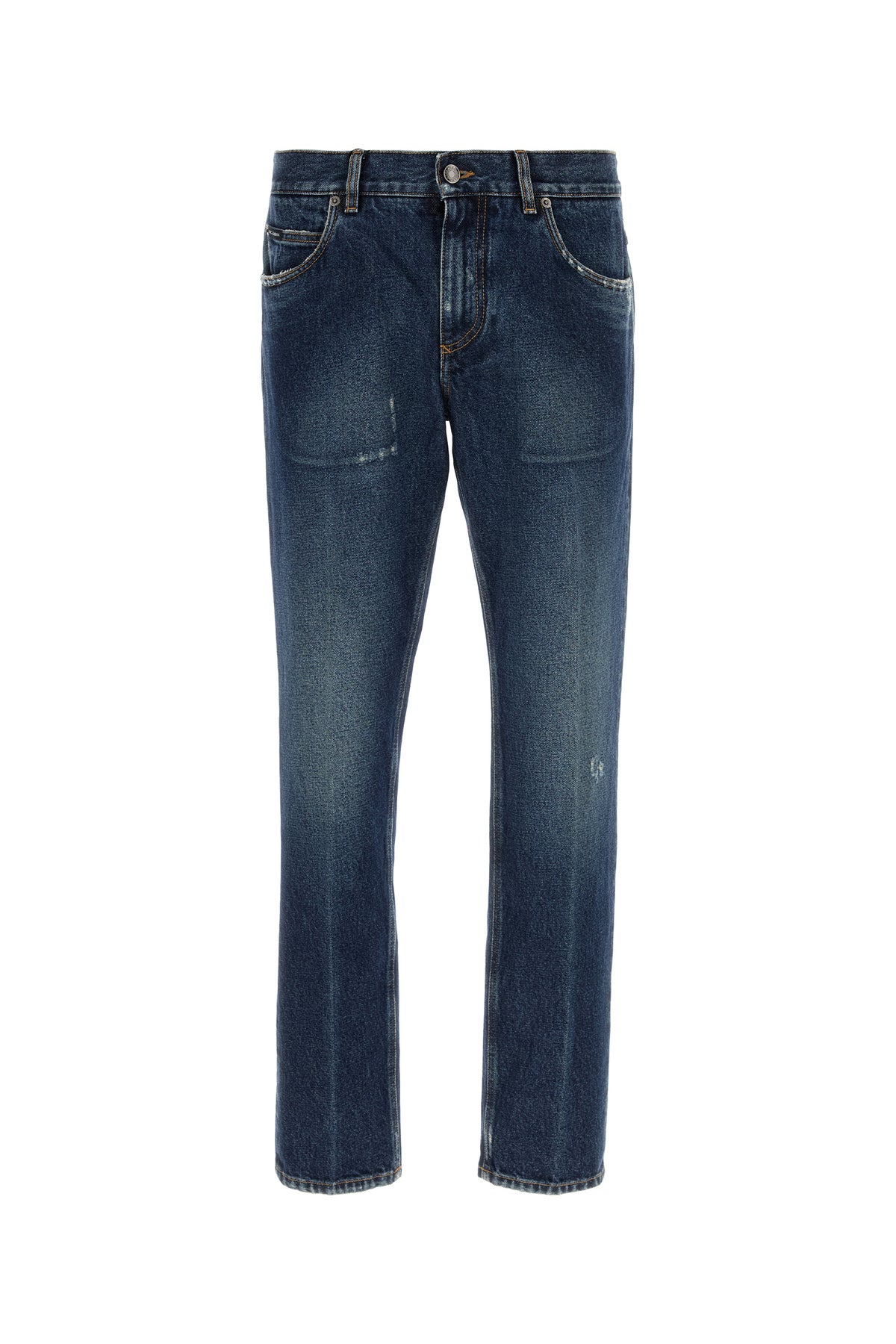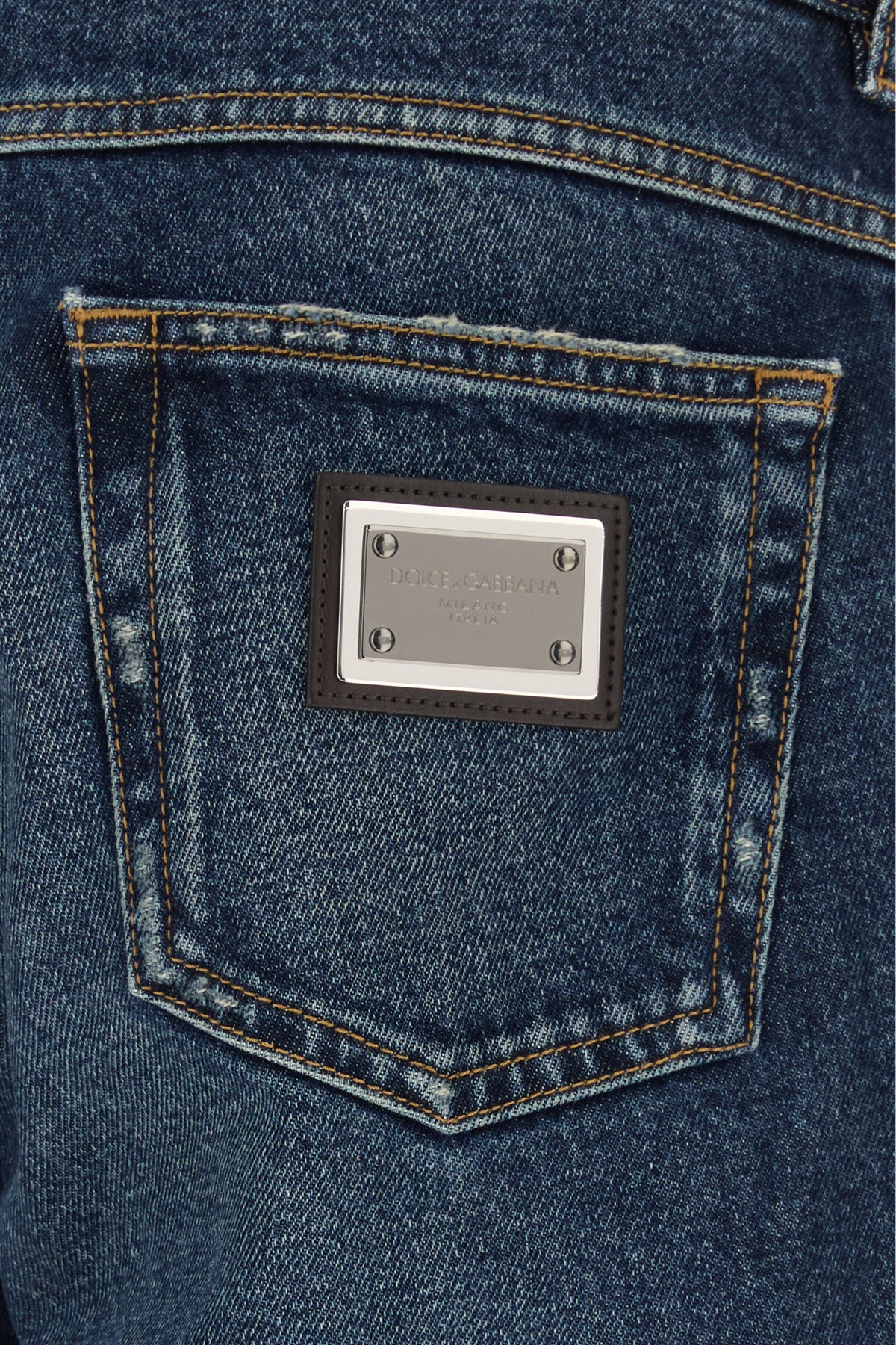 Jeans realized in stonewashed and slightly distressed pure cotton denim enriched by logoed metal plate at the back.