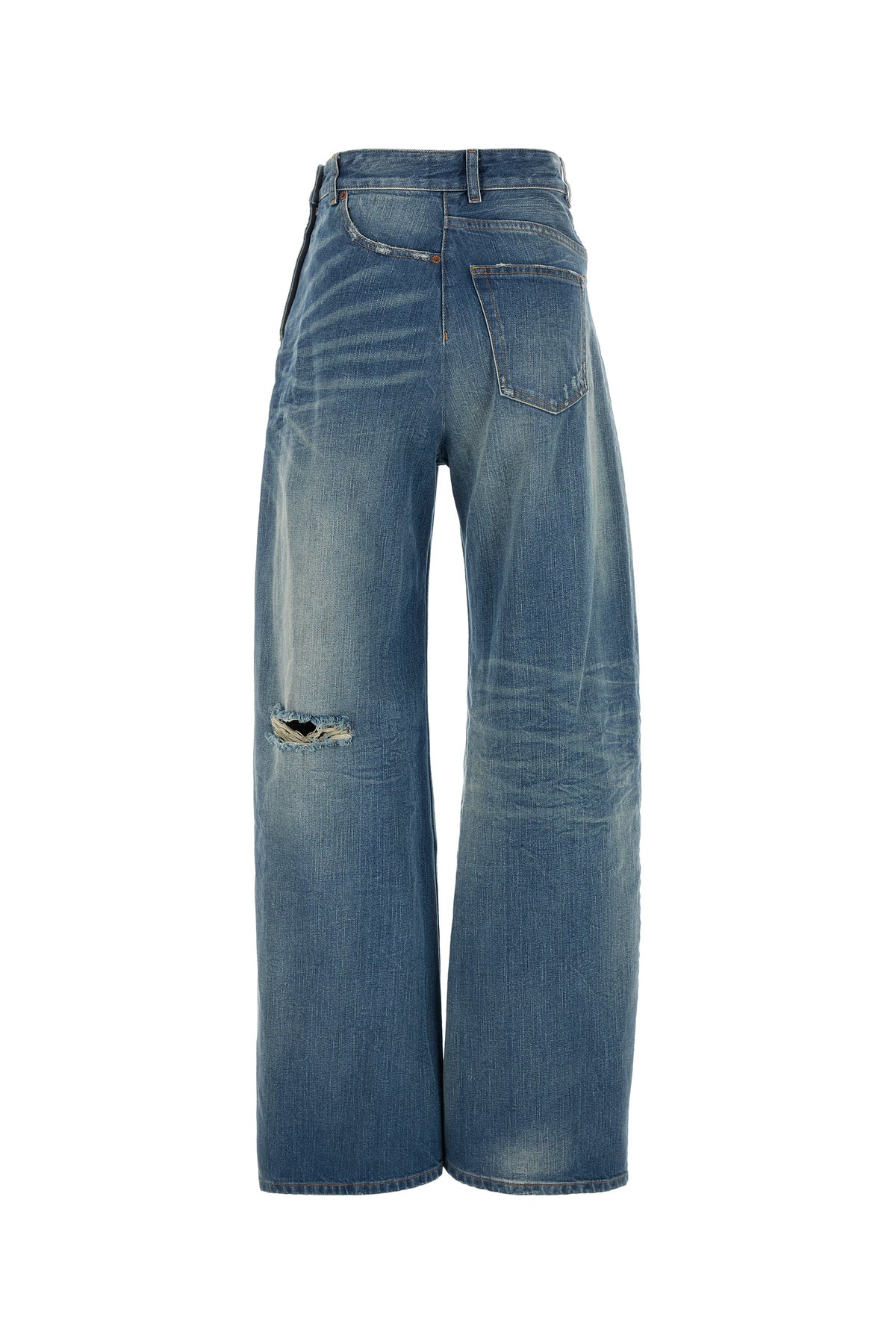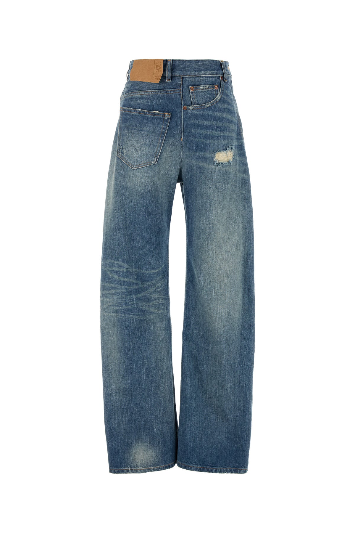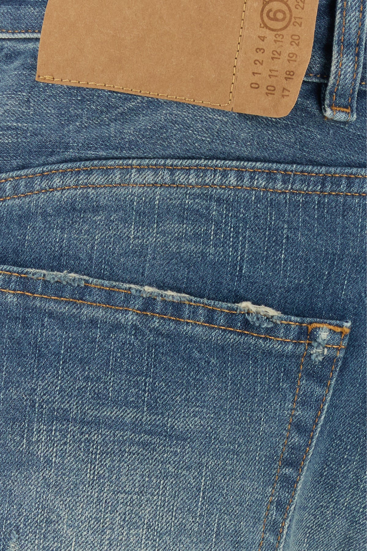 Asymmetric jeans realized in stonewashed and distressed pure cotton denim enriched by contrasting logoed label at the front.