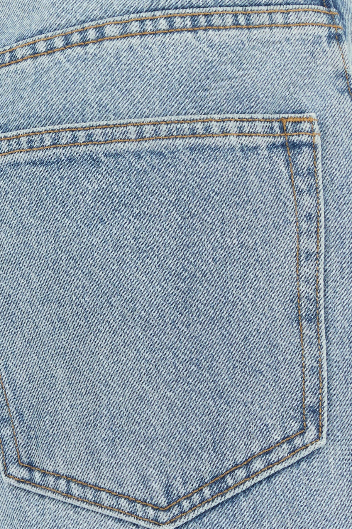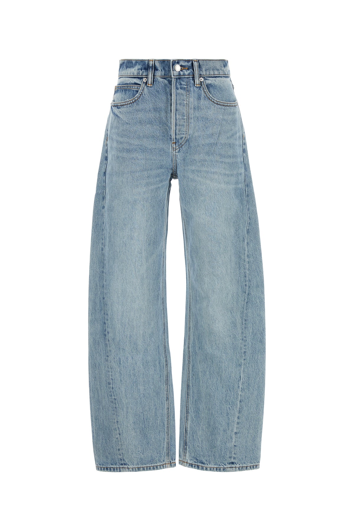 Wide-leg jeans realized in stonewashed and slightly distressed pure cotton denim enriched by contrasting logoed label at the back.