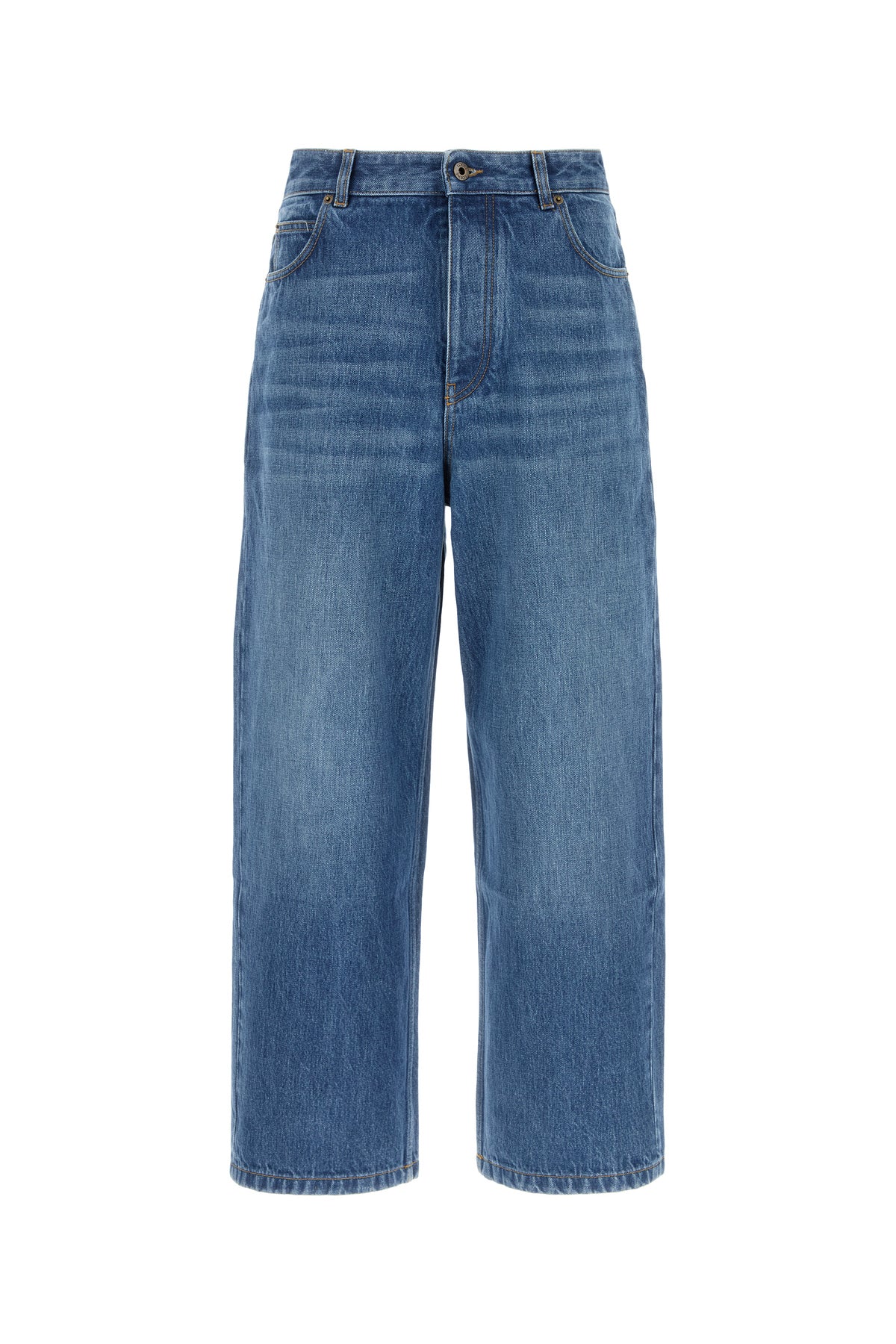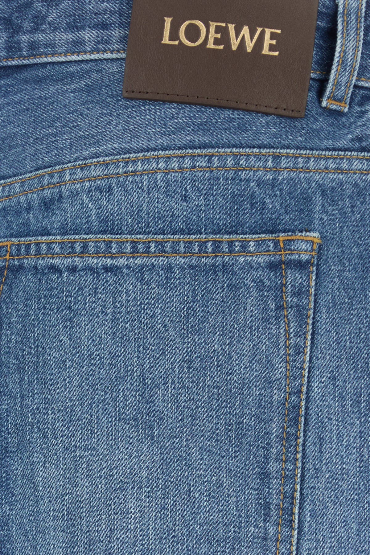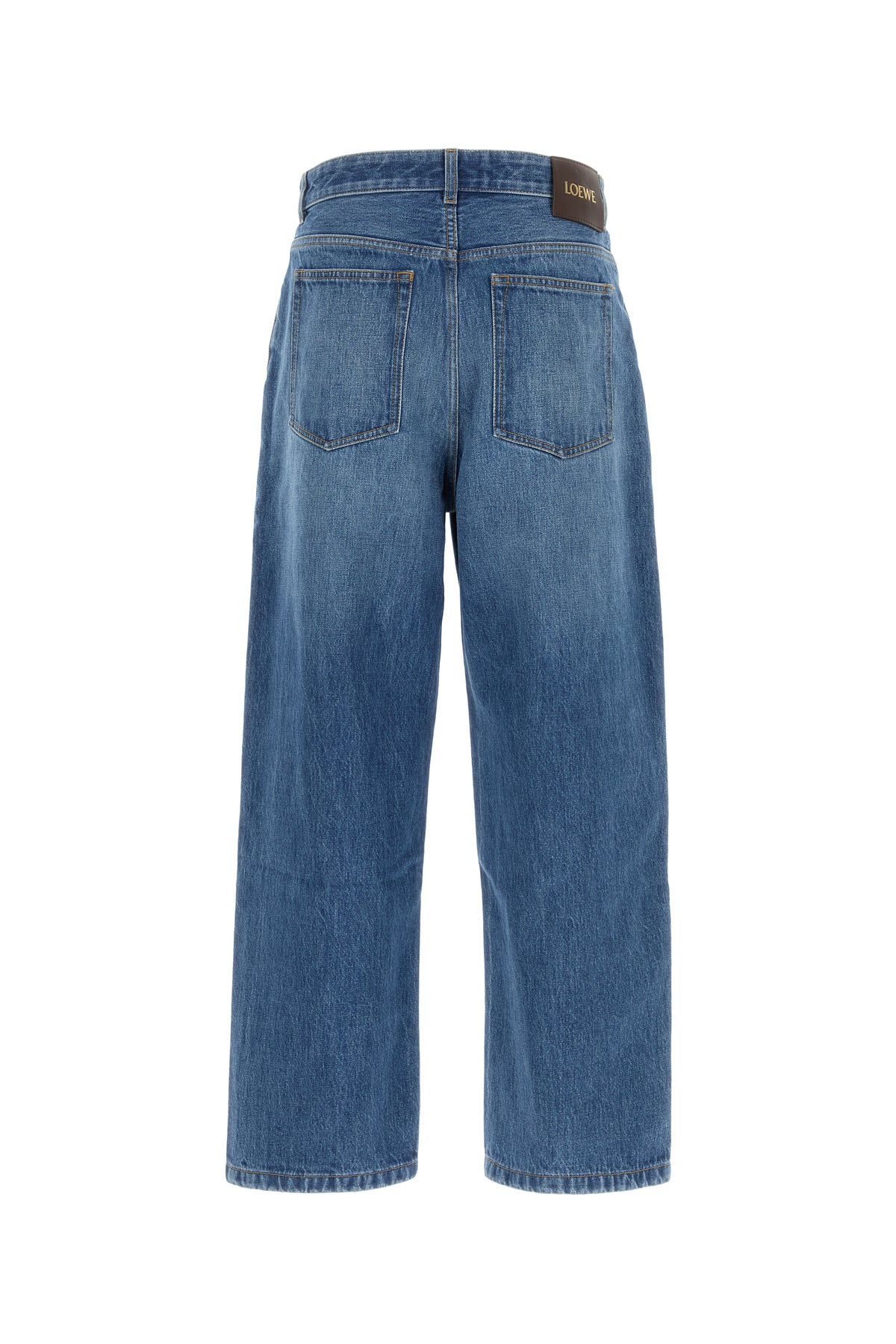 Wide-leg jeans realized in slightly stonewashed pure cotton denim enriched by leather LOEWE label at the back.