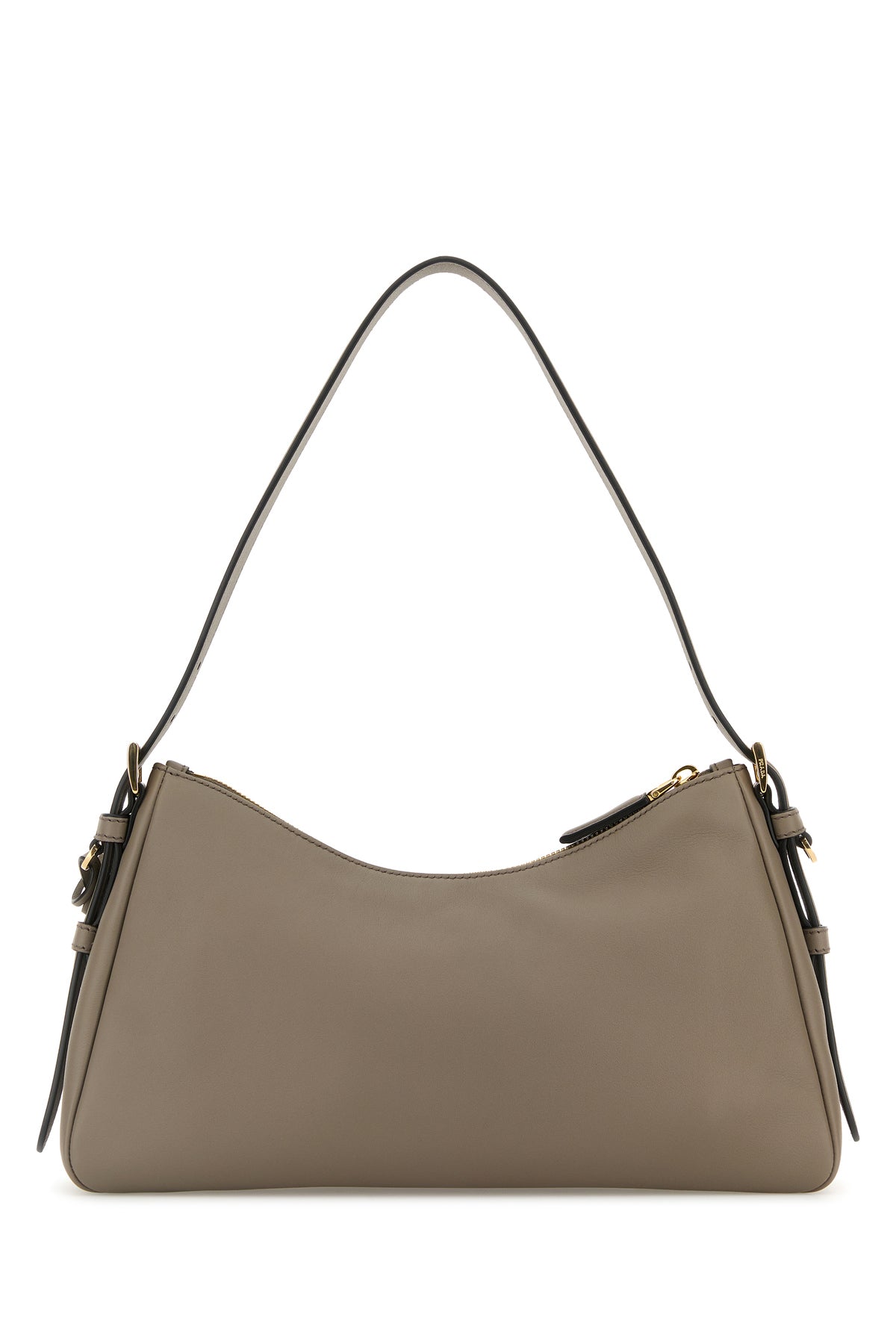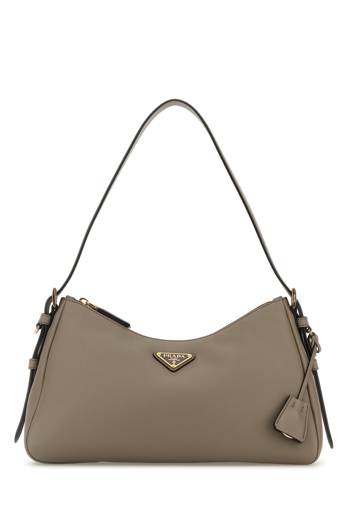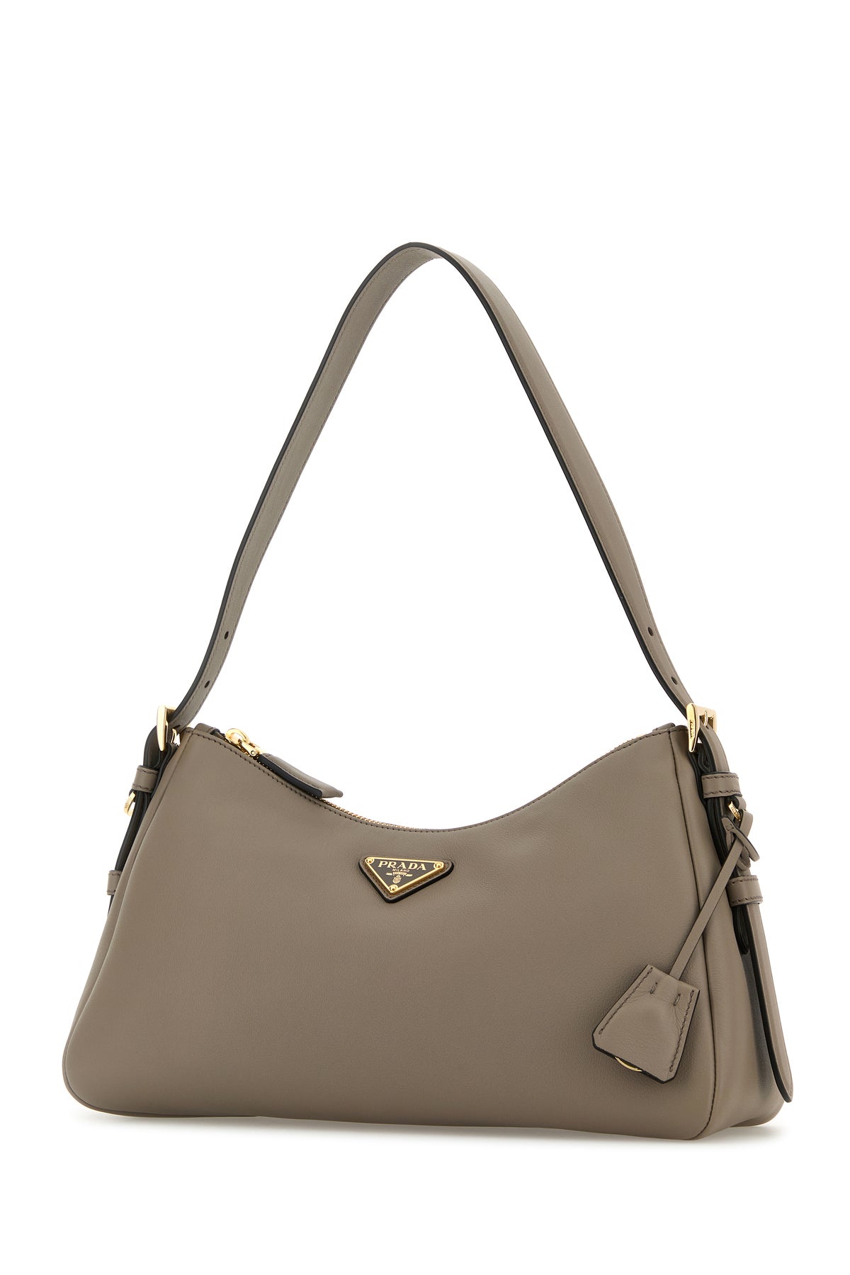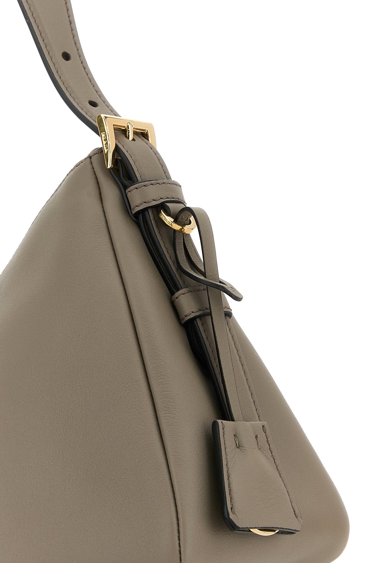 Shoulder bag realized in smooth leather enriched by iconic metal logoed triangle at the front and detachable tonal leather keyring accessory on the side.