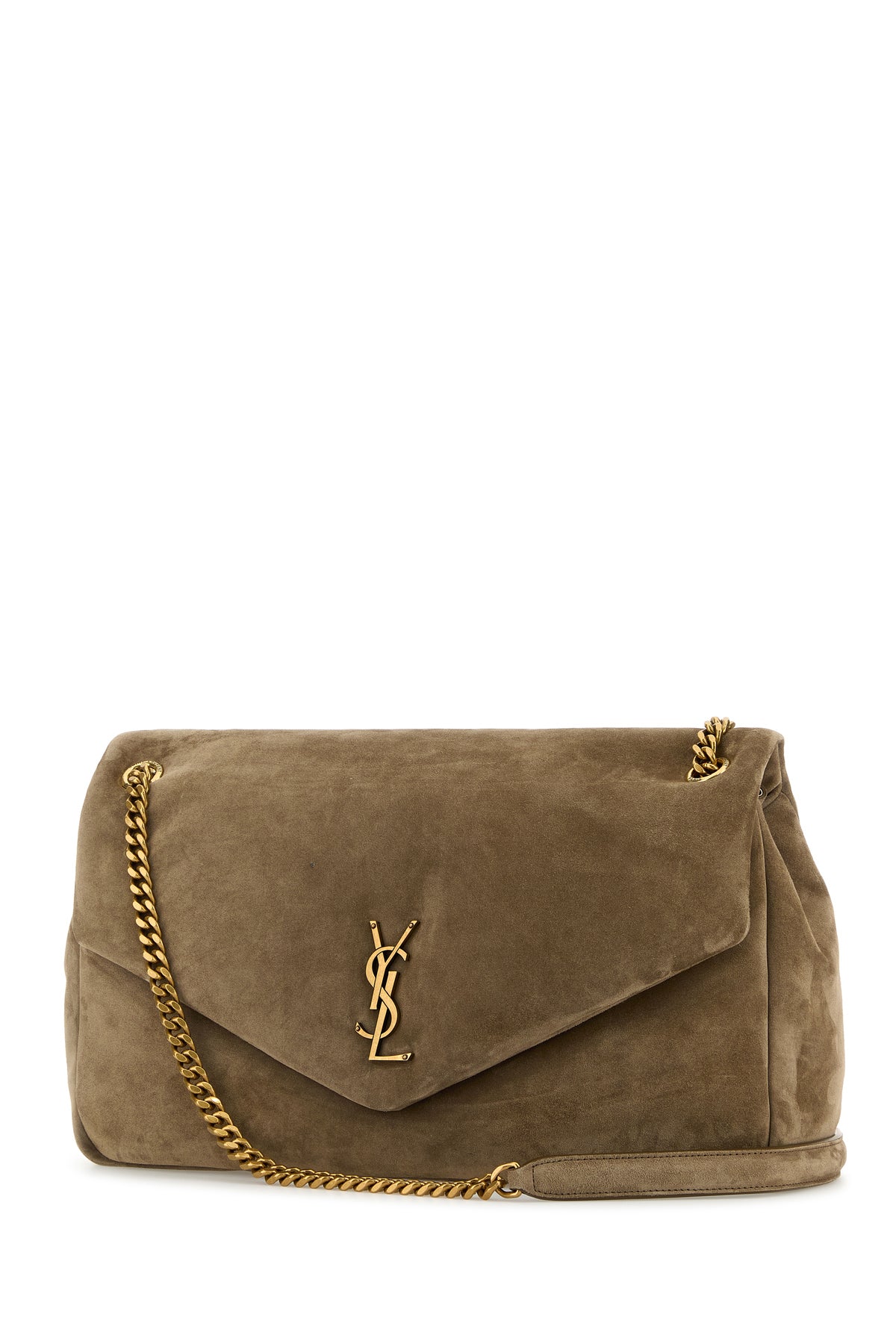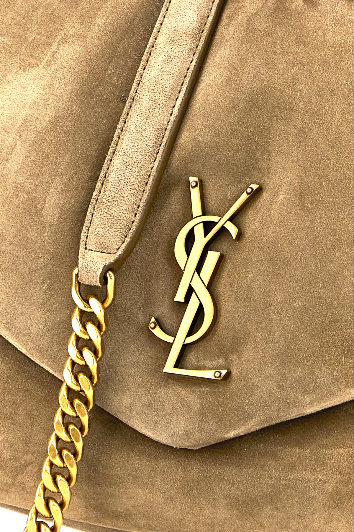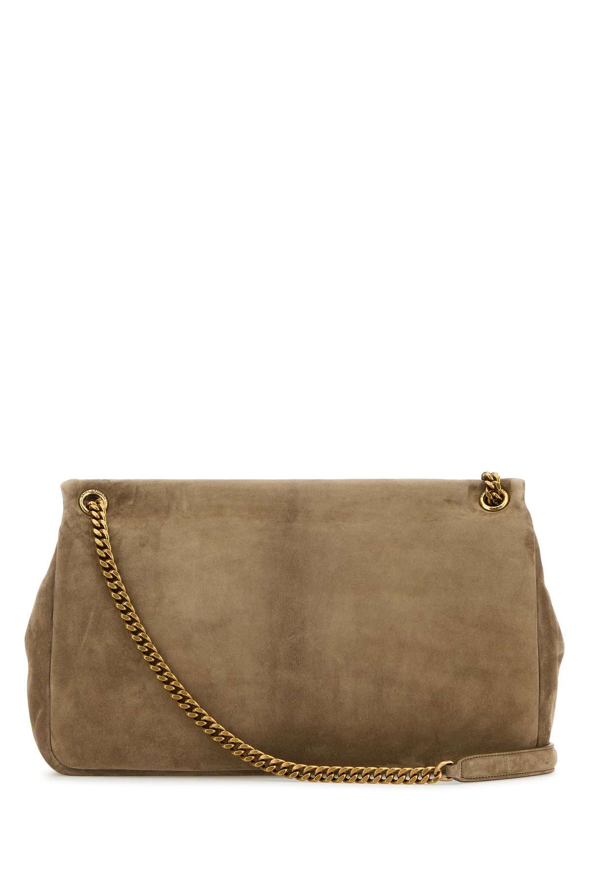 Shoulder bag realized in suede enriched by iconic Monogram metal detail at the front.