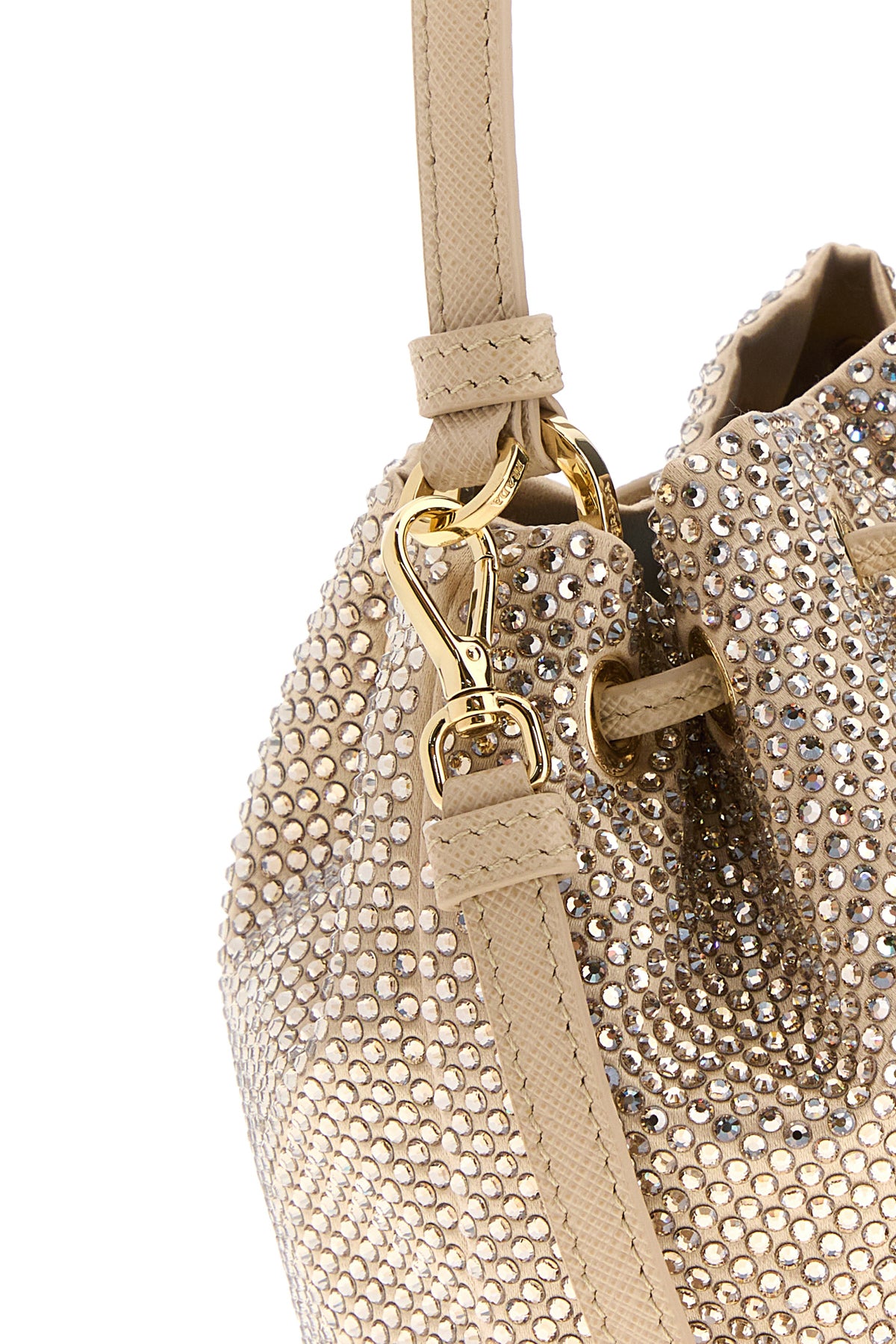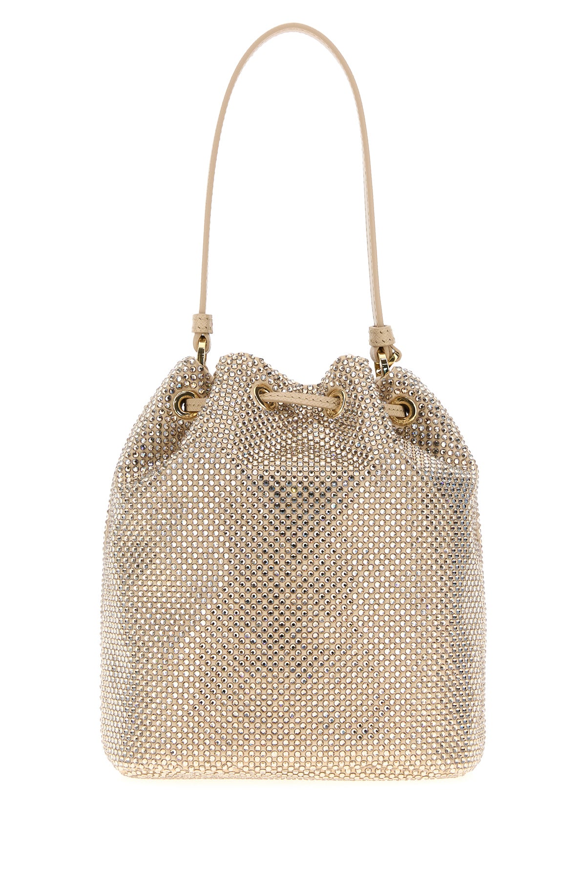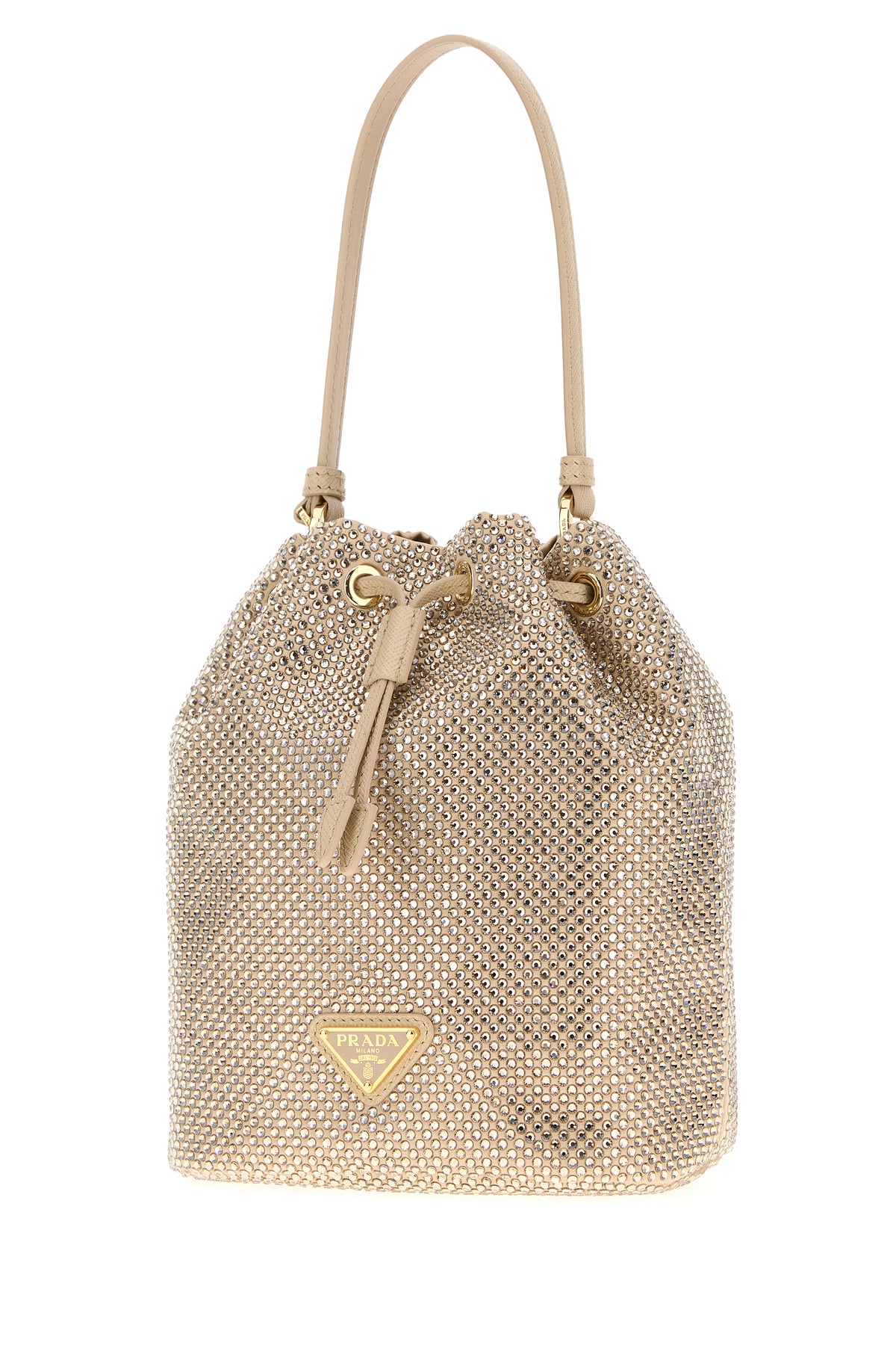 Bucket bag realized in nylon enriched by rhinestones on the entire surface and iconic metal logoed triangle at the front.