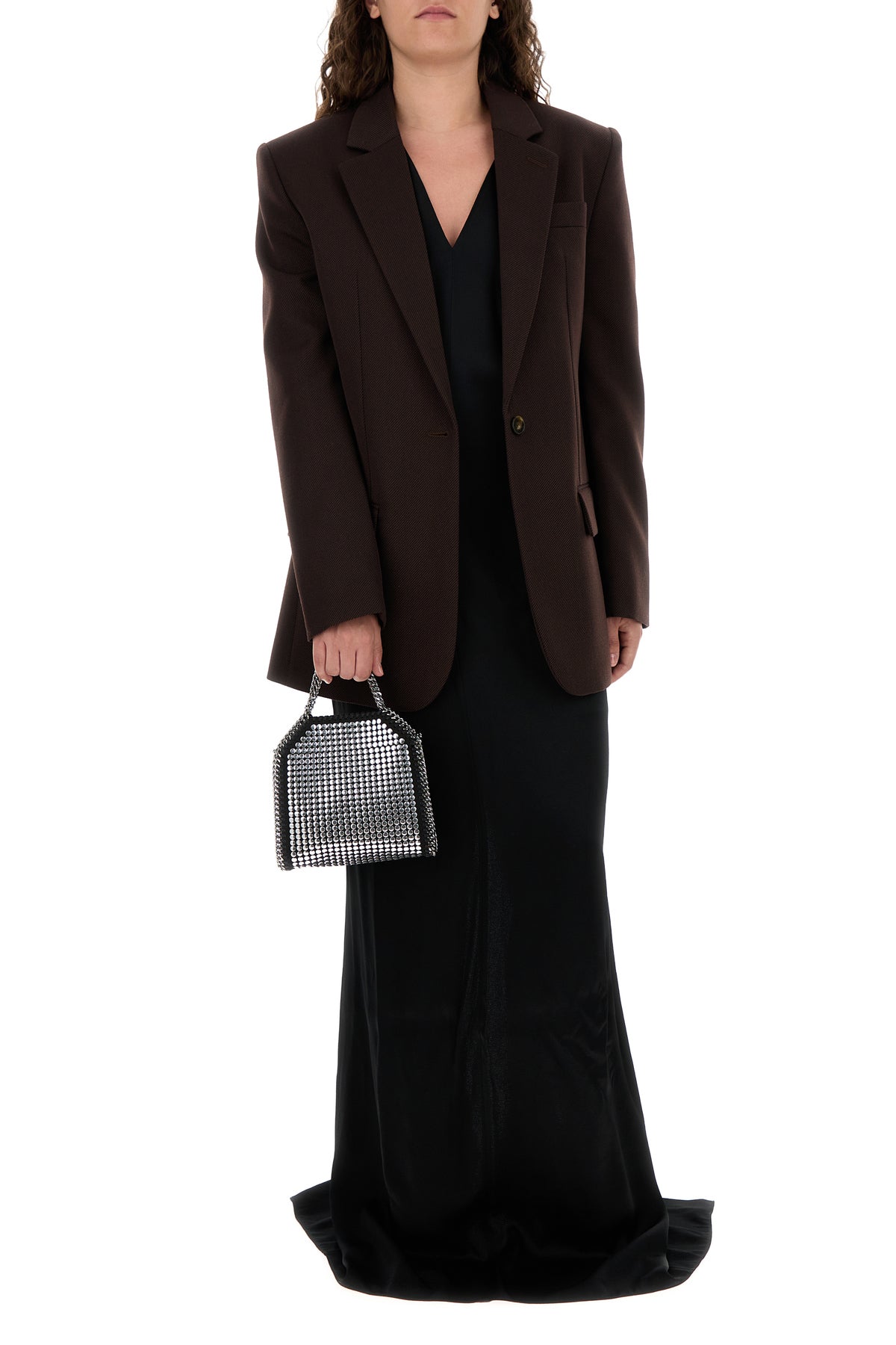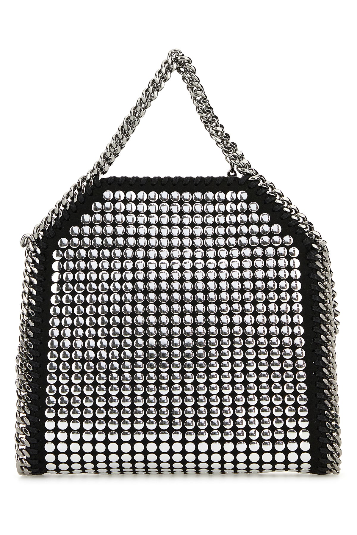 Handbag realized in shaggy deer characterized by metal chain trimmings enriched by metal studs on the entire surface.