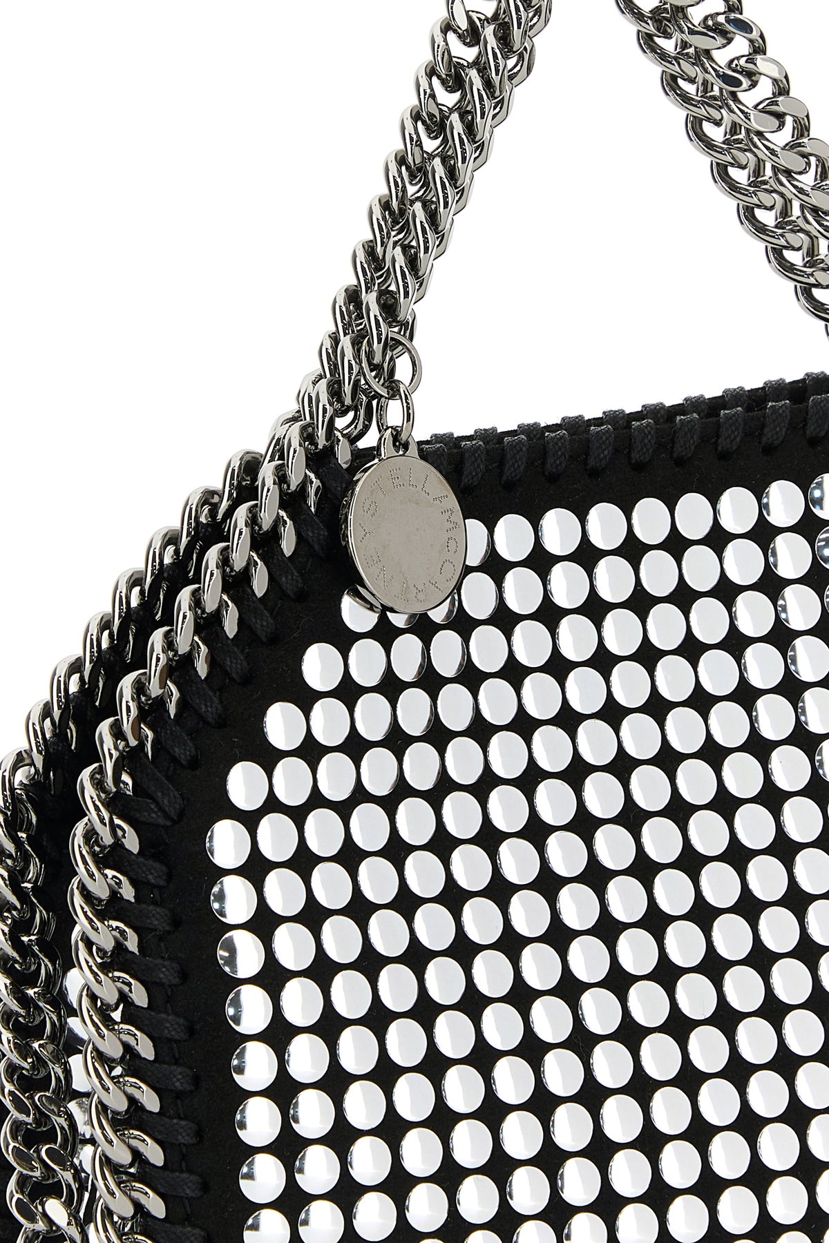 - Two metal chain handles with metal logoed charm