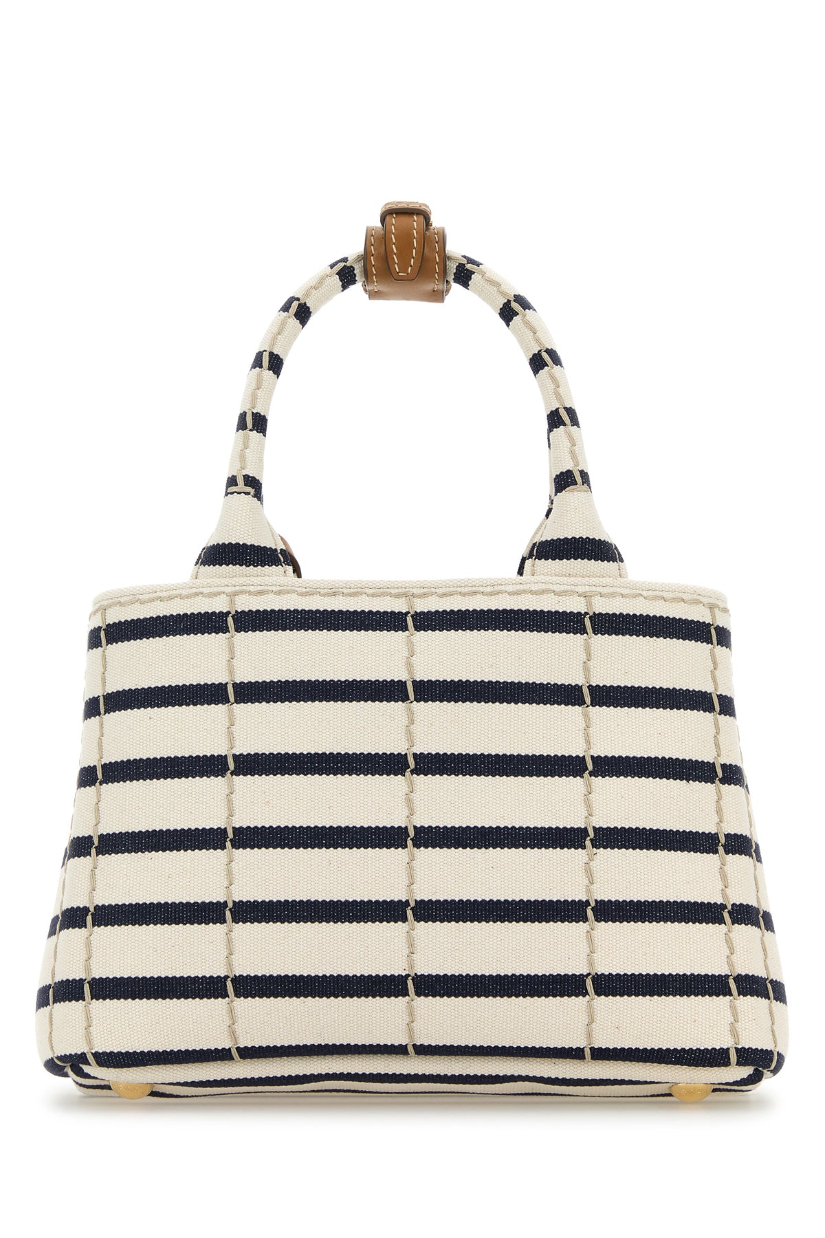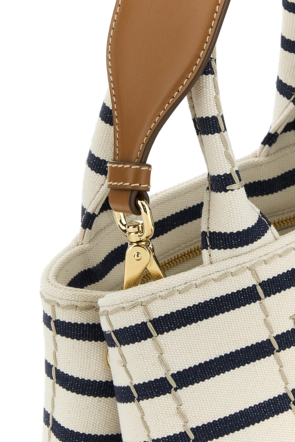 Handbag realized in canvas characterized by striped embroidery on the entire surface and embroidered logo at the front.