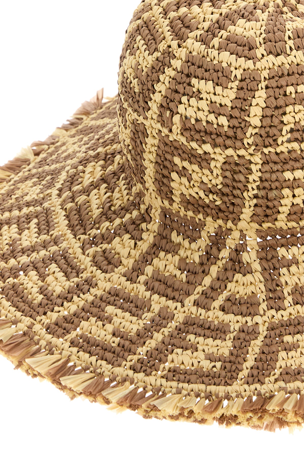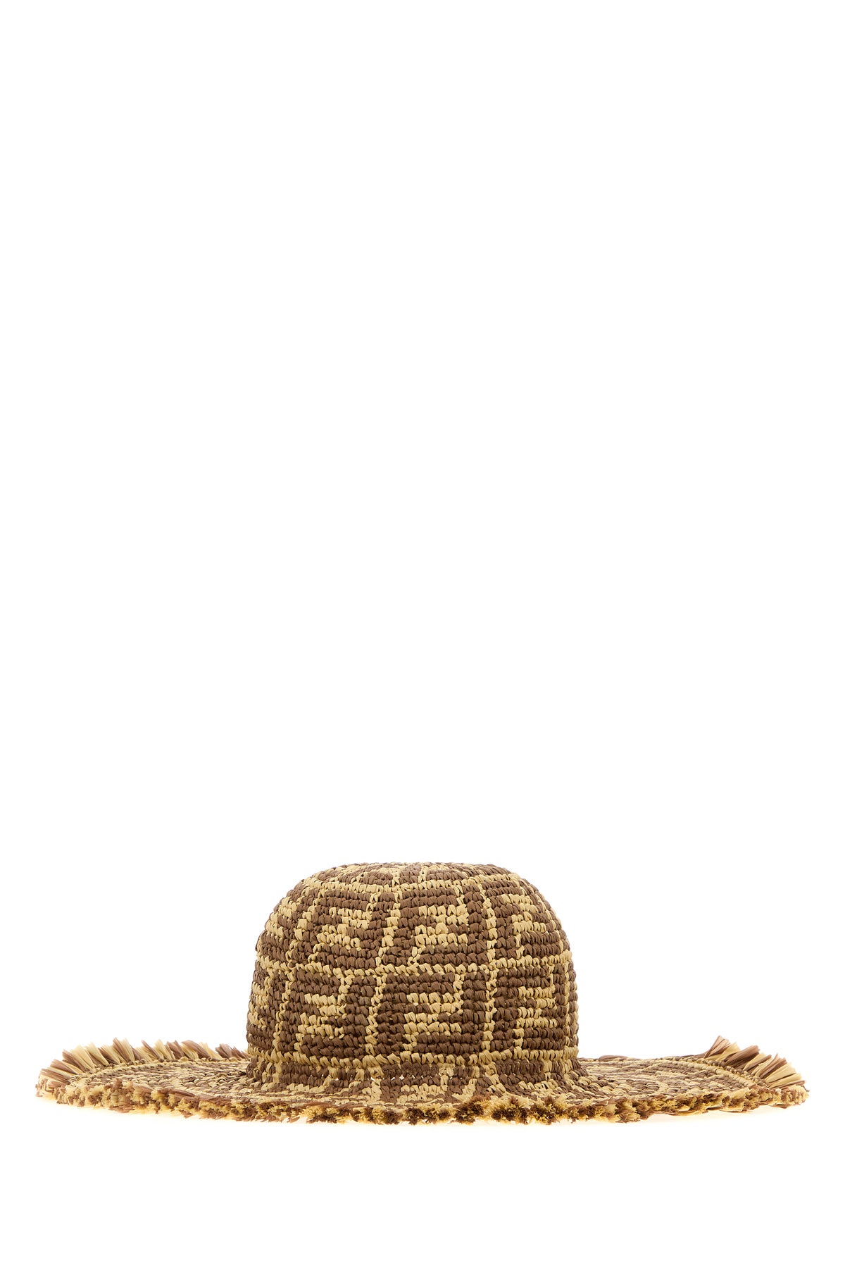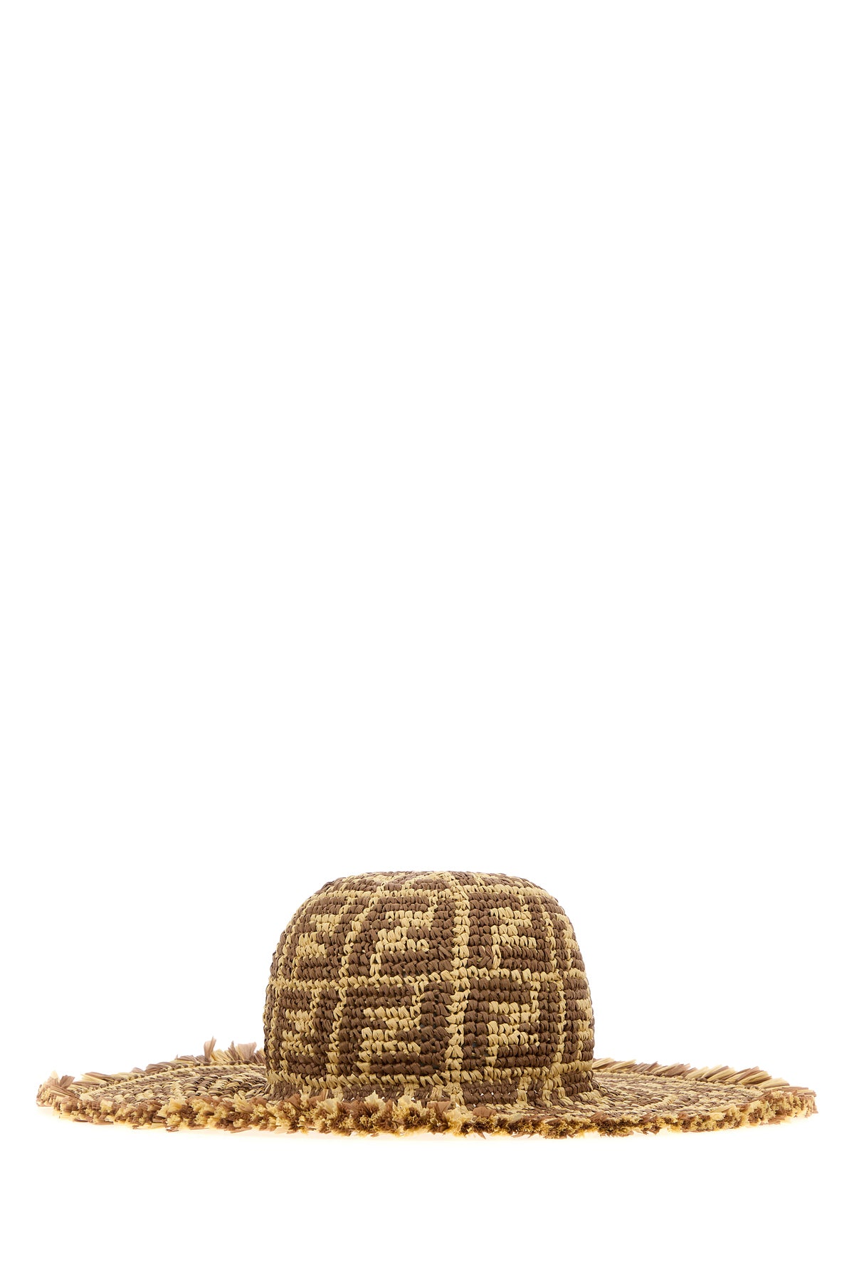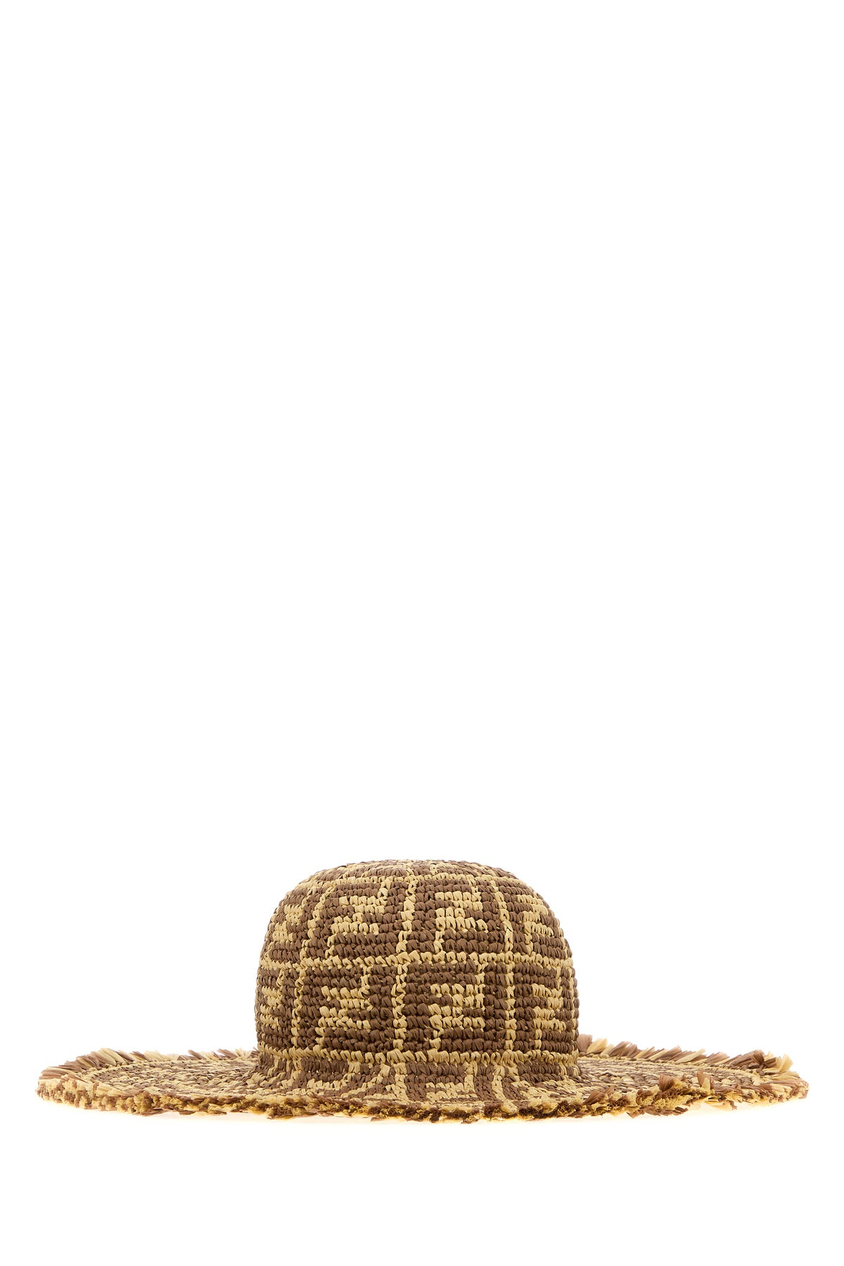 Hat realized in raffia characterized by FF embroidery on the entire surface.