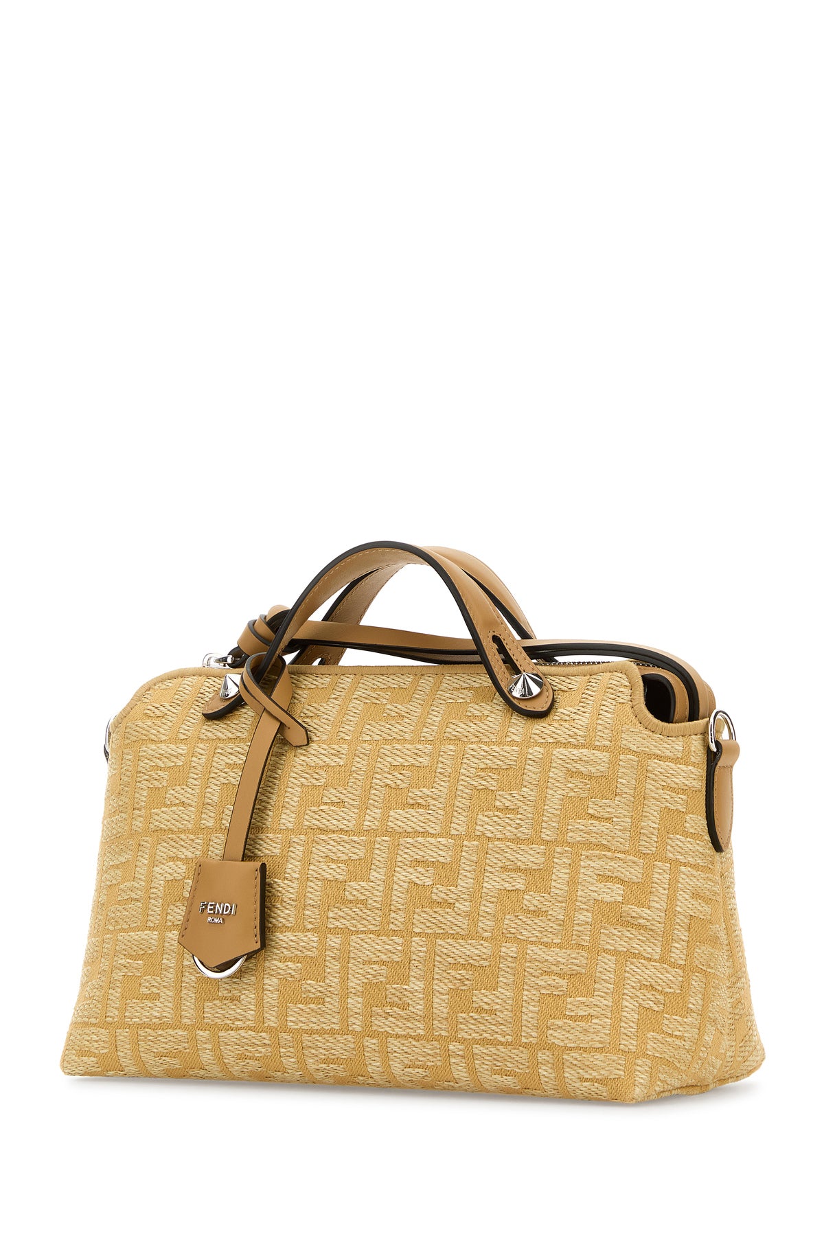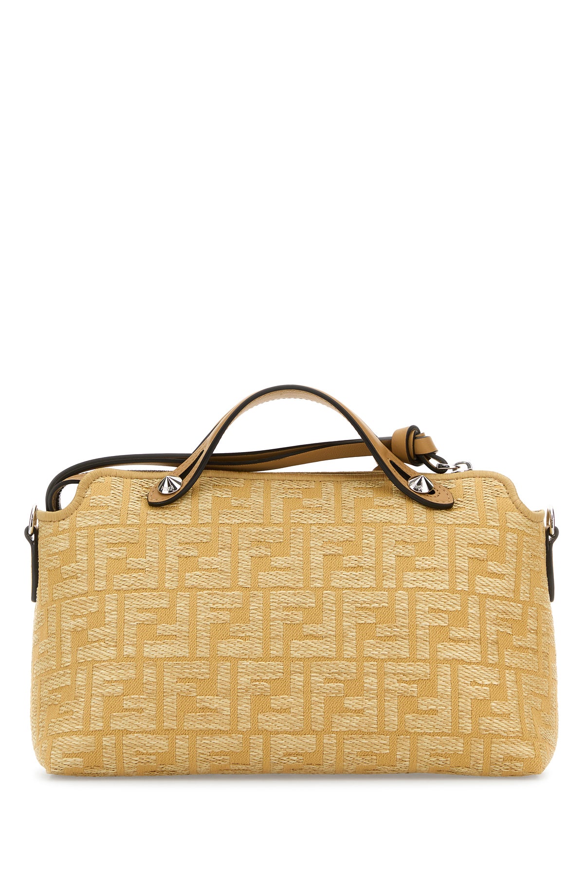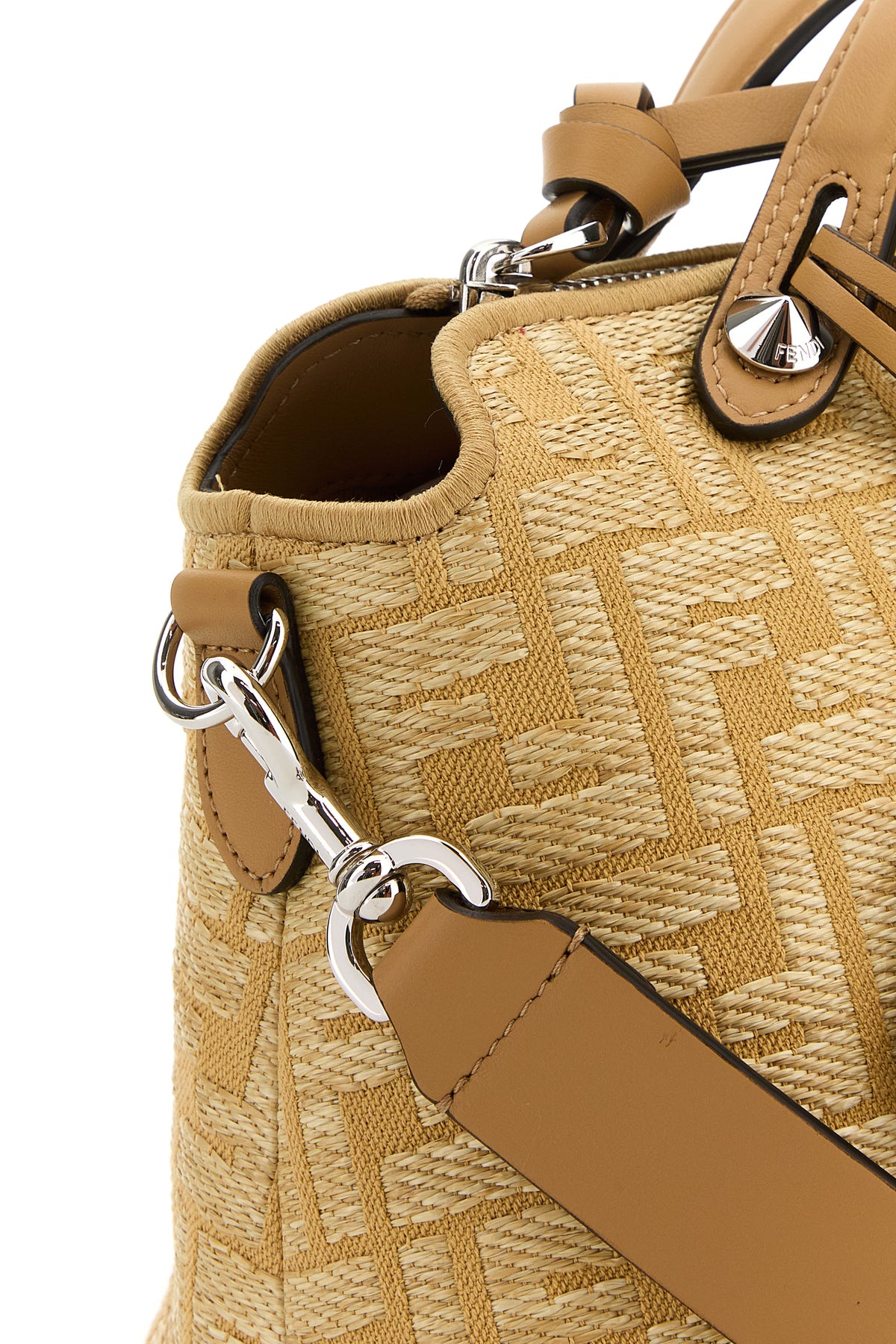 Handbag realized in raffia characterized by FF embroidery on the entire surface enriched by detachable tonal leather keyring accessory with metal lettering logo.