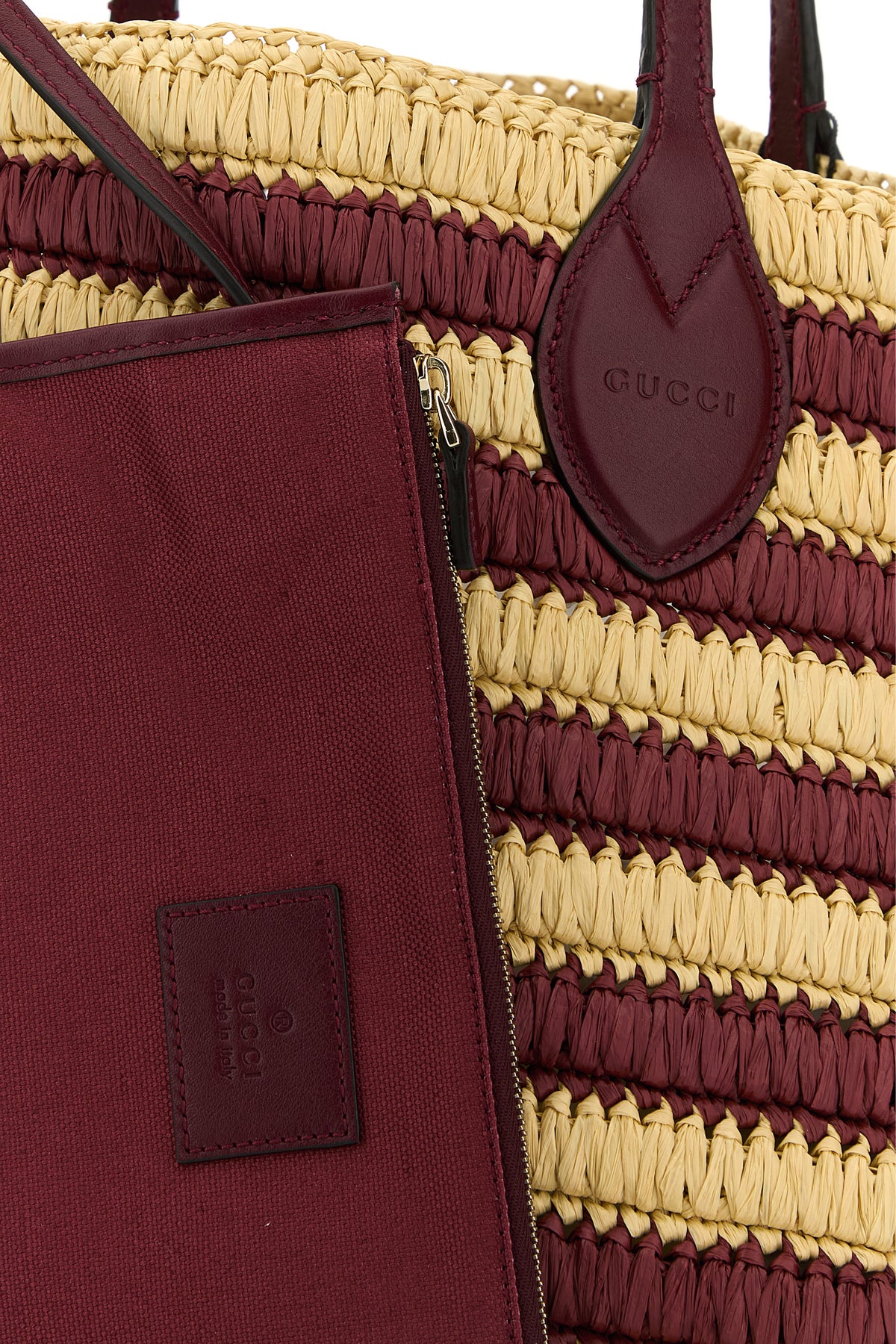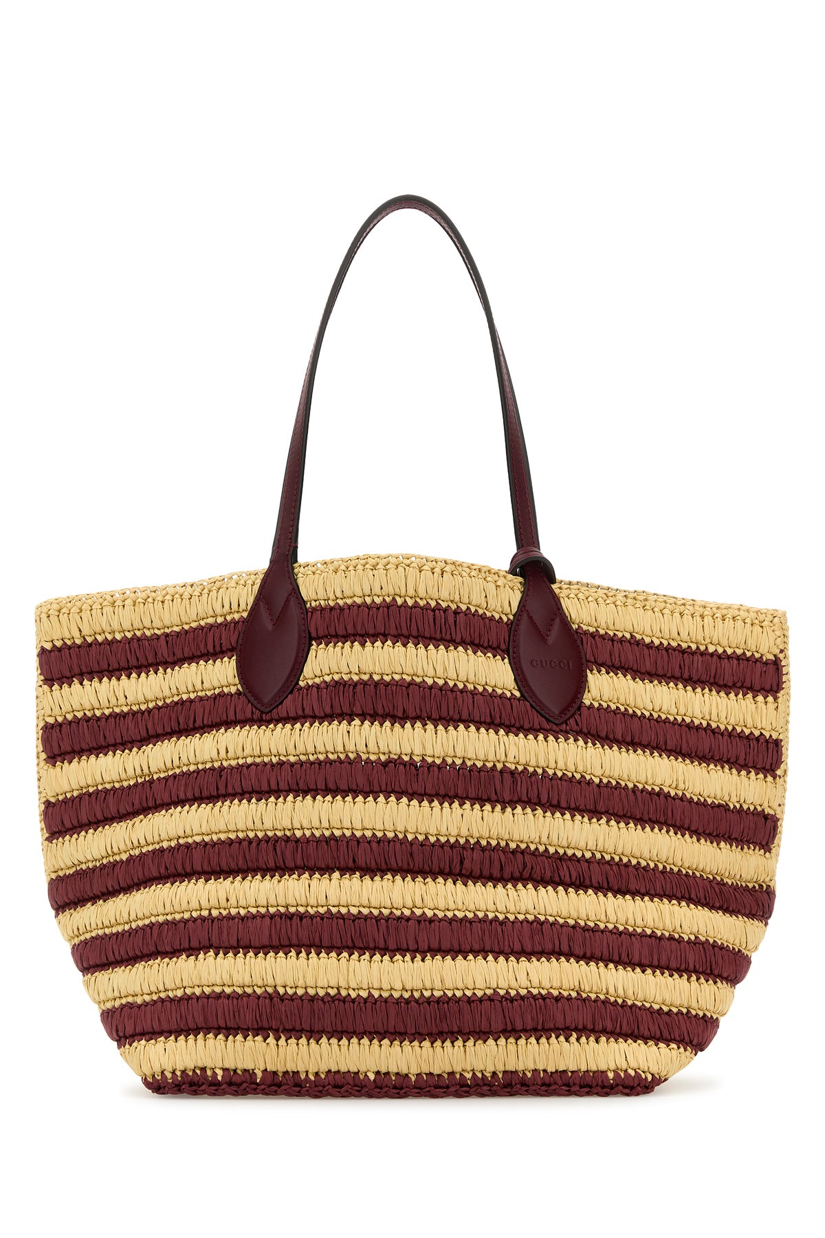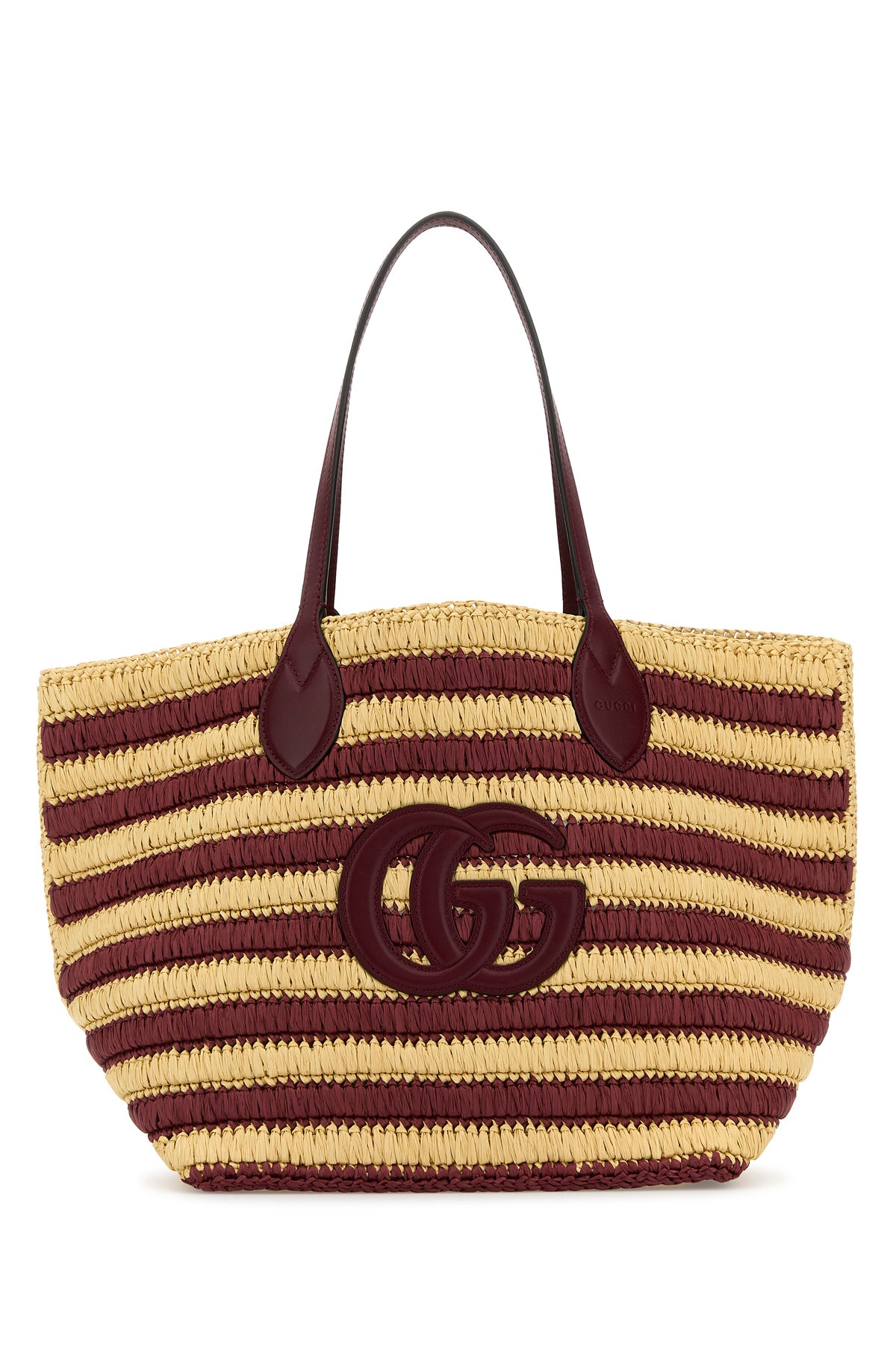 Shopping bag realized in raffia characterized by striped embroidery on the entire surface enriched by GG patch at the front.