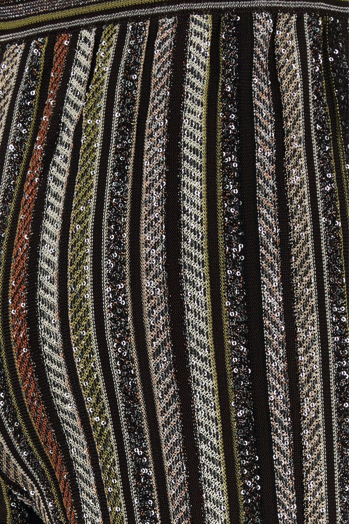 Flared leg pant realized in stretch viscose blend characterized by striped embroidery enriched by sequins on the entire surface.