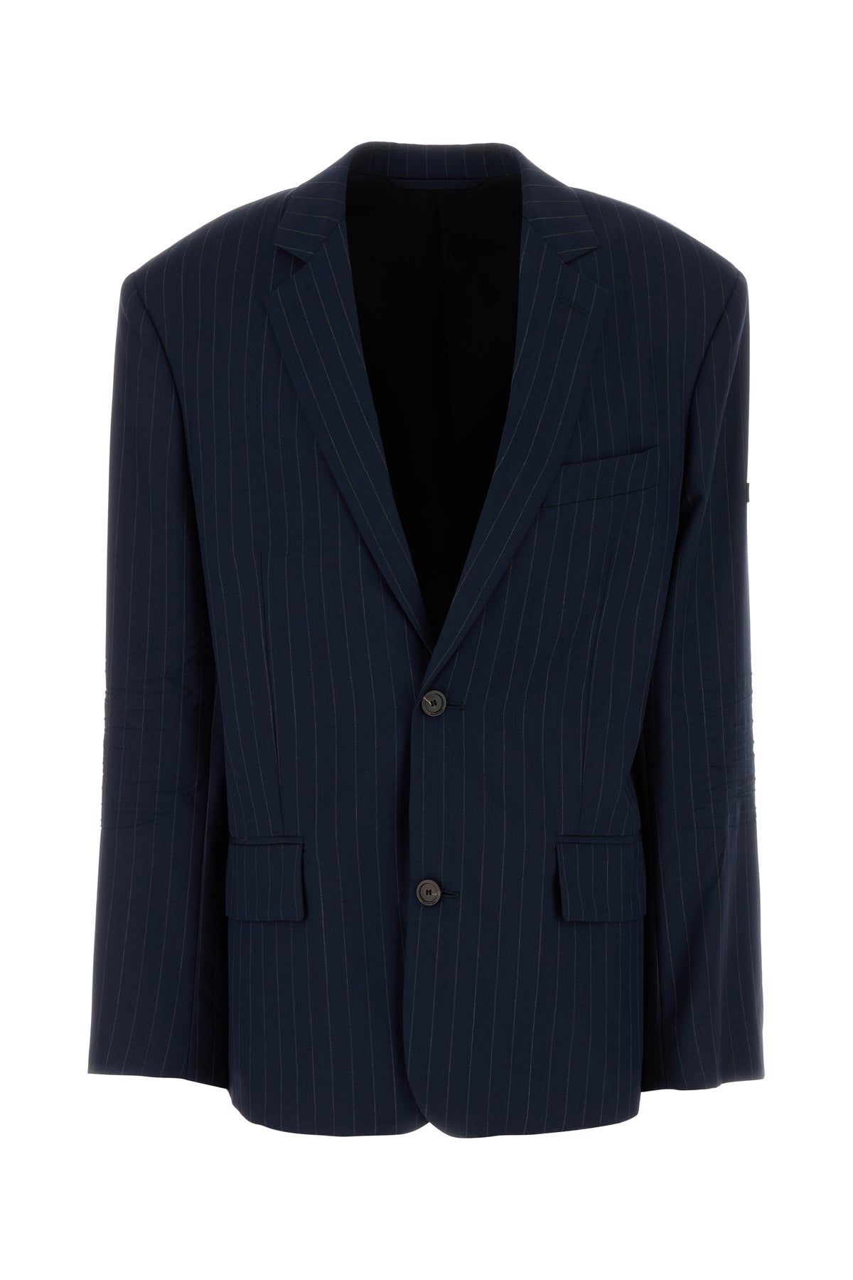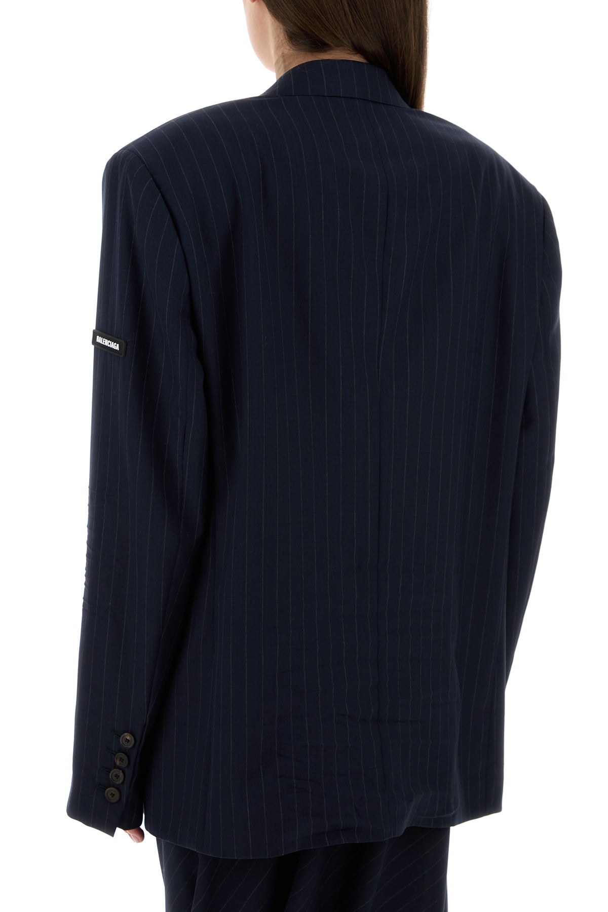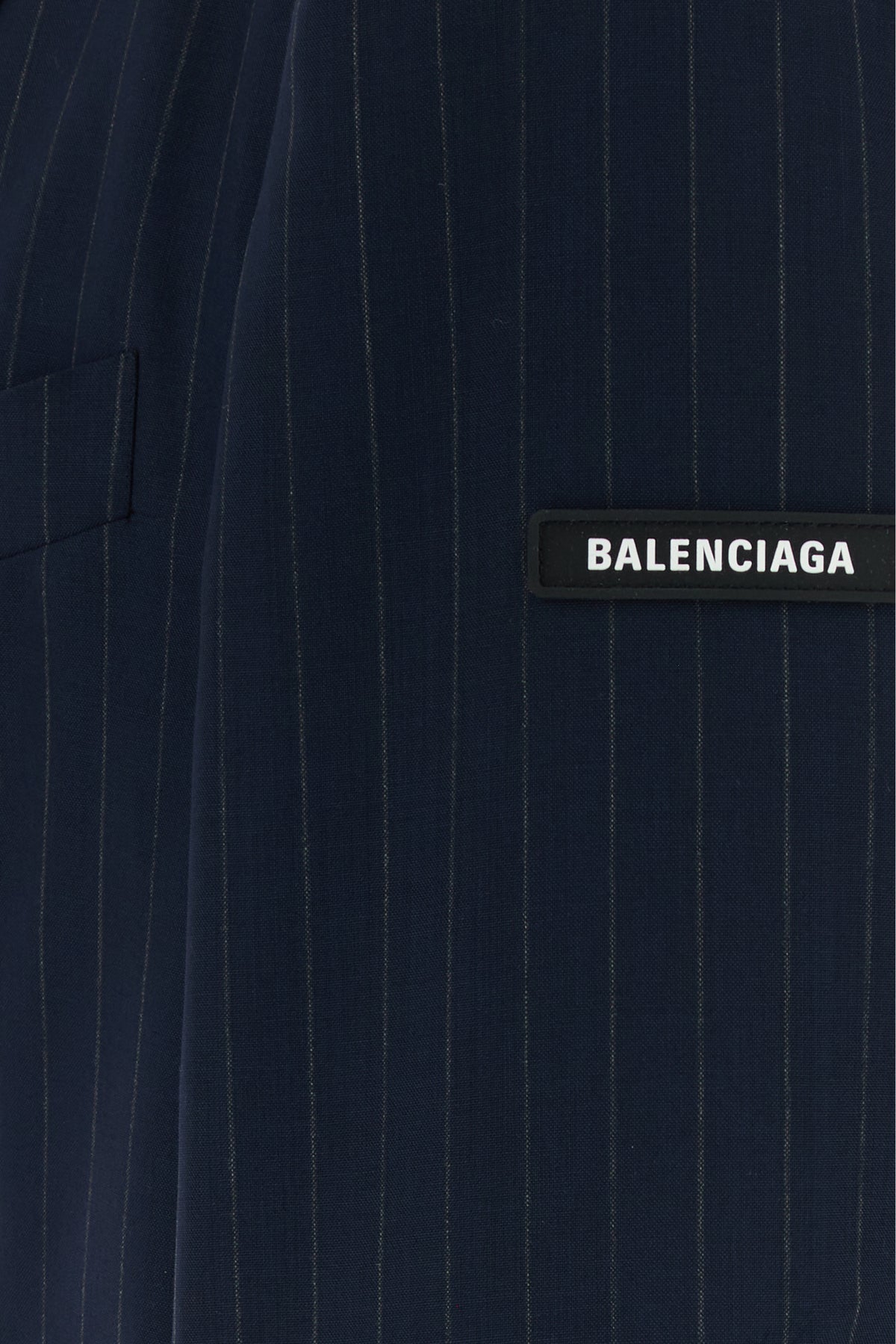 Blazer realized in pure wool characterized by pin-striped embroidery on the entire surface enriched by rubbered Balenciaga patch on the sleeve.