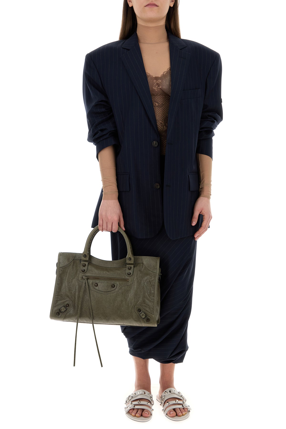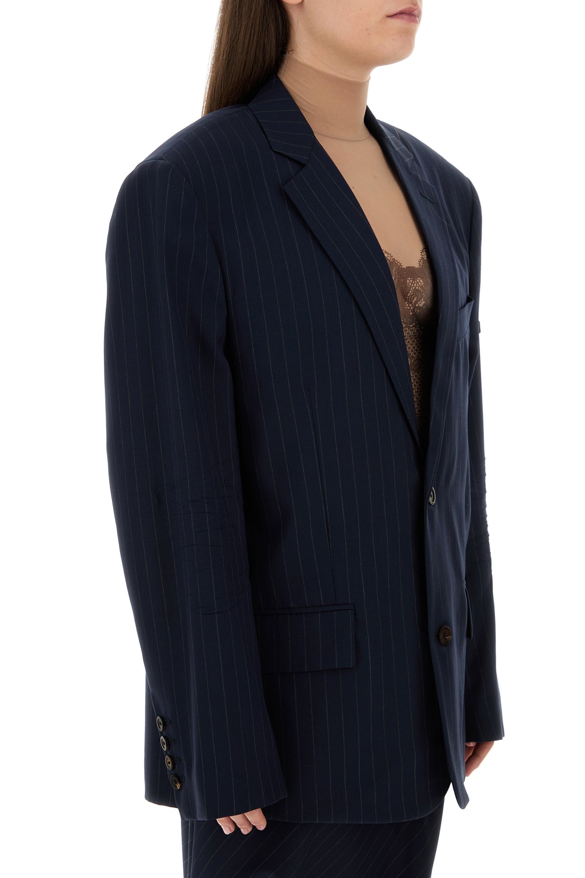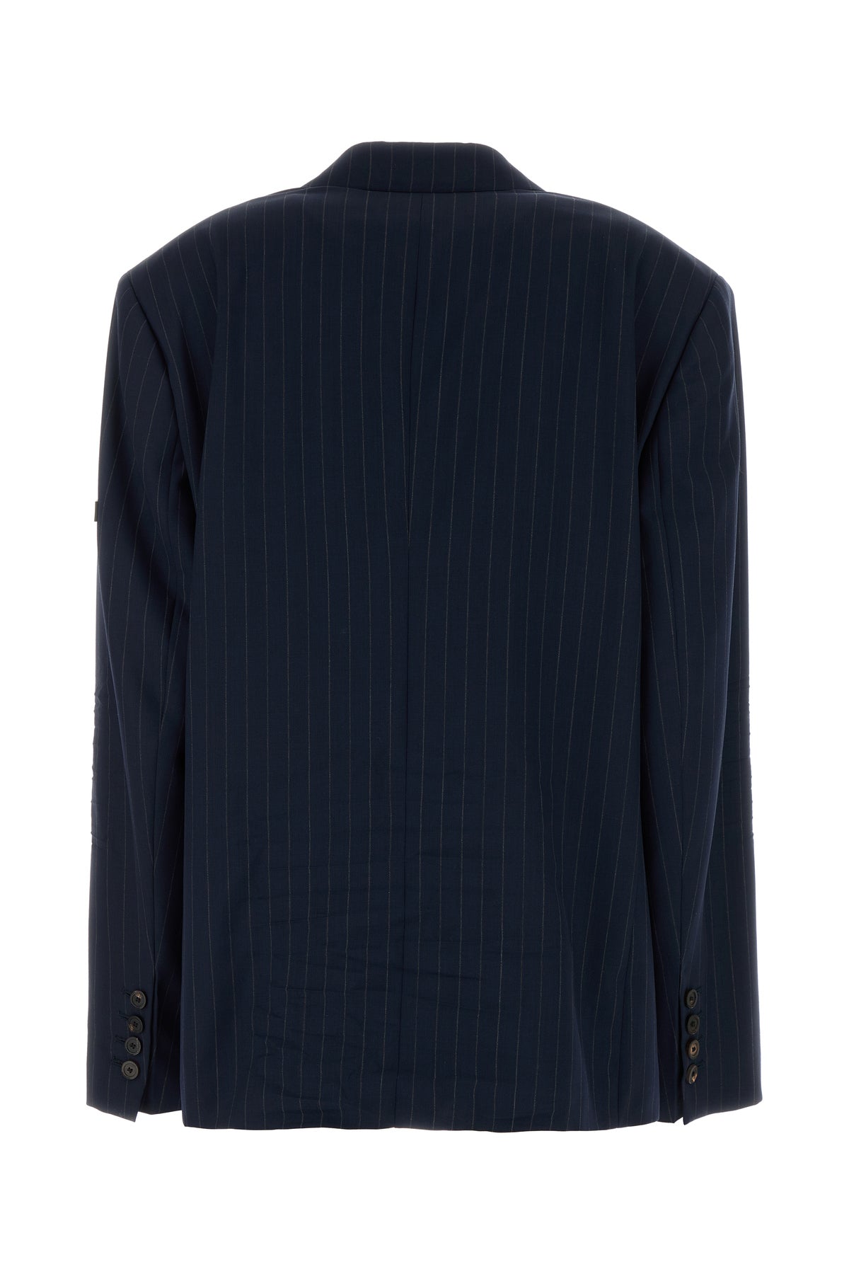 Blazer realized in pure wool characterized by pin-striped embroidery on the entire surface enriched by rubbered Balenciaga patch on the sleeve.