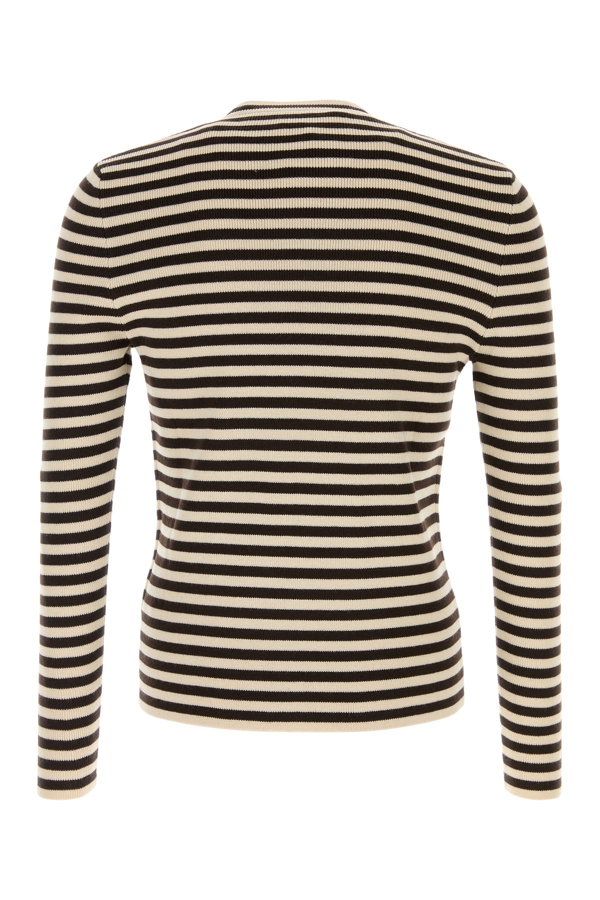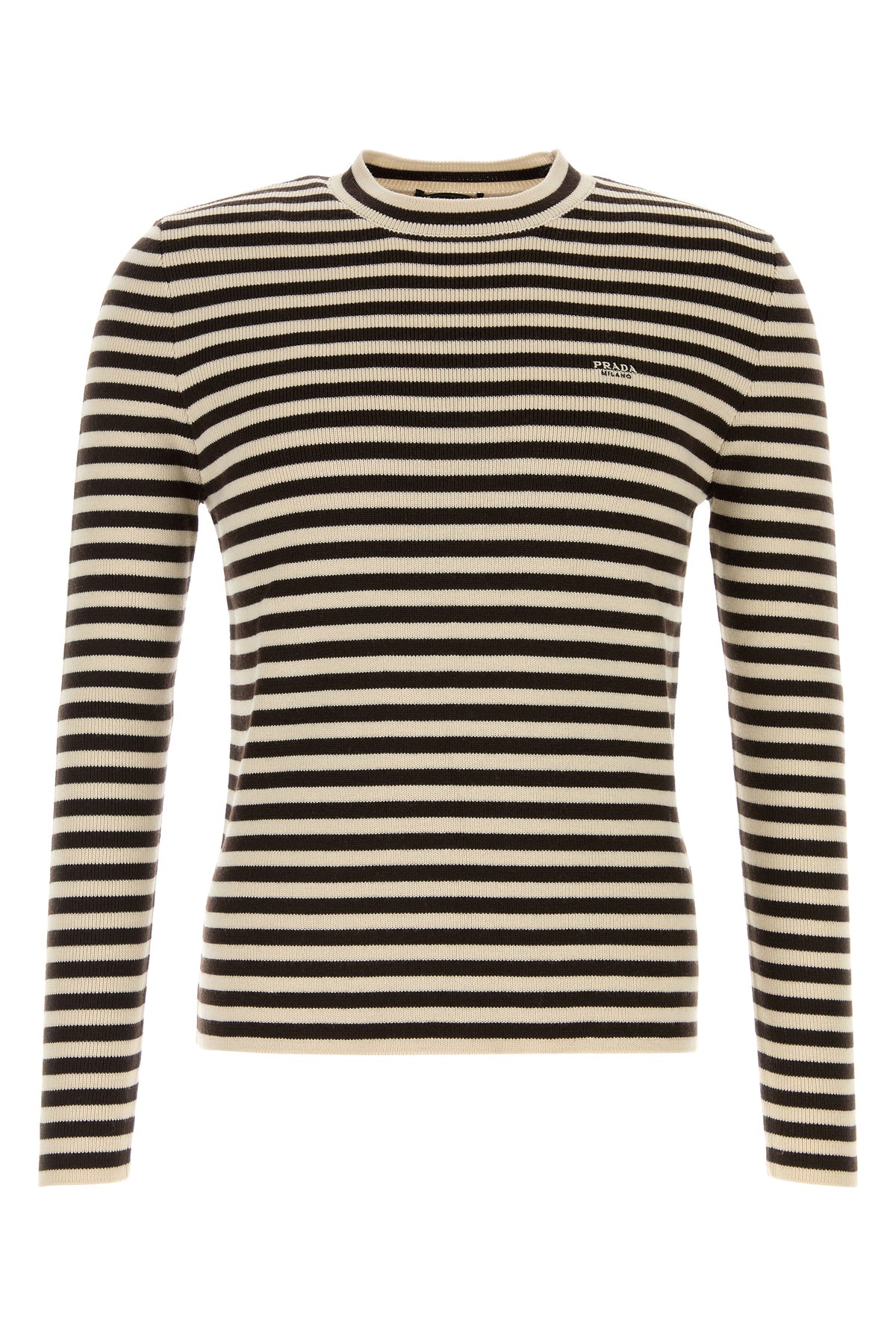Sweater realized in pure virgin wool characterized by striped embroidery on the entire surface and embroidered logo on the chest.