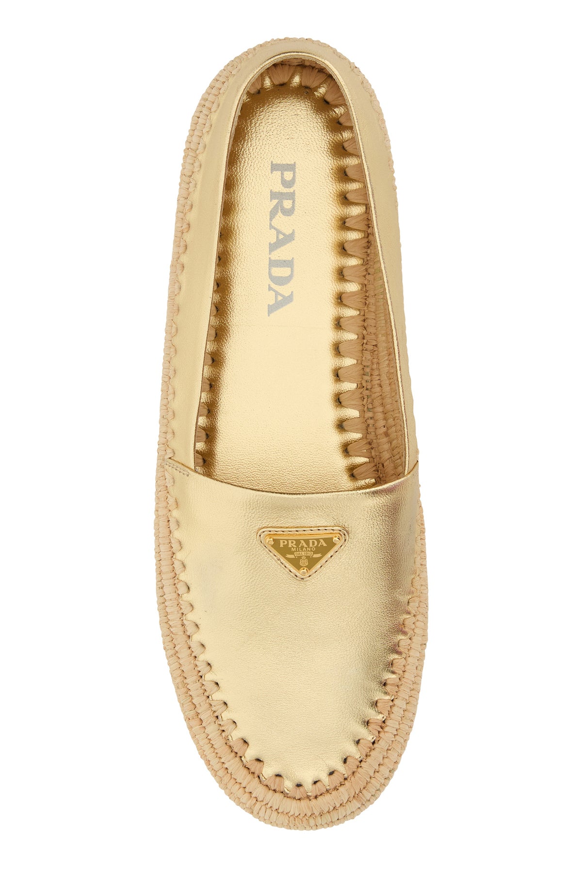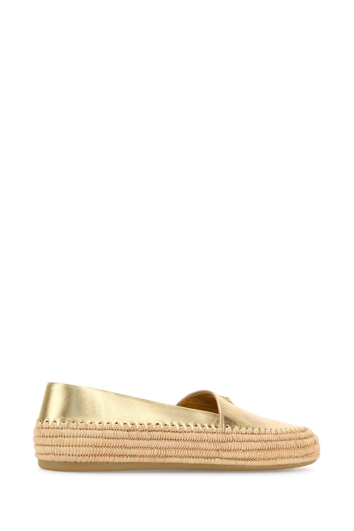 Espadrilles realized in laminated pebble leather enriched by by iconic logoed metal triangle on the instep.
