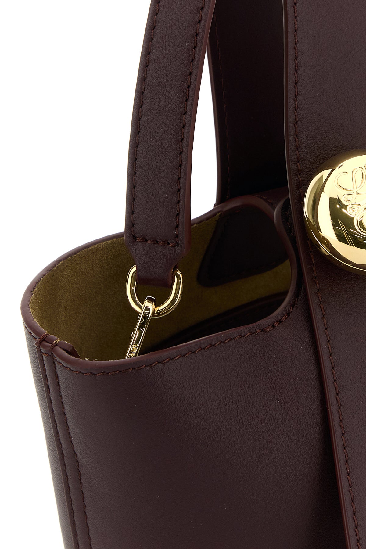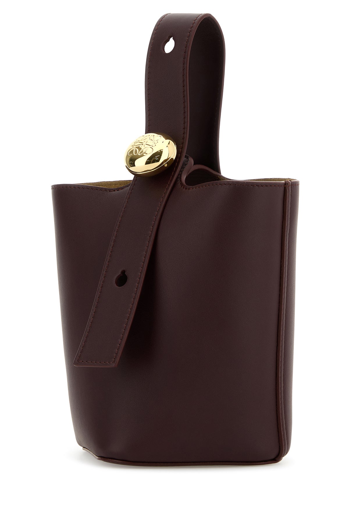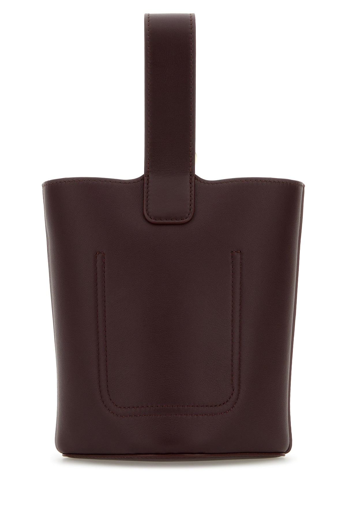 Bucket bag realized in slightly pebble calf leather enriched by metal Anagram detail at the front.