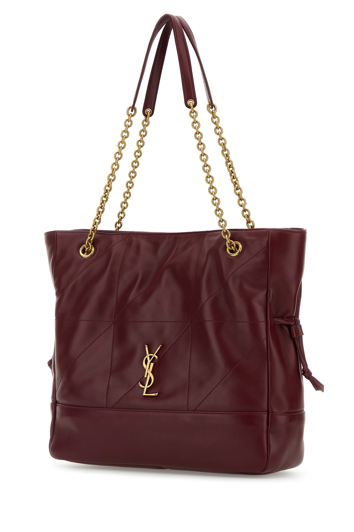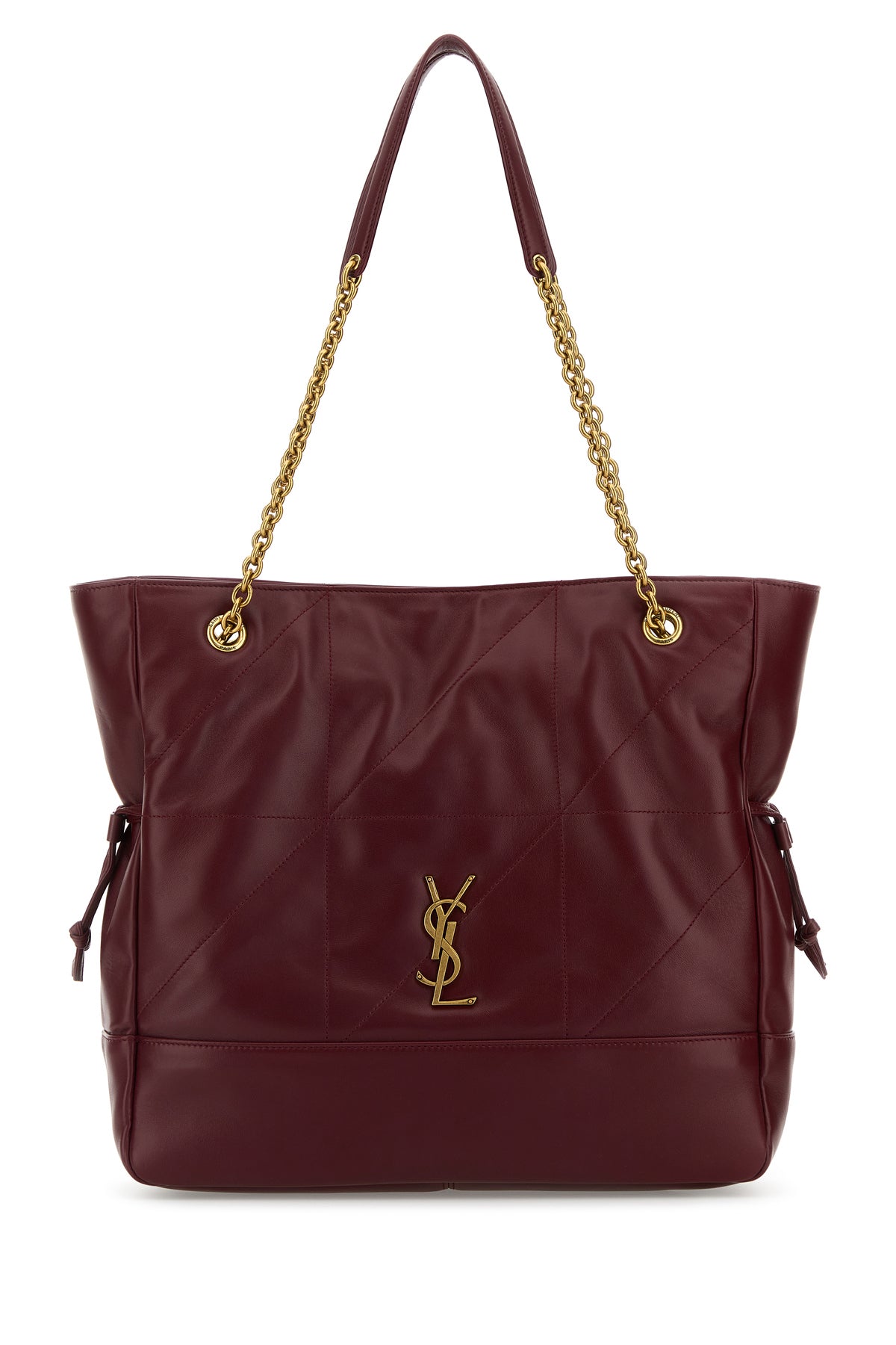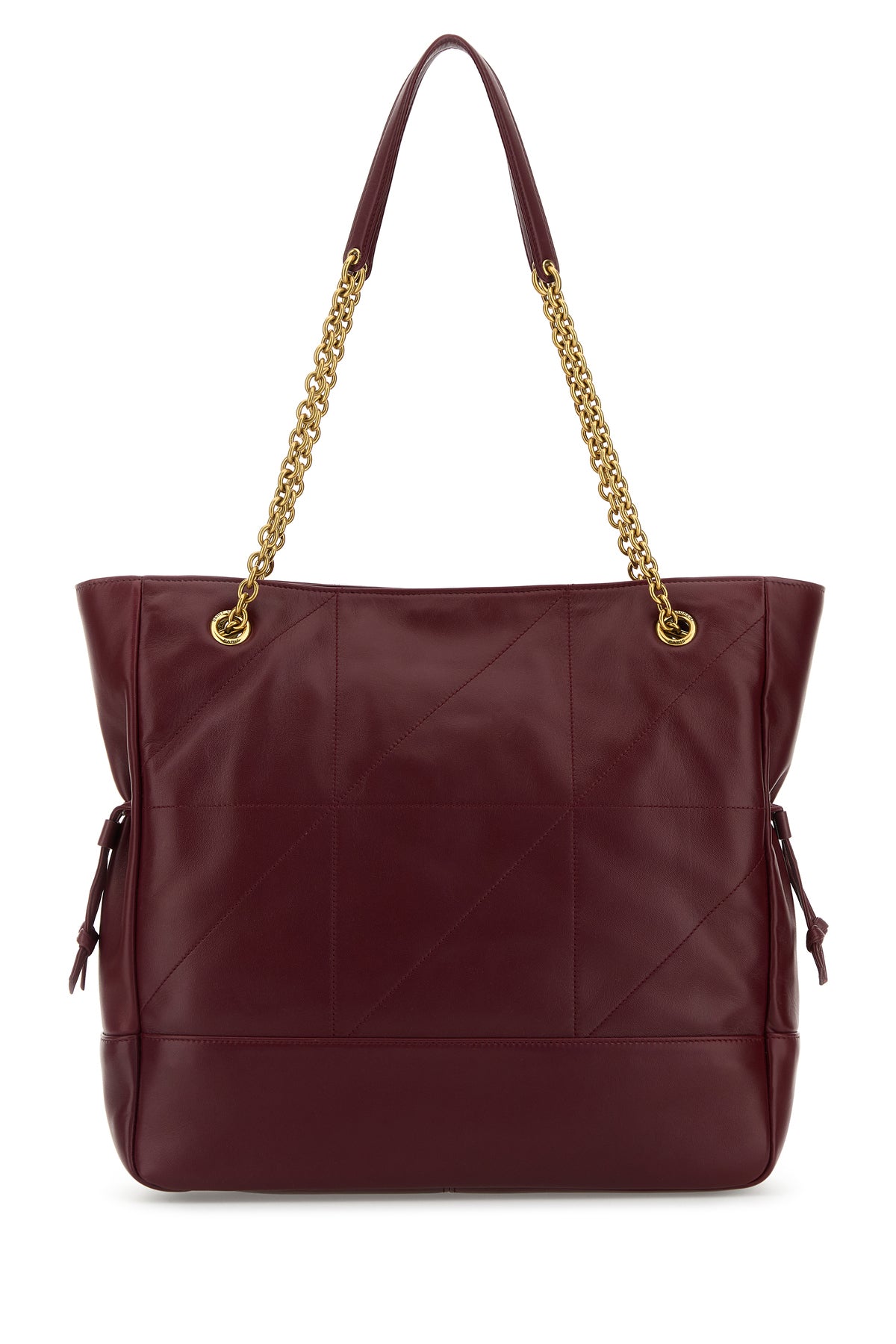 - Two metal chain handles with tonal leather shoulder pads
