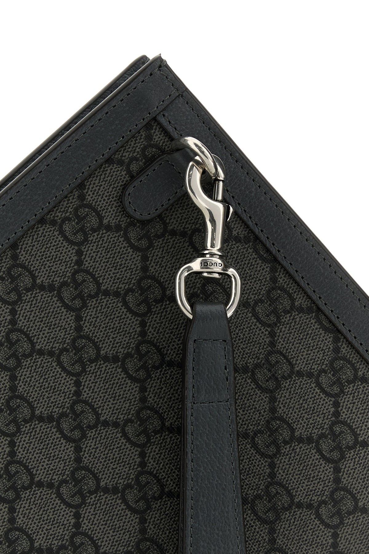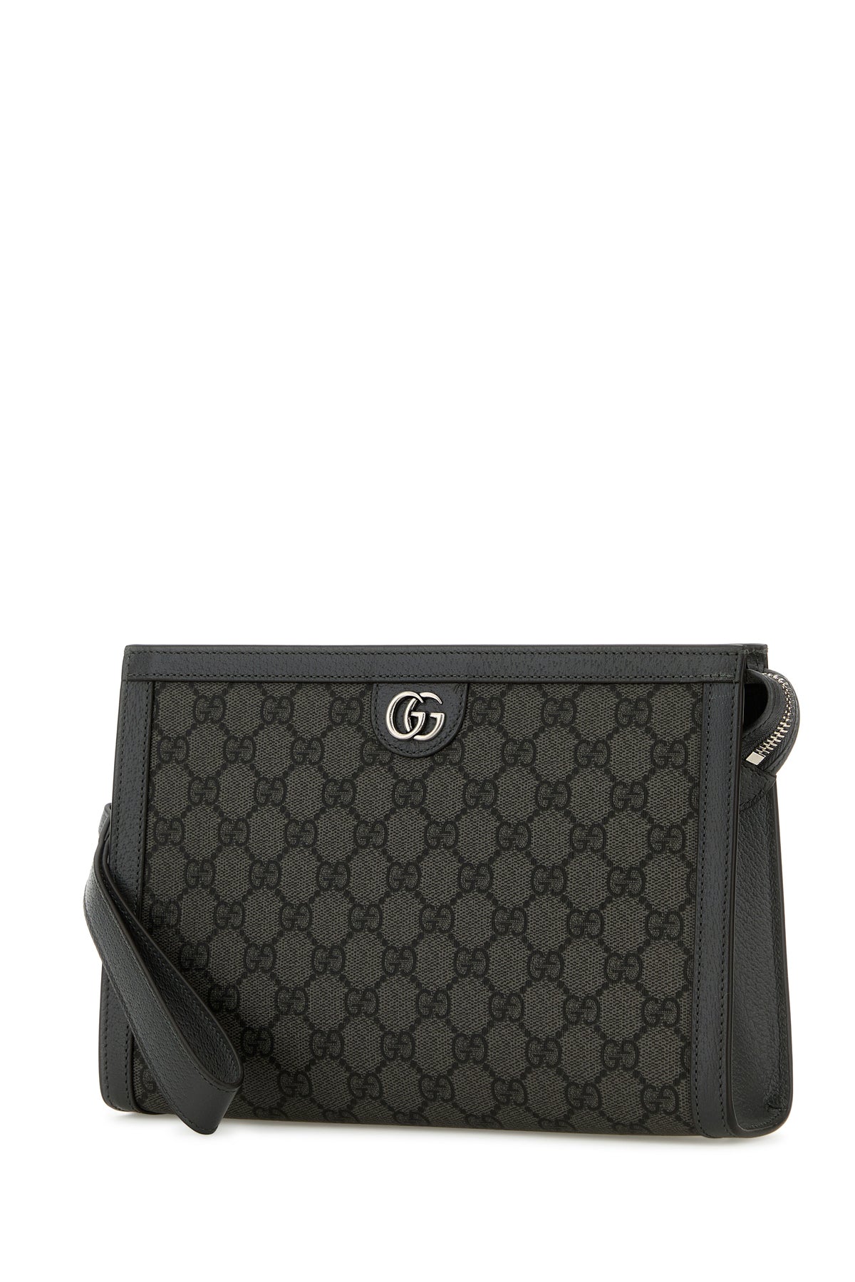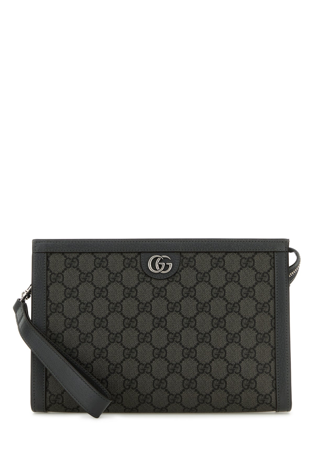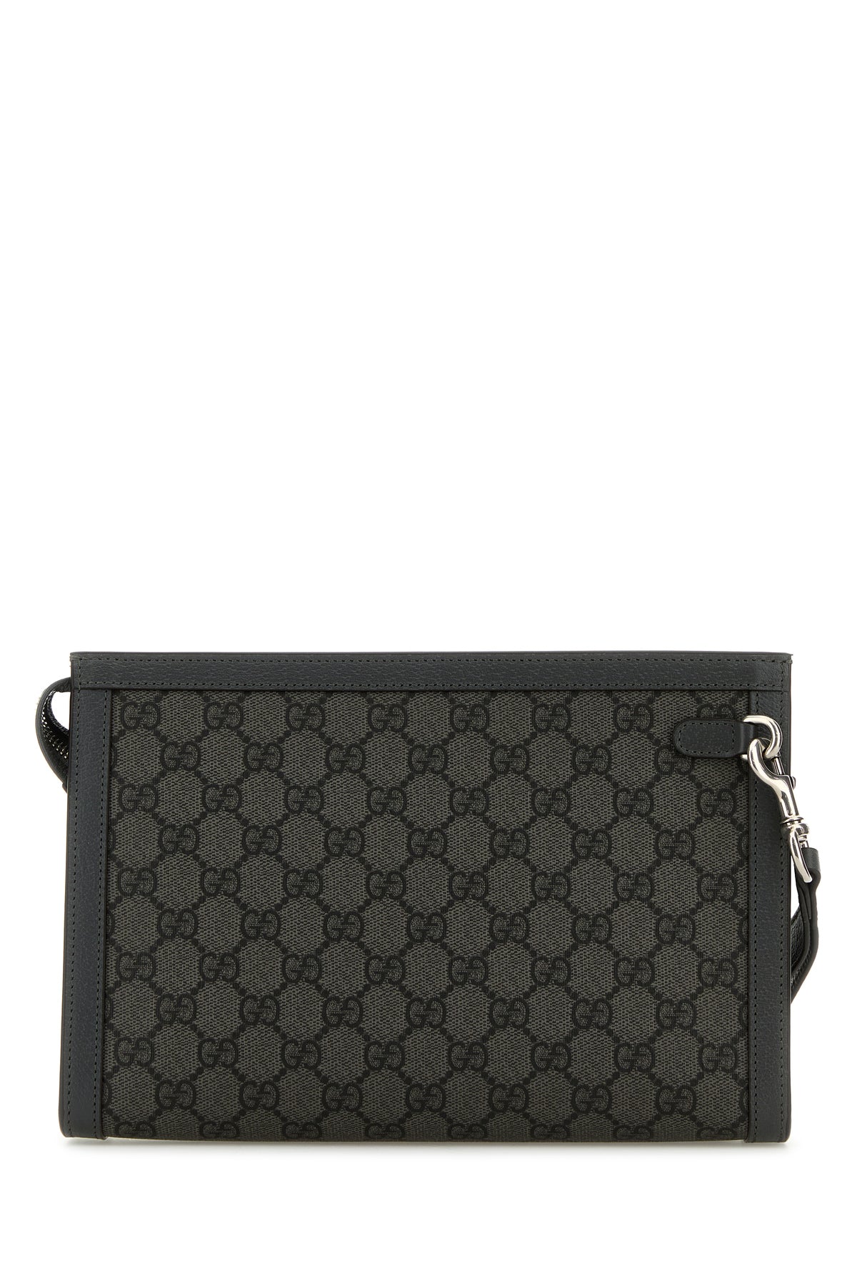 Clutch realized in GG Supreme fabric with pebble leather trimmings enriched by metal GG detail at the front.
