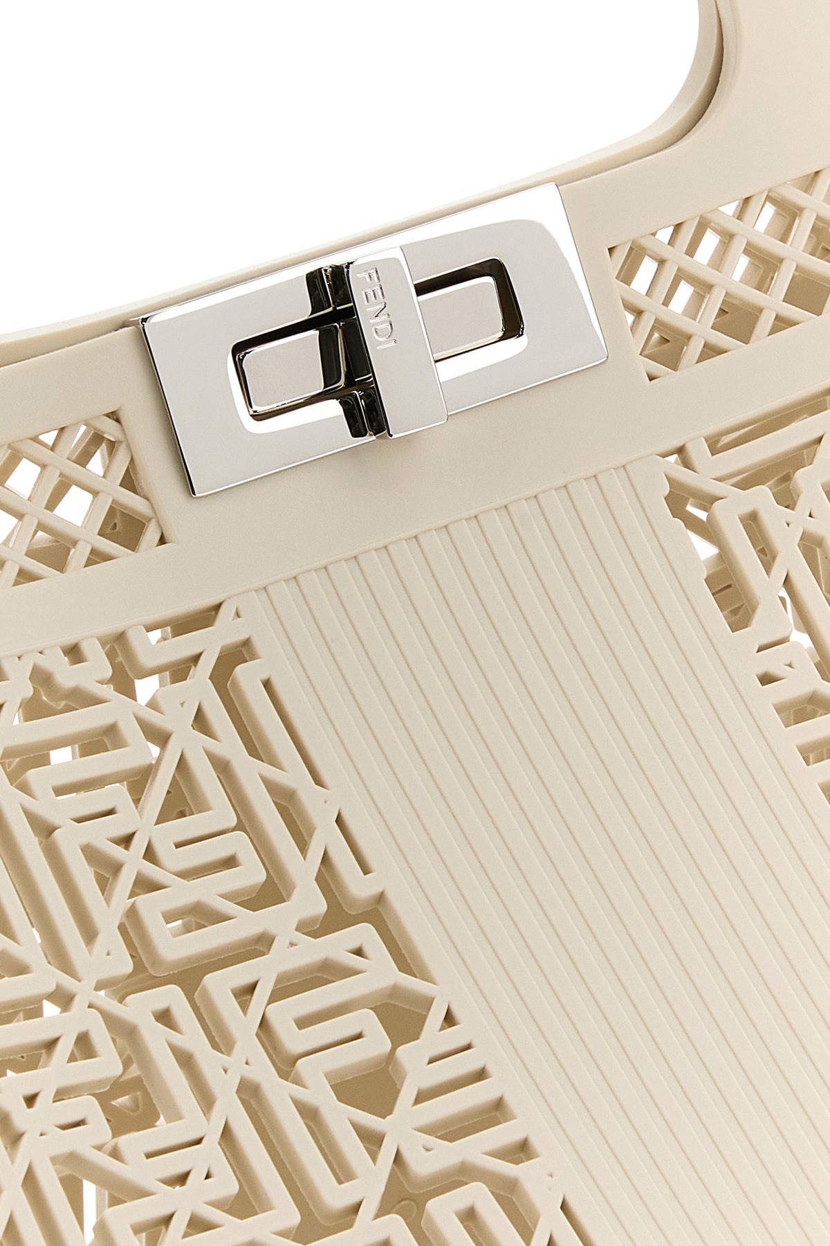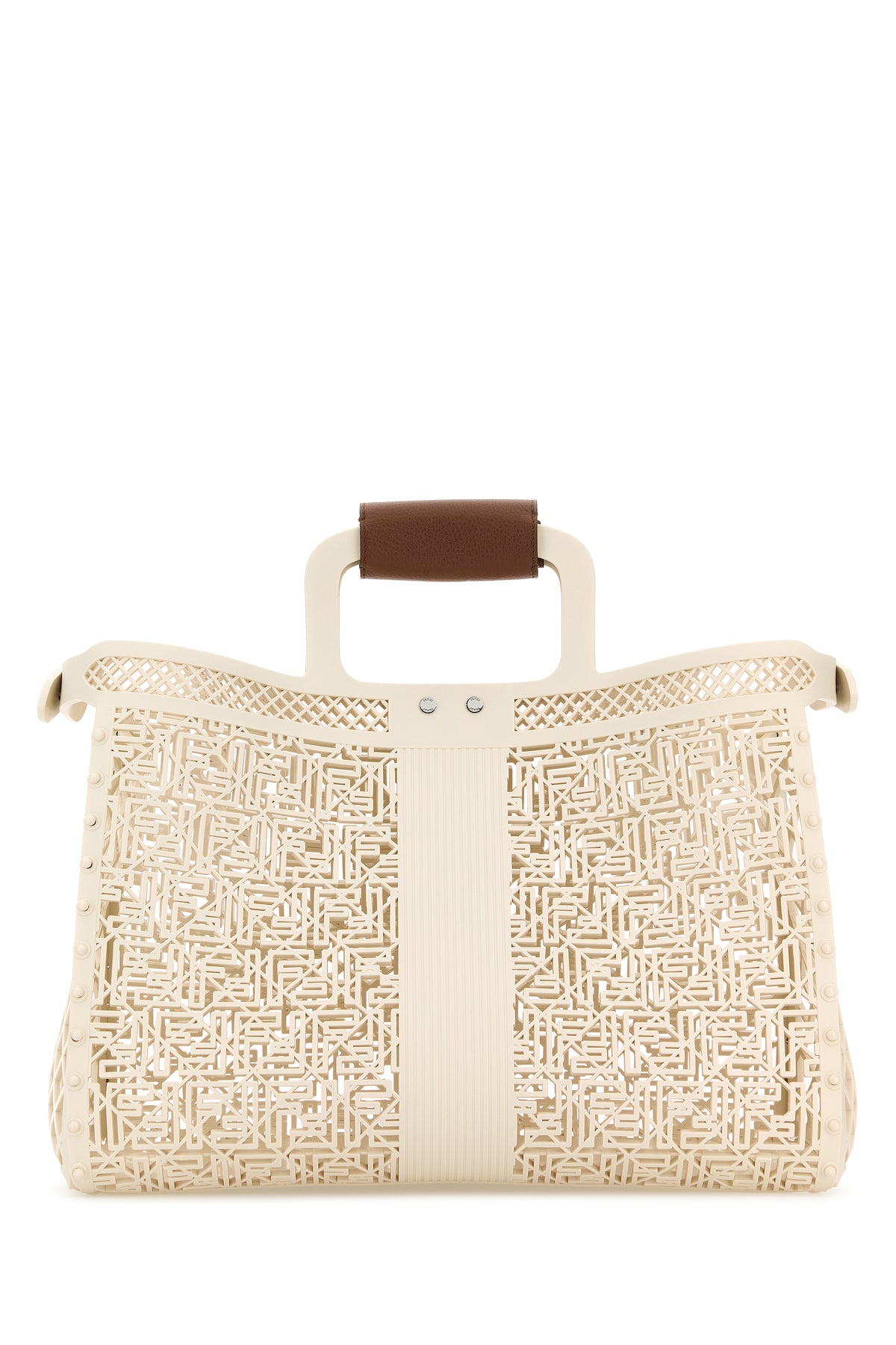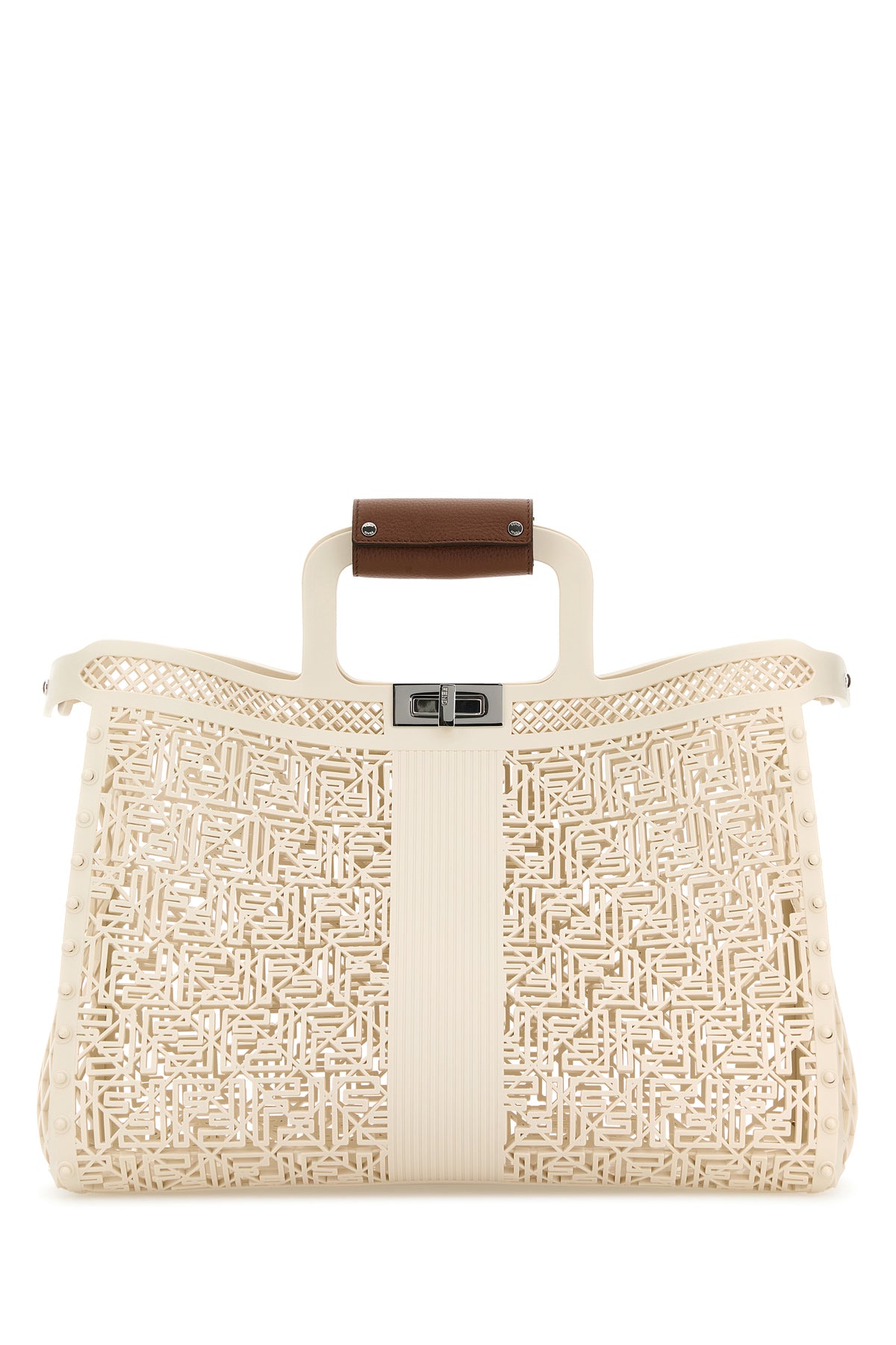 Shopping bag realized in rubber characterized by embossed logo on the turn-lock closure.