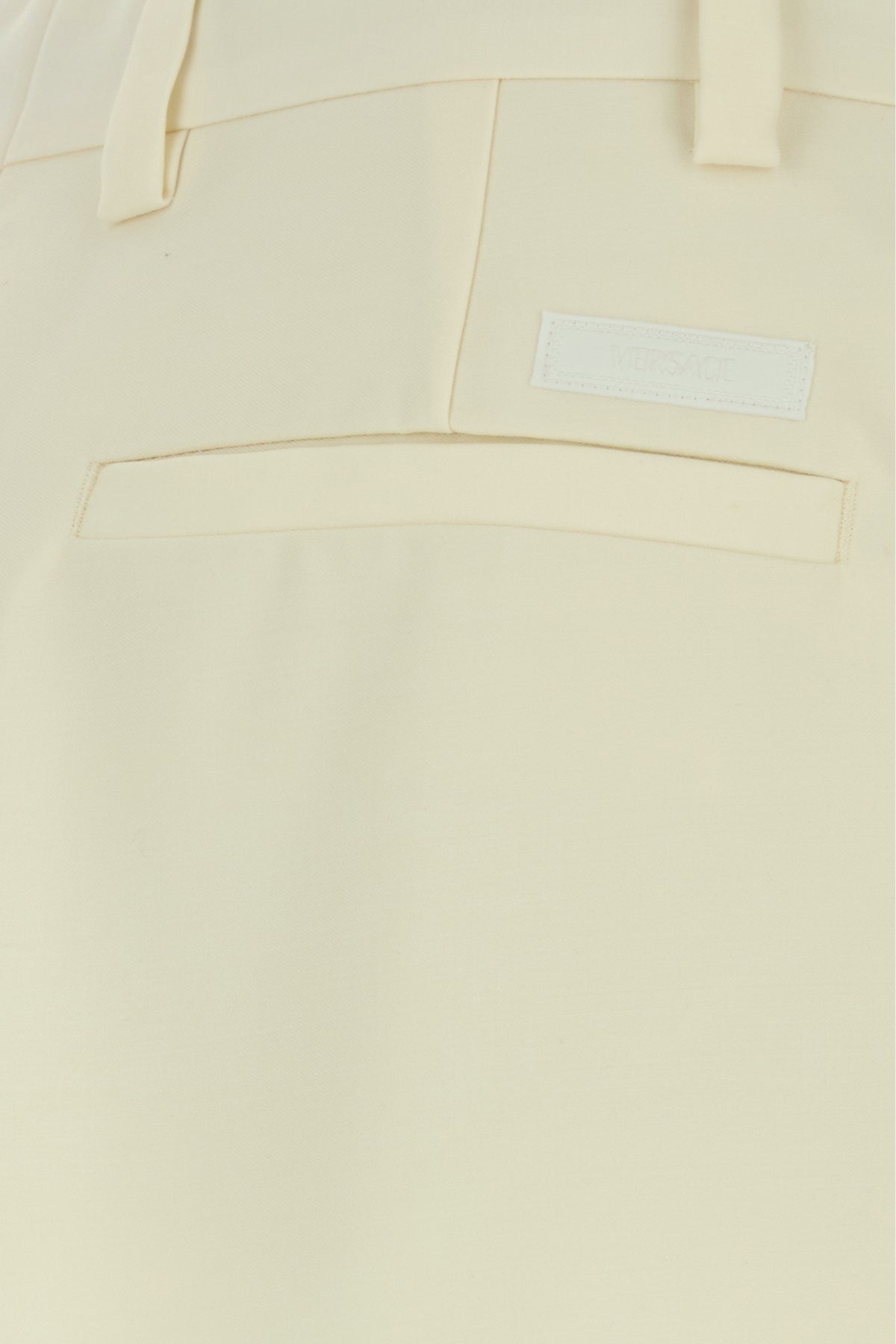 Pant realized in wool blend enriched by tonal Versace label at the back.