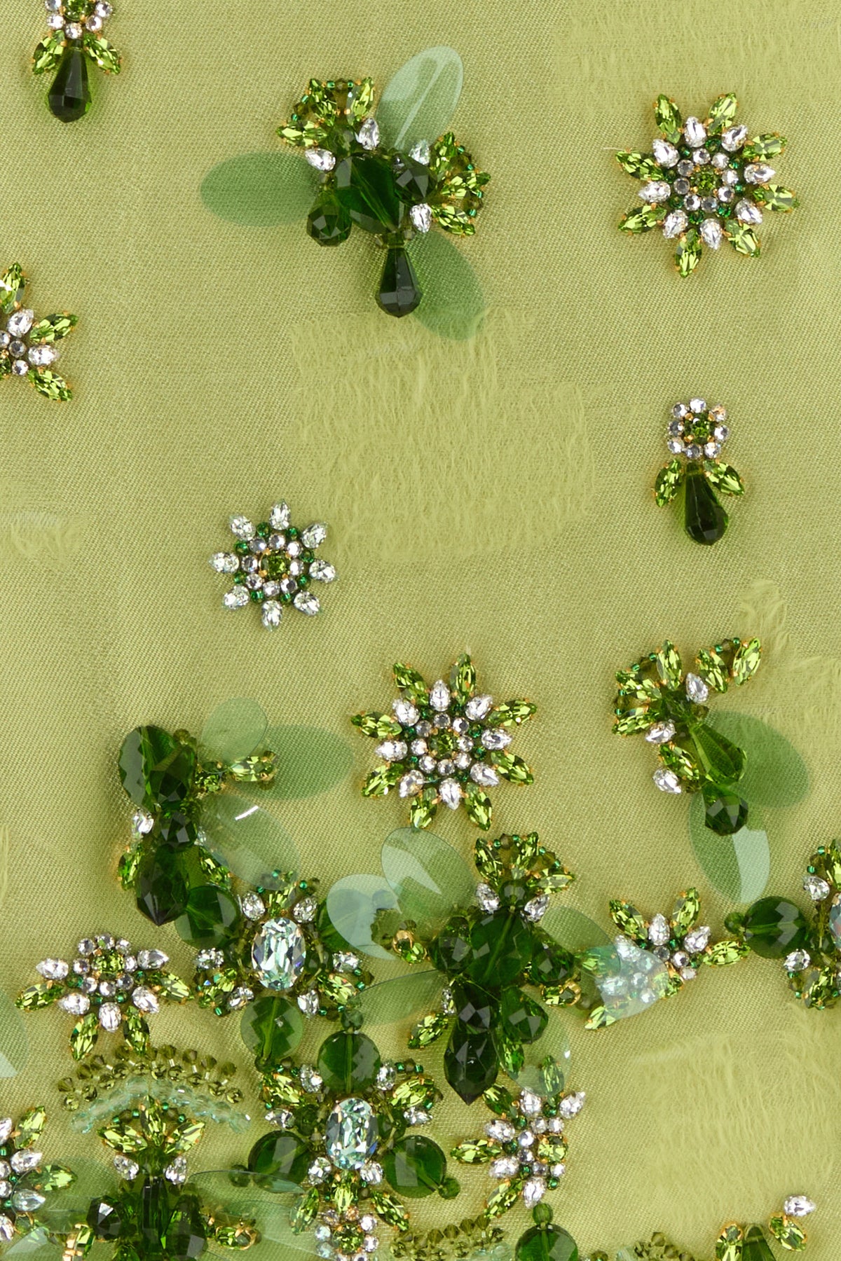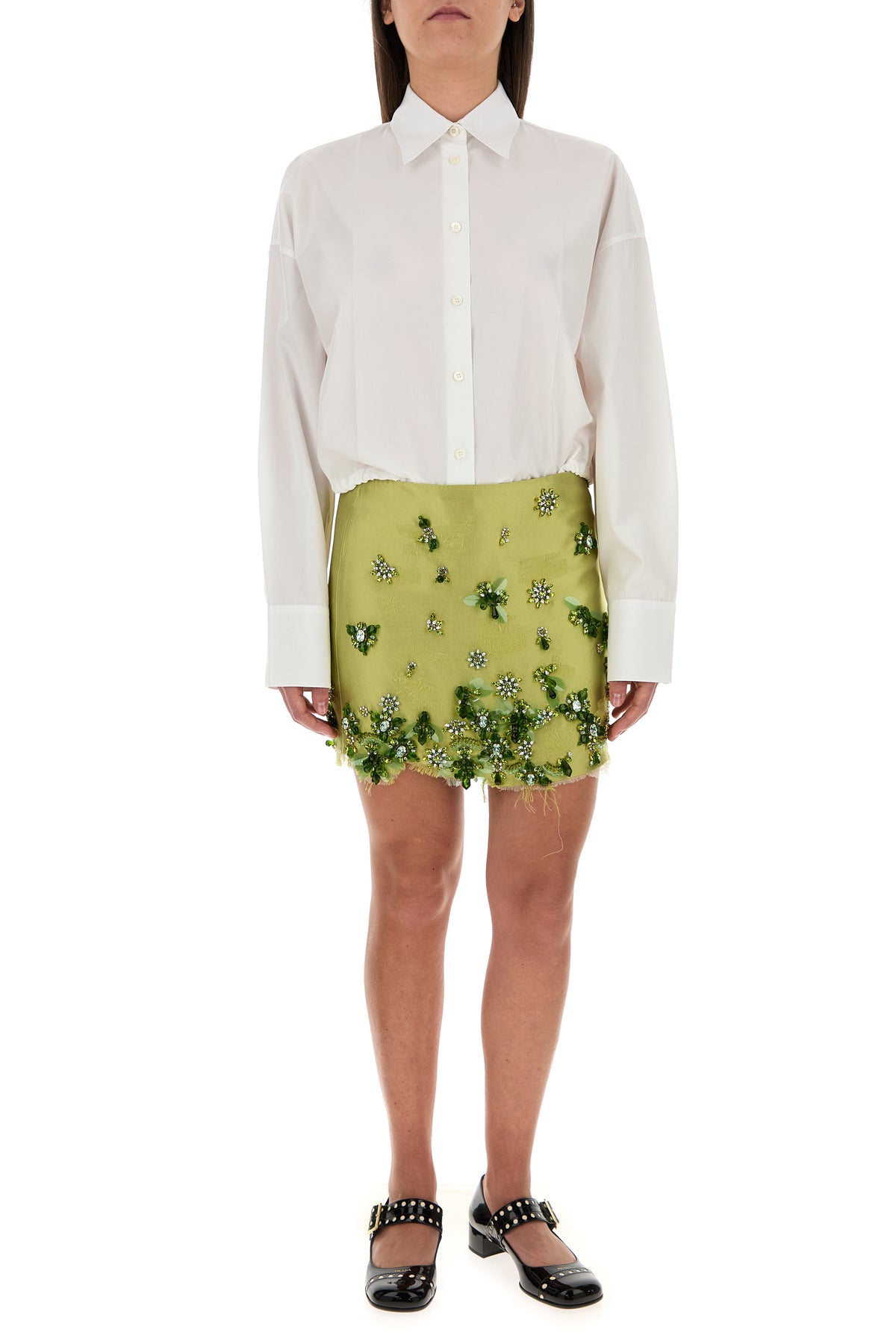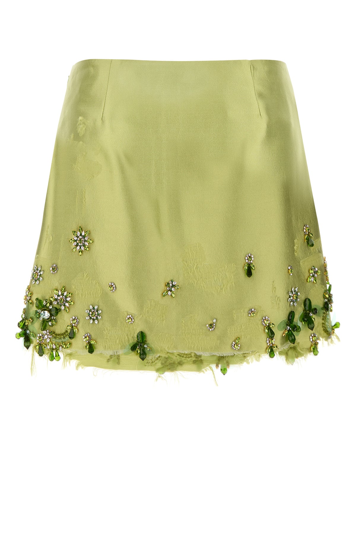 Mini skirt realized in distressed-effect silk and wool enriched by jewel embellishments on the entire surface.