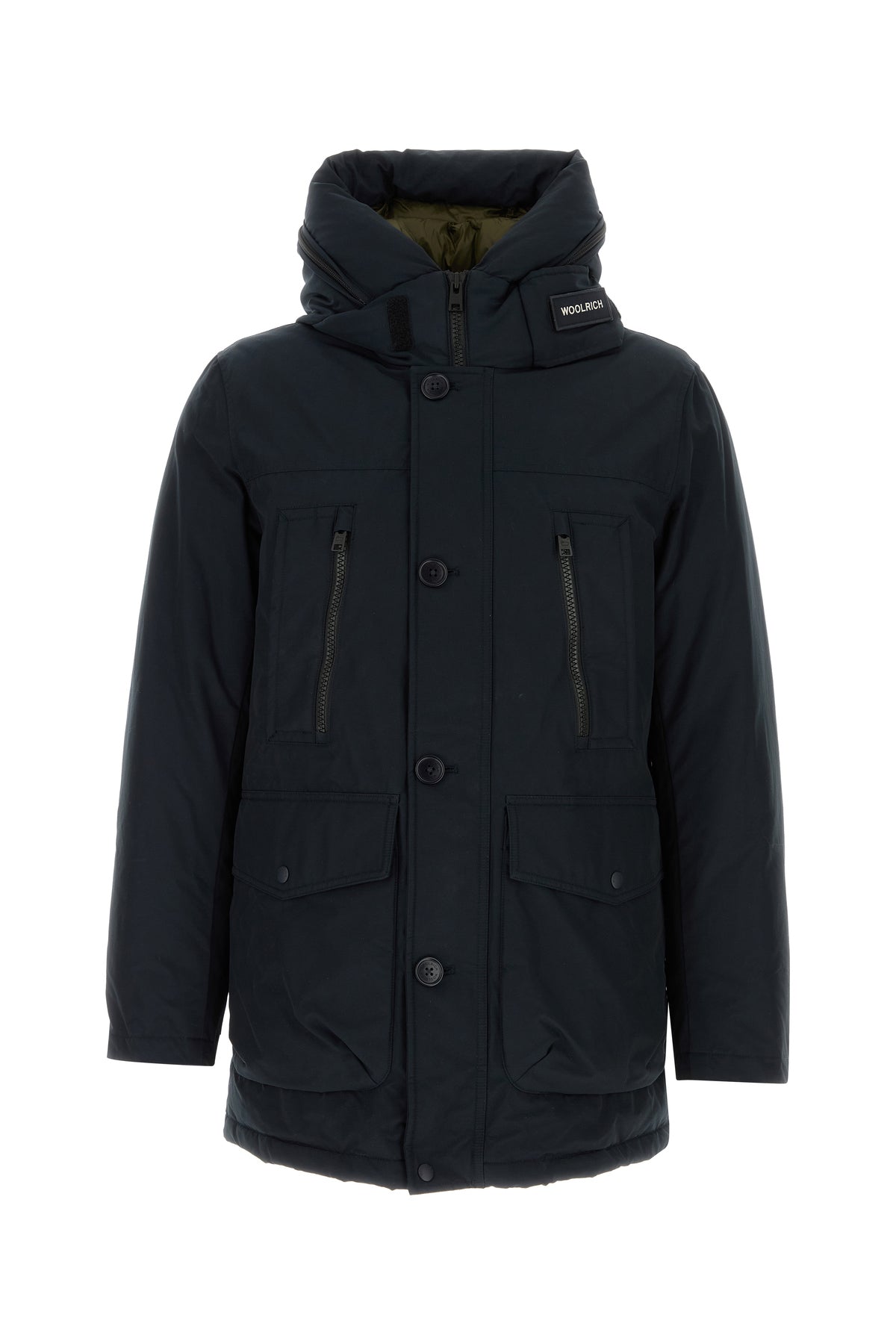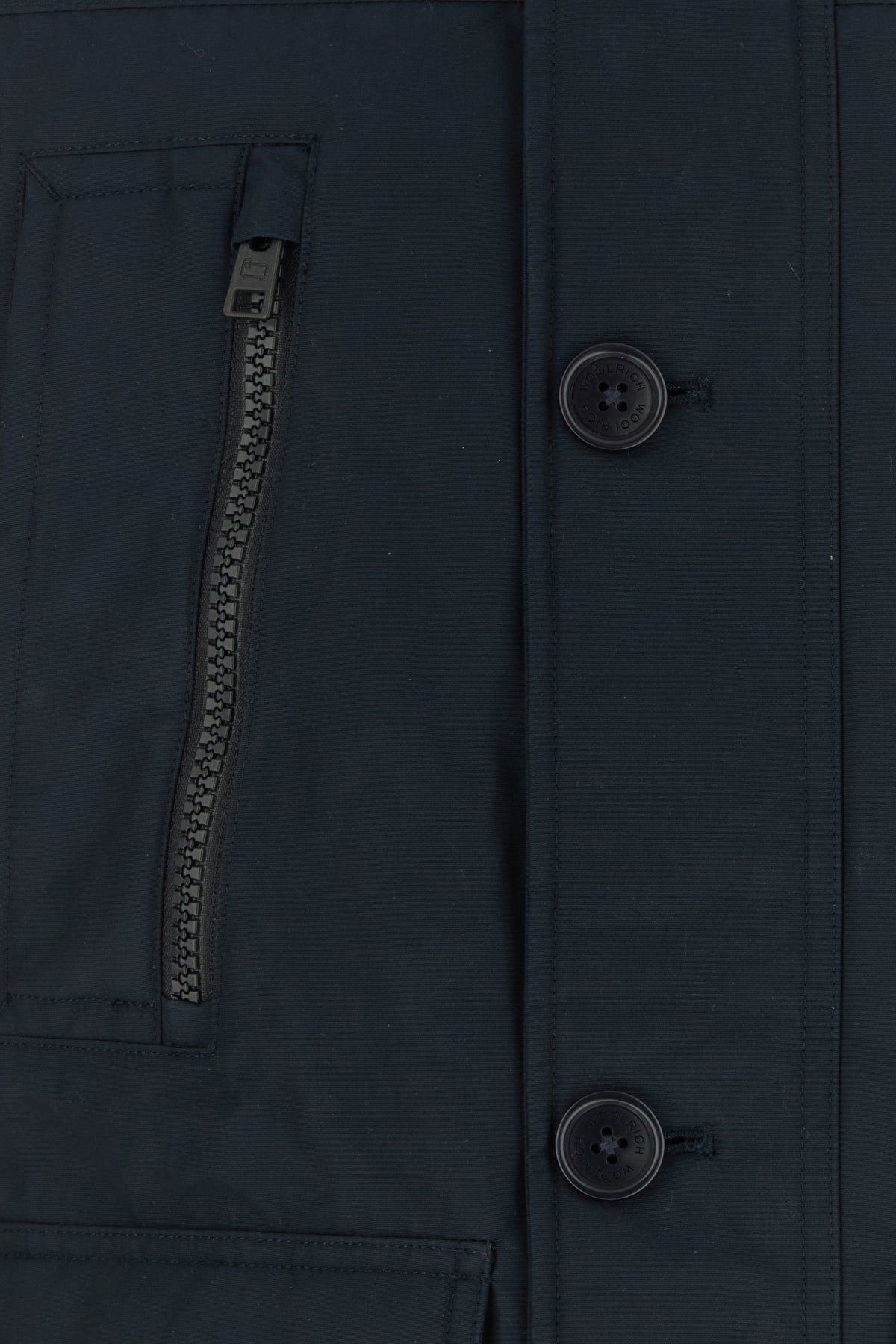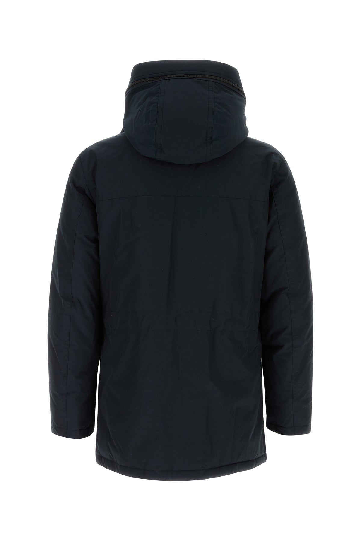 Down jacket realized in cotton blend characterized by funnel neck enriched by logoed label on the neck.