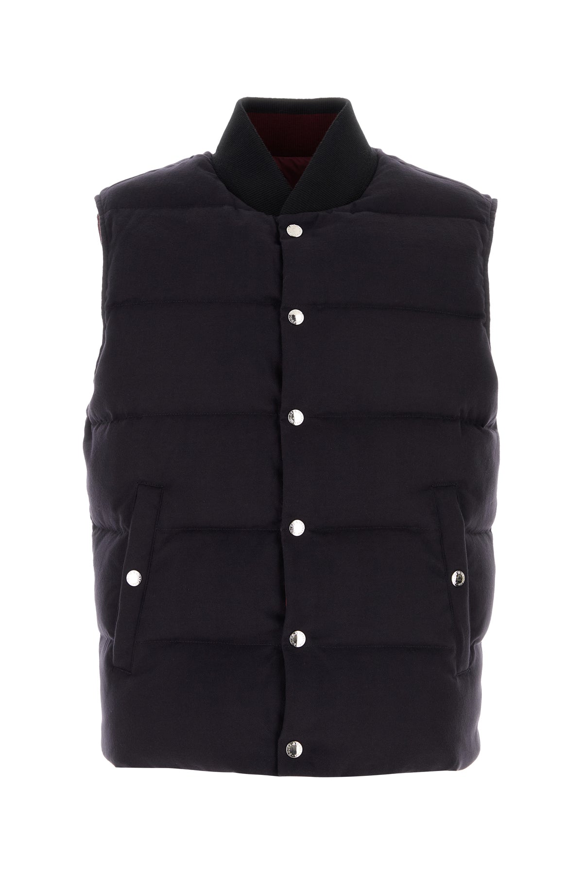 Reversibile sleeveless down jacket realized in quilted cotton blend enriched by logoed patch at the back.