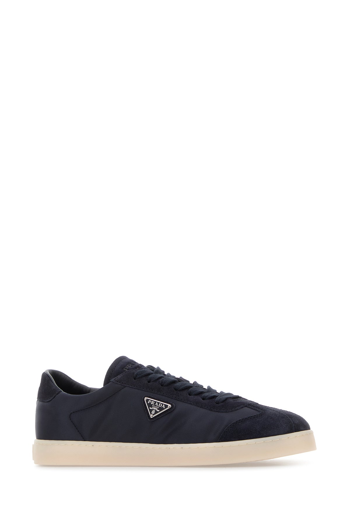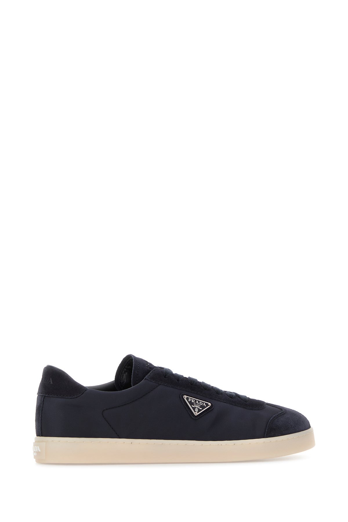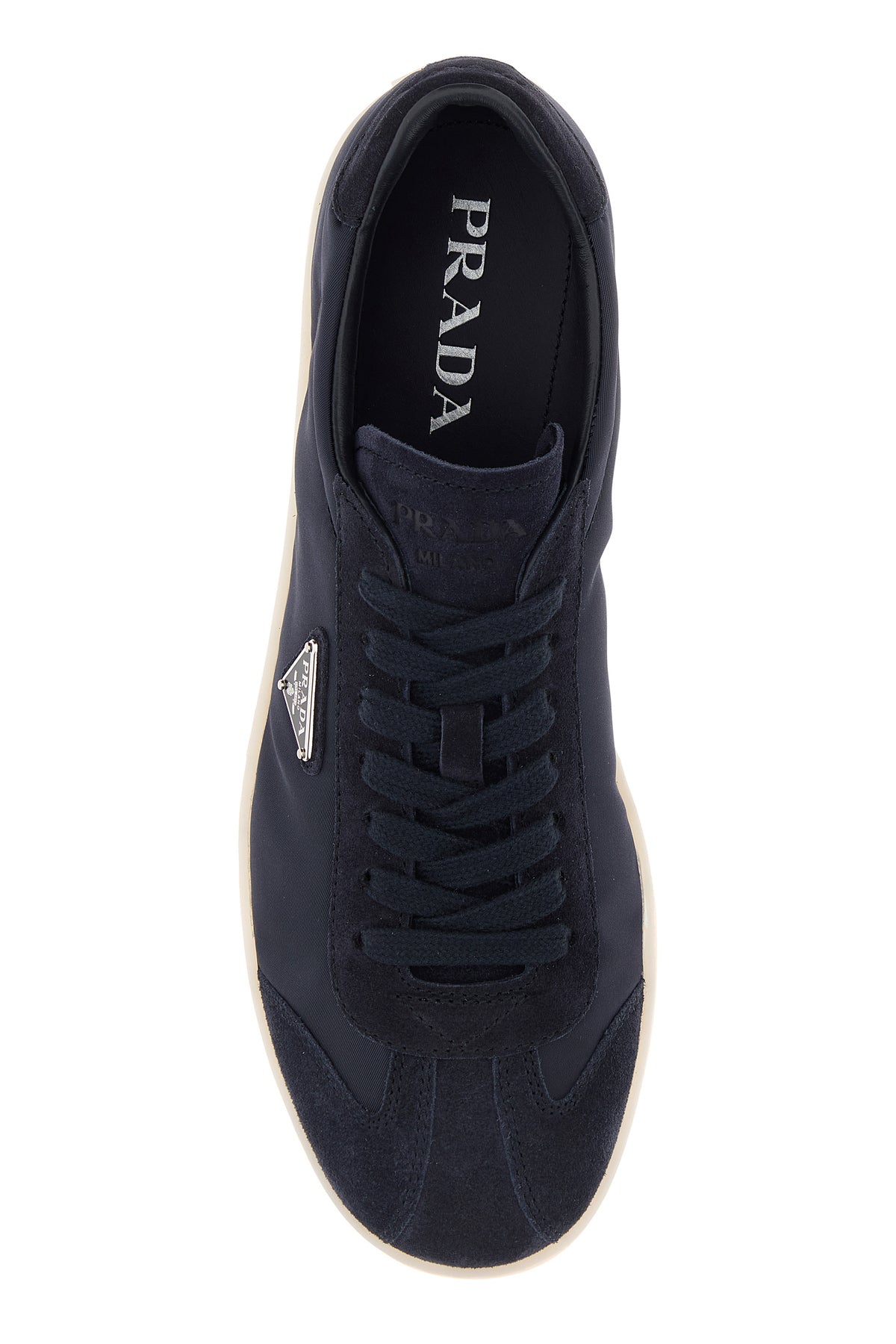 Sneakers realized in Re-Nylon and suede characterized by embossed logo at the back enriched by iconic logoed metal triangle on the side.