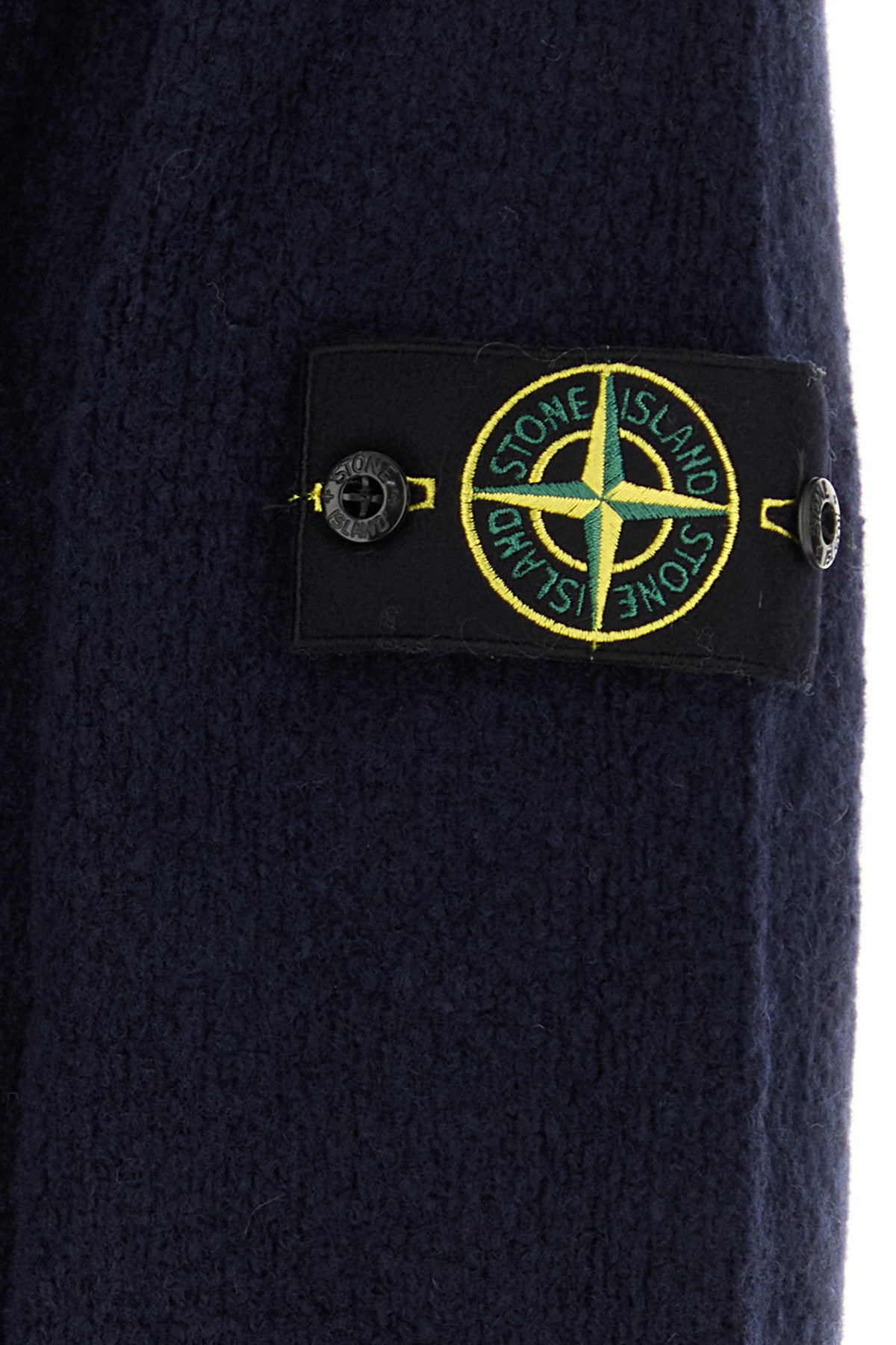 Sweater realized in wool blend enriched by detachable logged label on the sleeve.