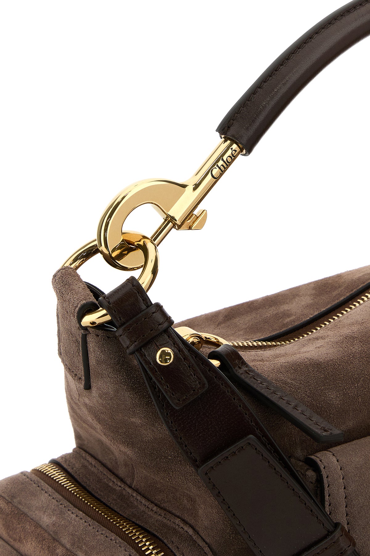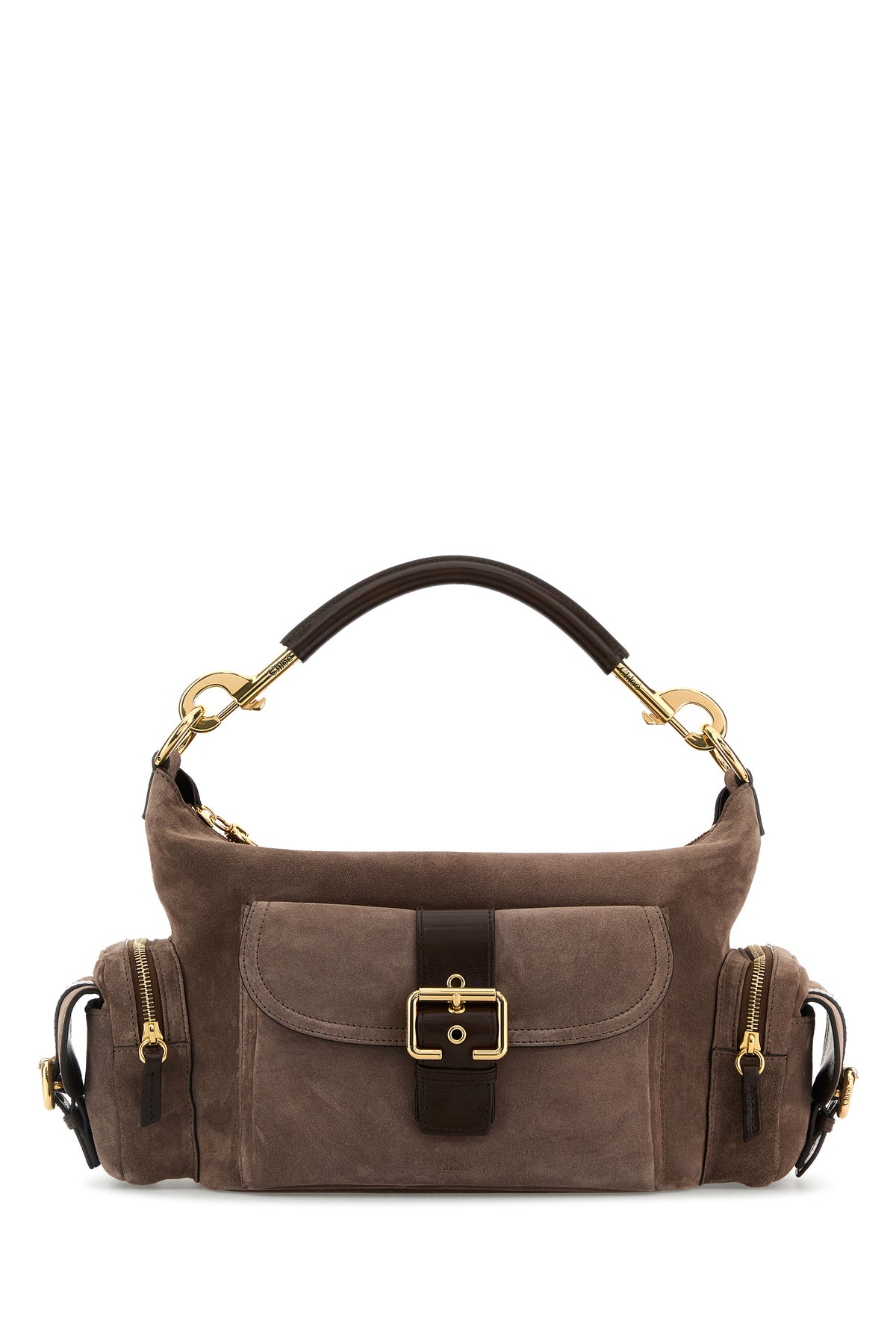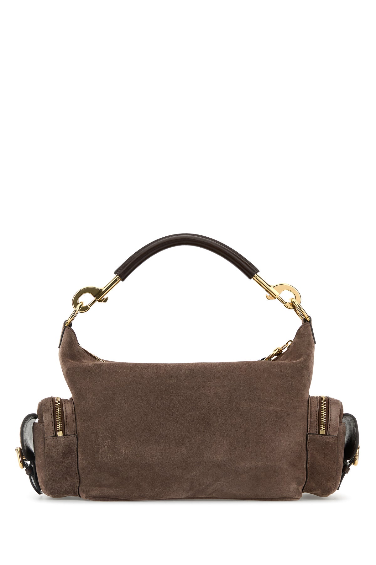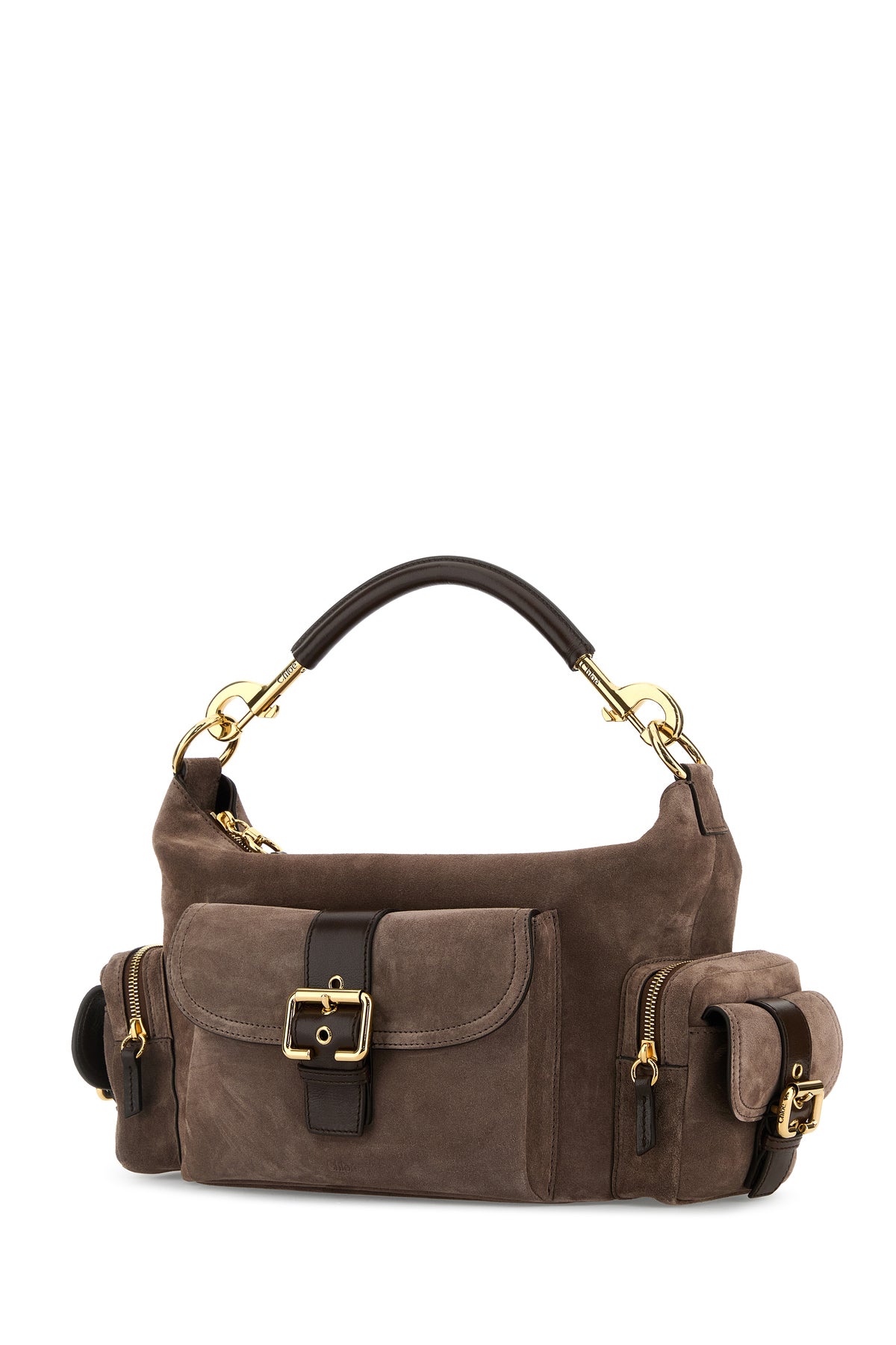 Handbag realized in suede characterized by a flap pocket at the front, two flap pockets and tow zip pockets on the sides.