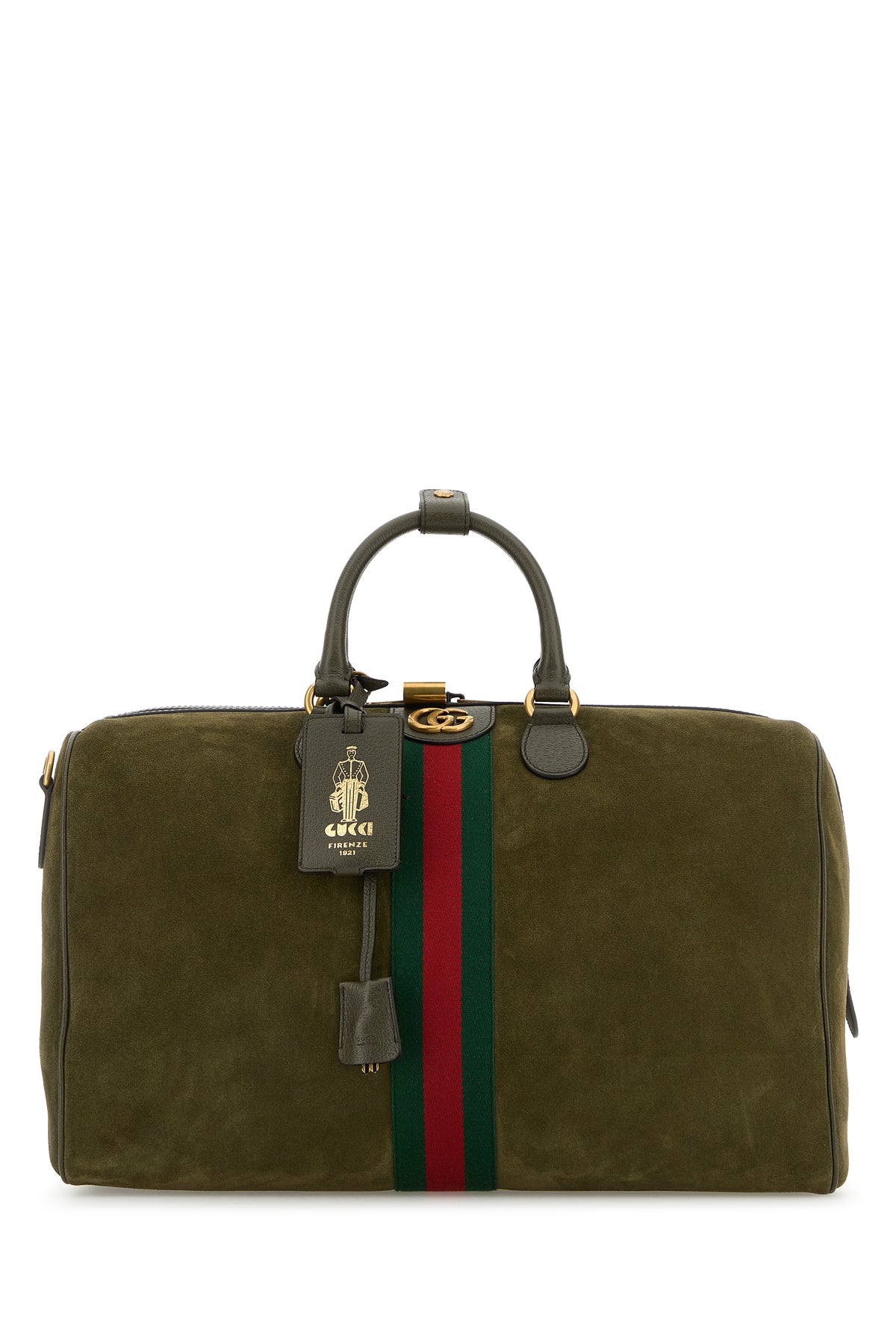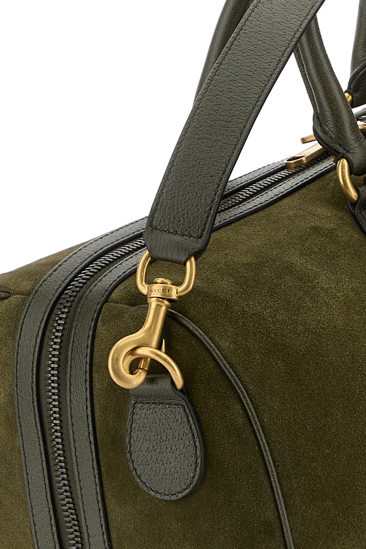 Travel bag realized in suede enriched by GG metal detail at the front and Web patch at the front and at the back.