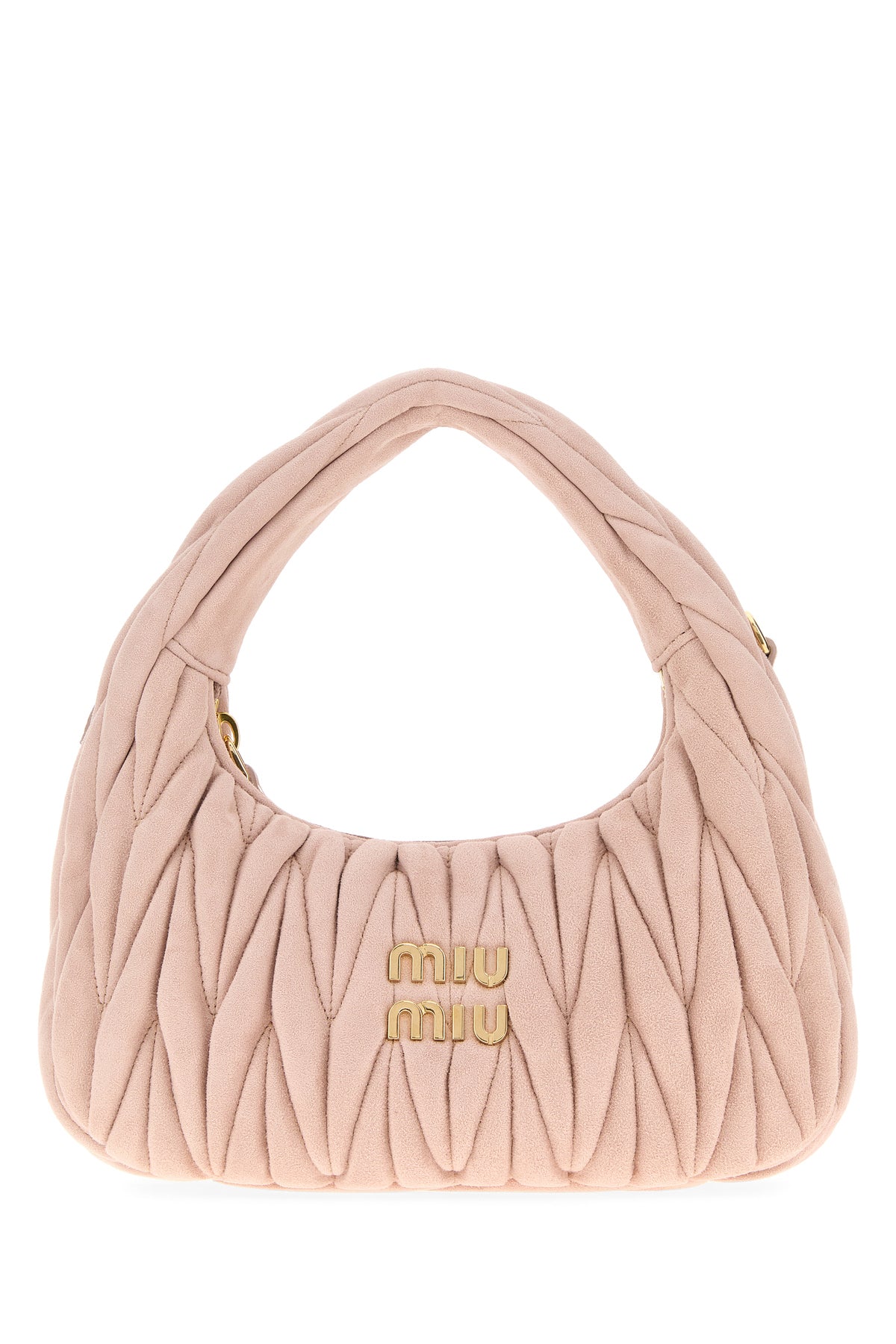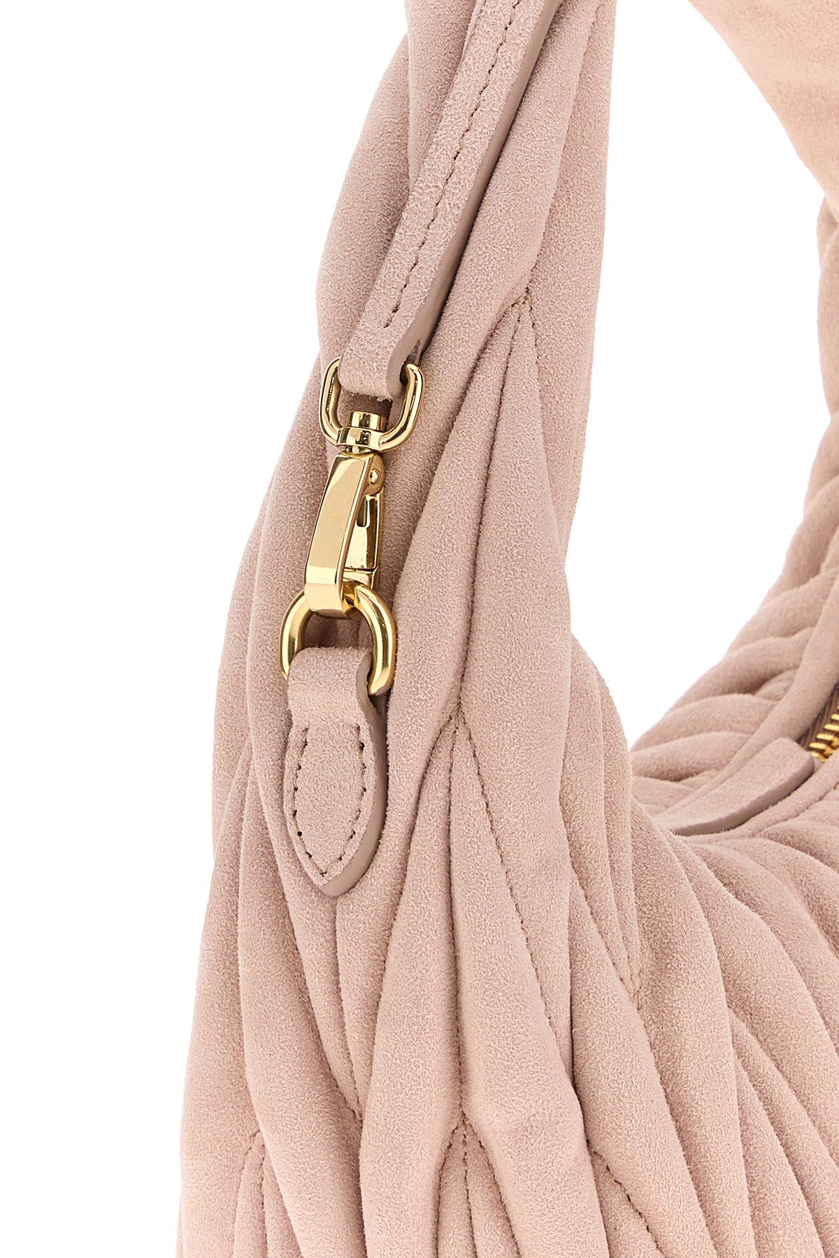 Handbag realized in matelasse suede enriched by metal lettering logo at the front.