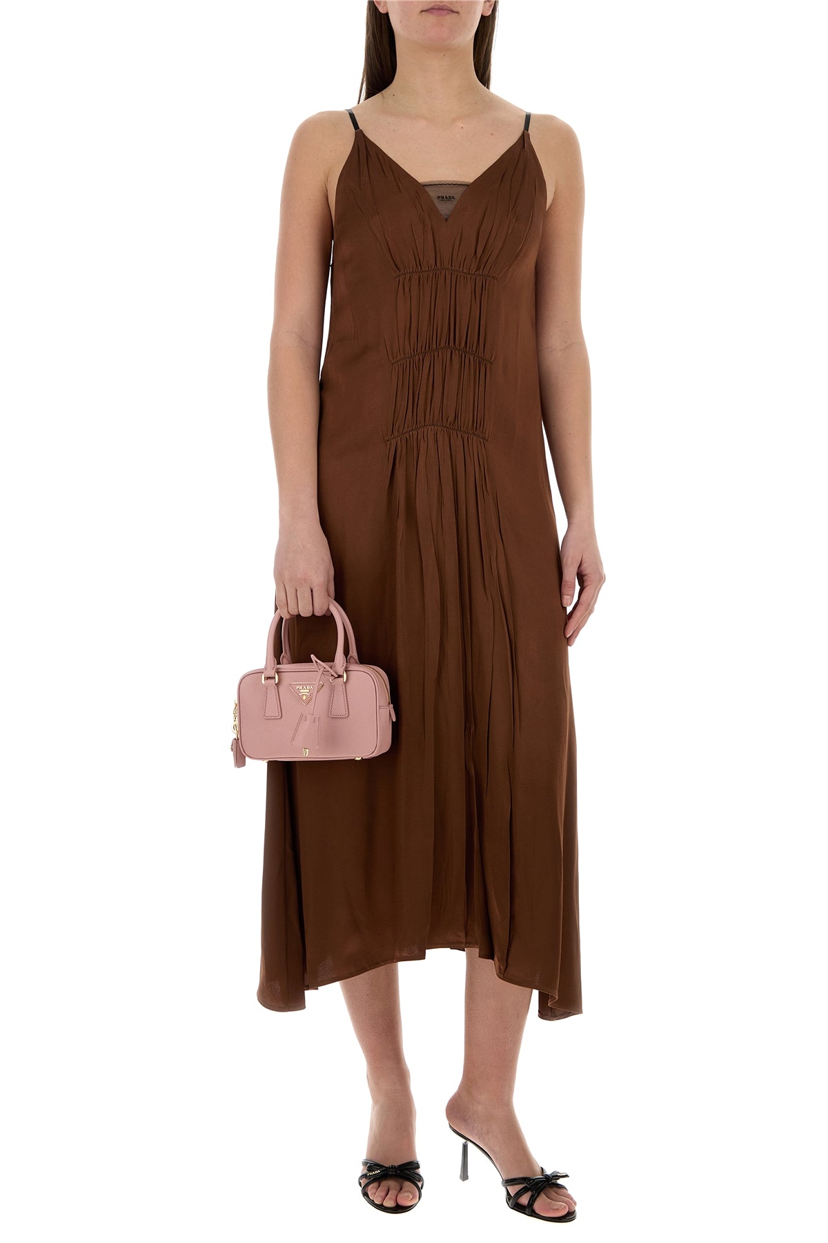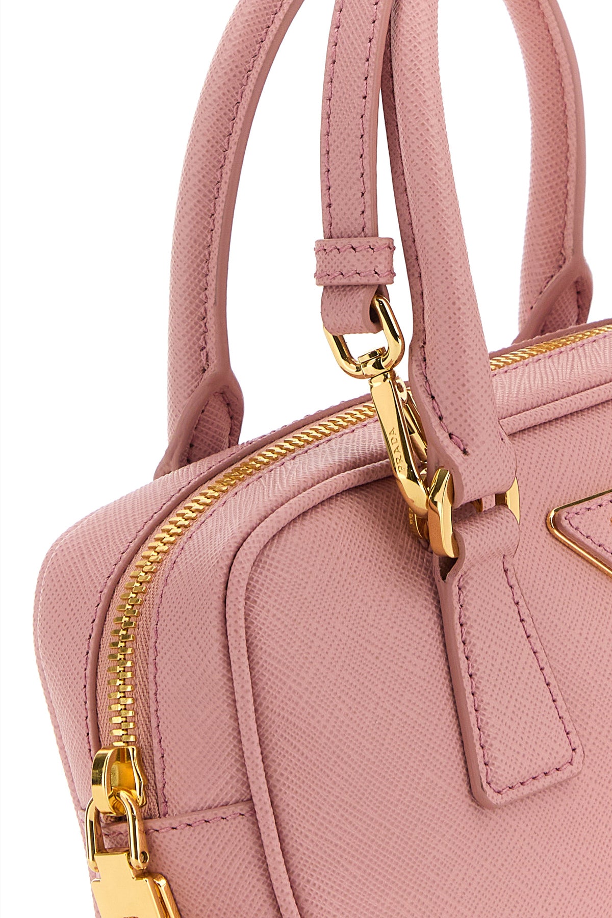 Handbag realized in Saffiano leather enriched by iconic logoed metal triangle at the front.