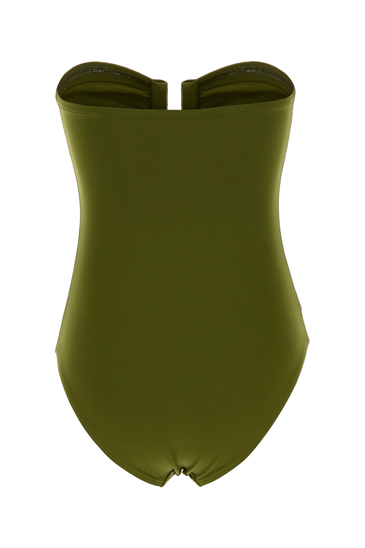 Swimsuit realized in stretch nylon characterized by peculiar gathered neckline with metal detail.