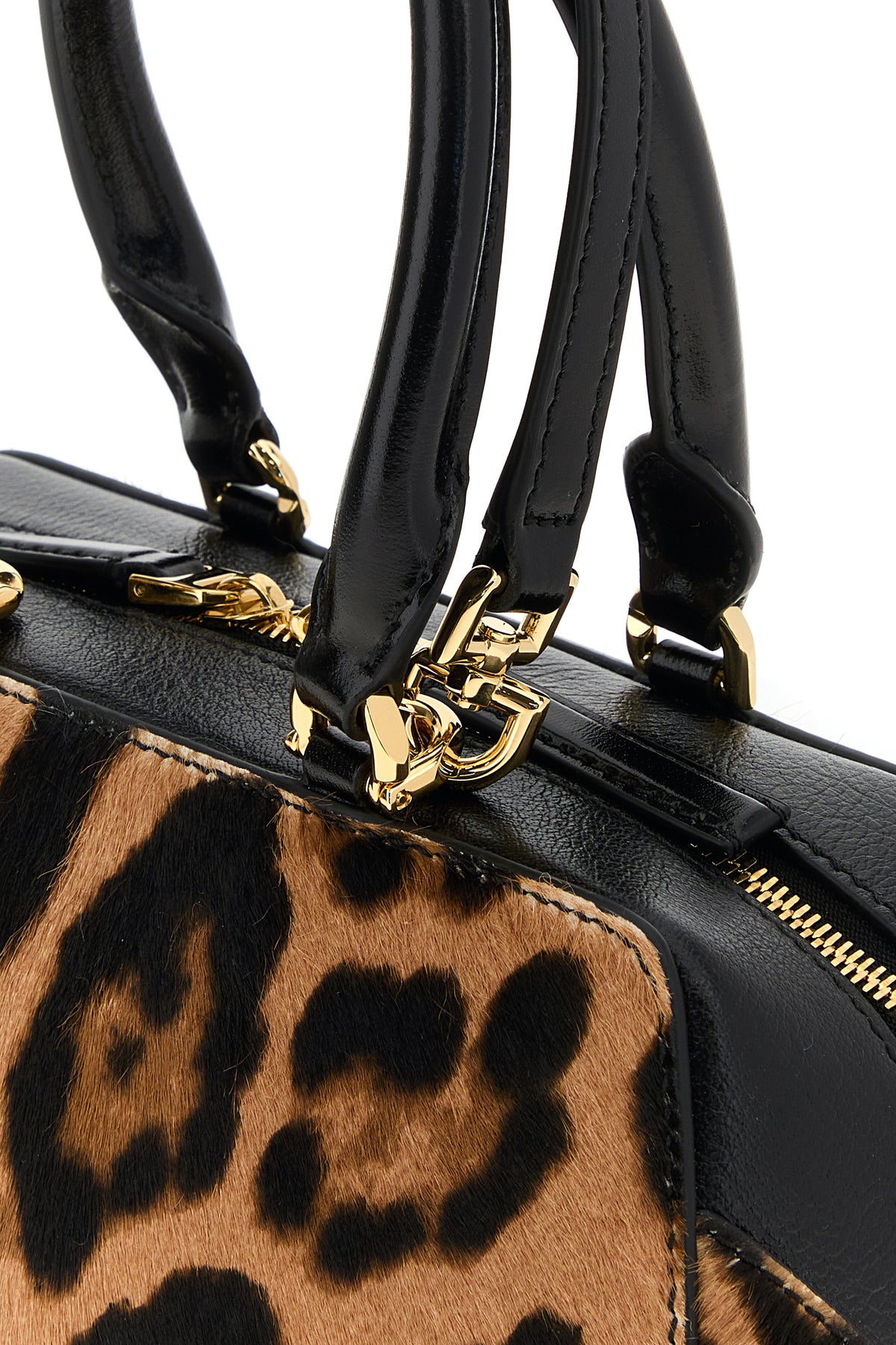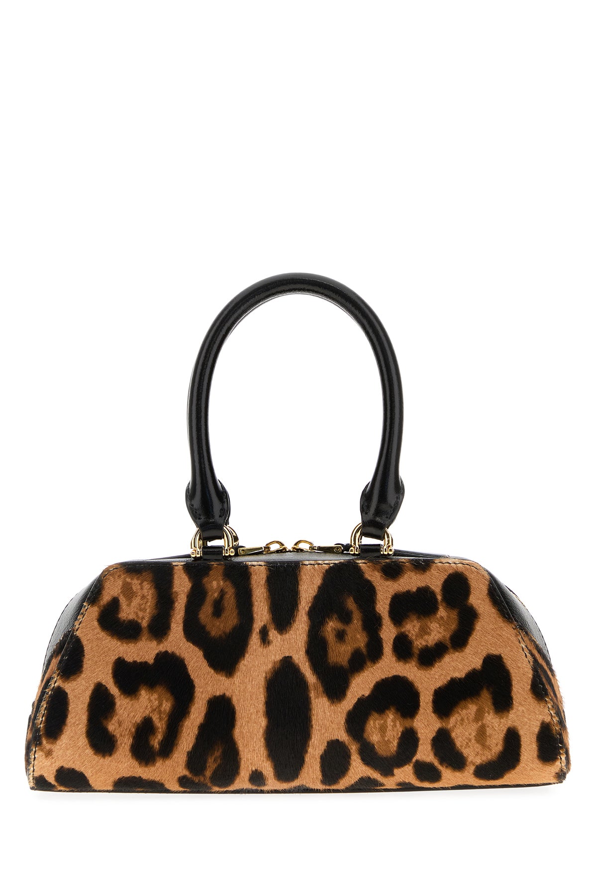 Handbag realized in calf hair characterized by animal print on the entire surface and laminated printed logo at the front.