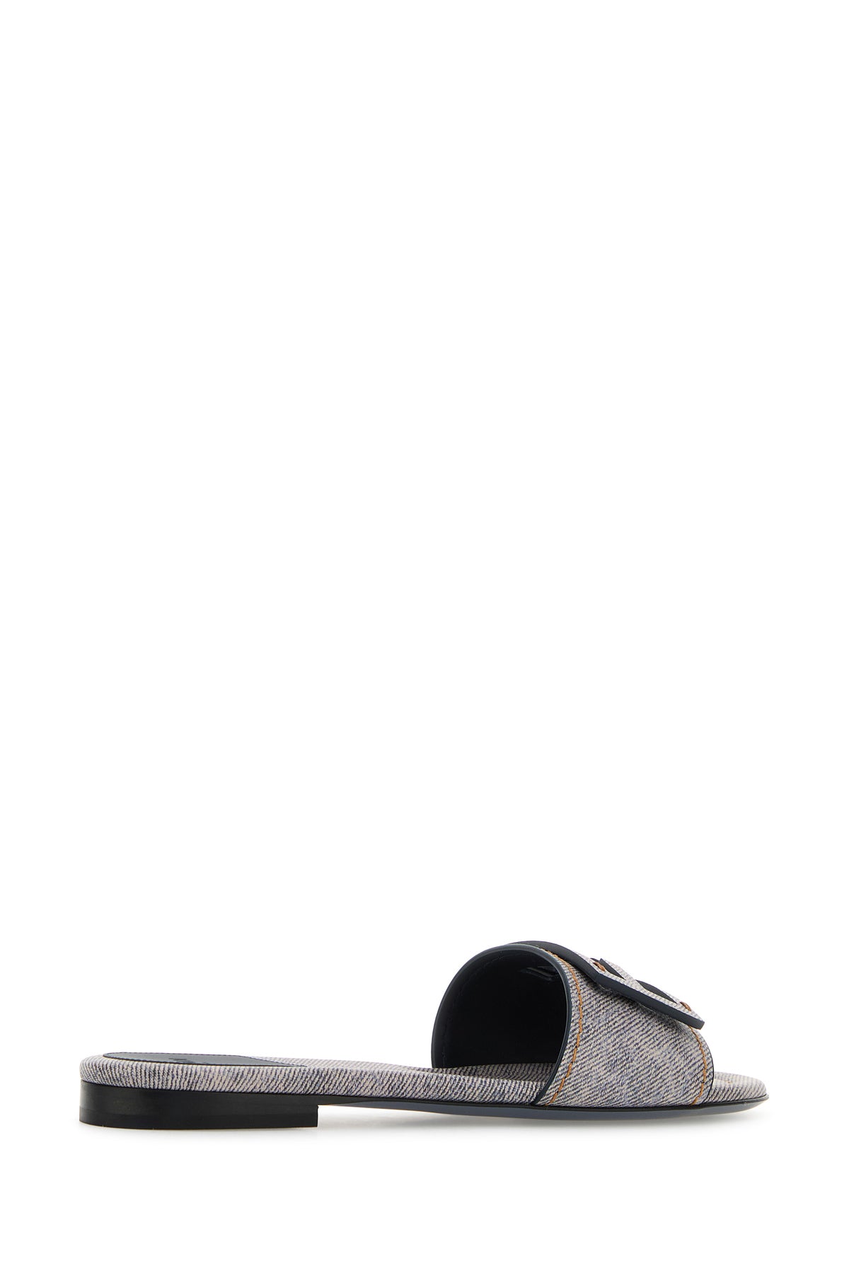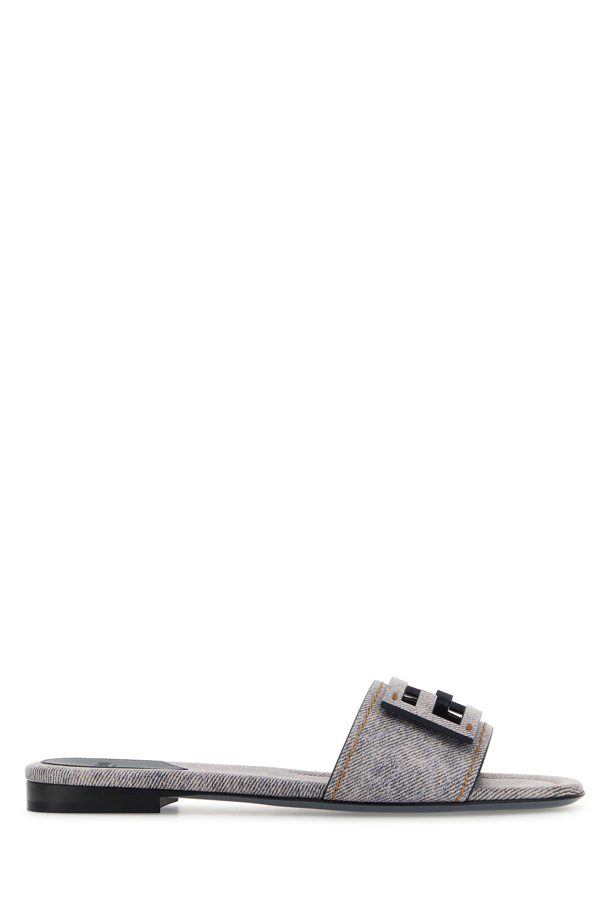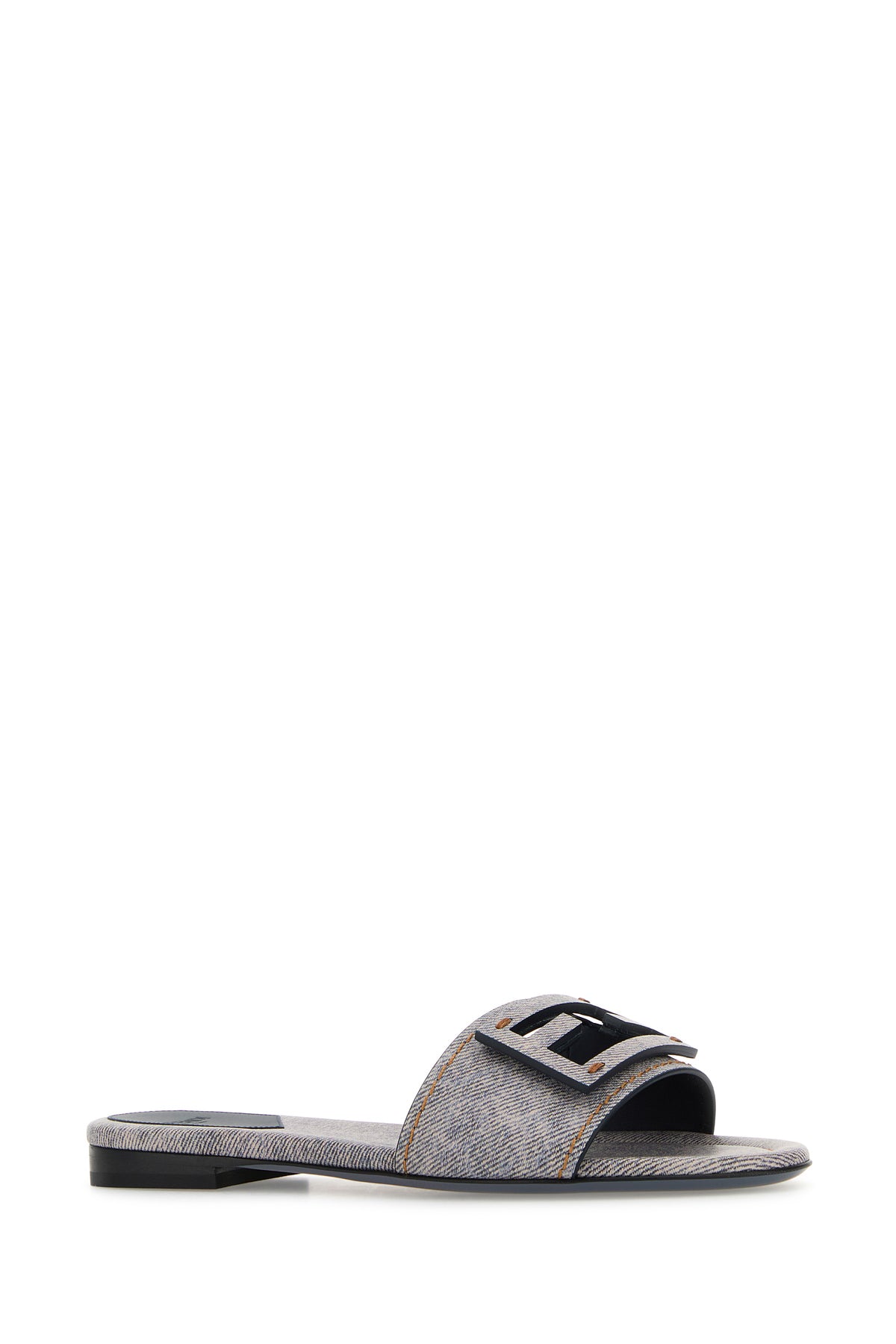 Slippers realized in denim-effect printed calf leather enriched by cut-out FF Baguette detail at the front.