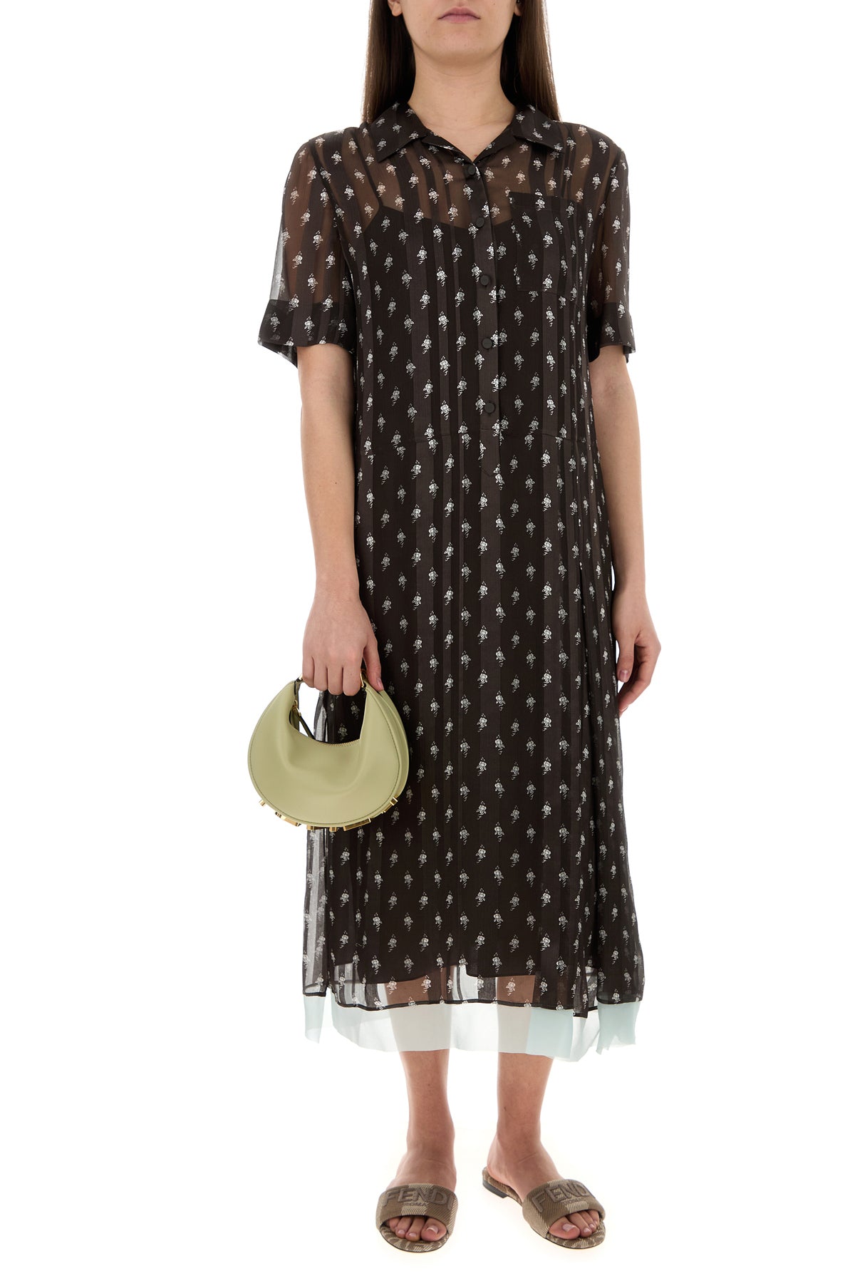 Shirt dress realized in pure silk characterized by striped print on the enriched surface.