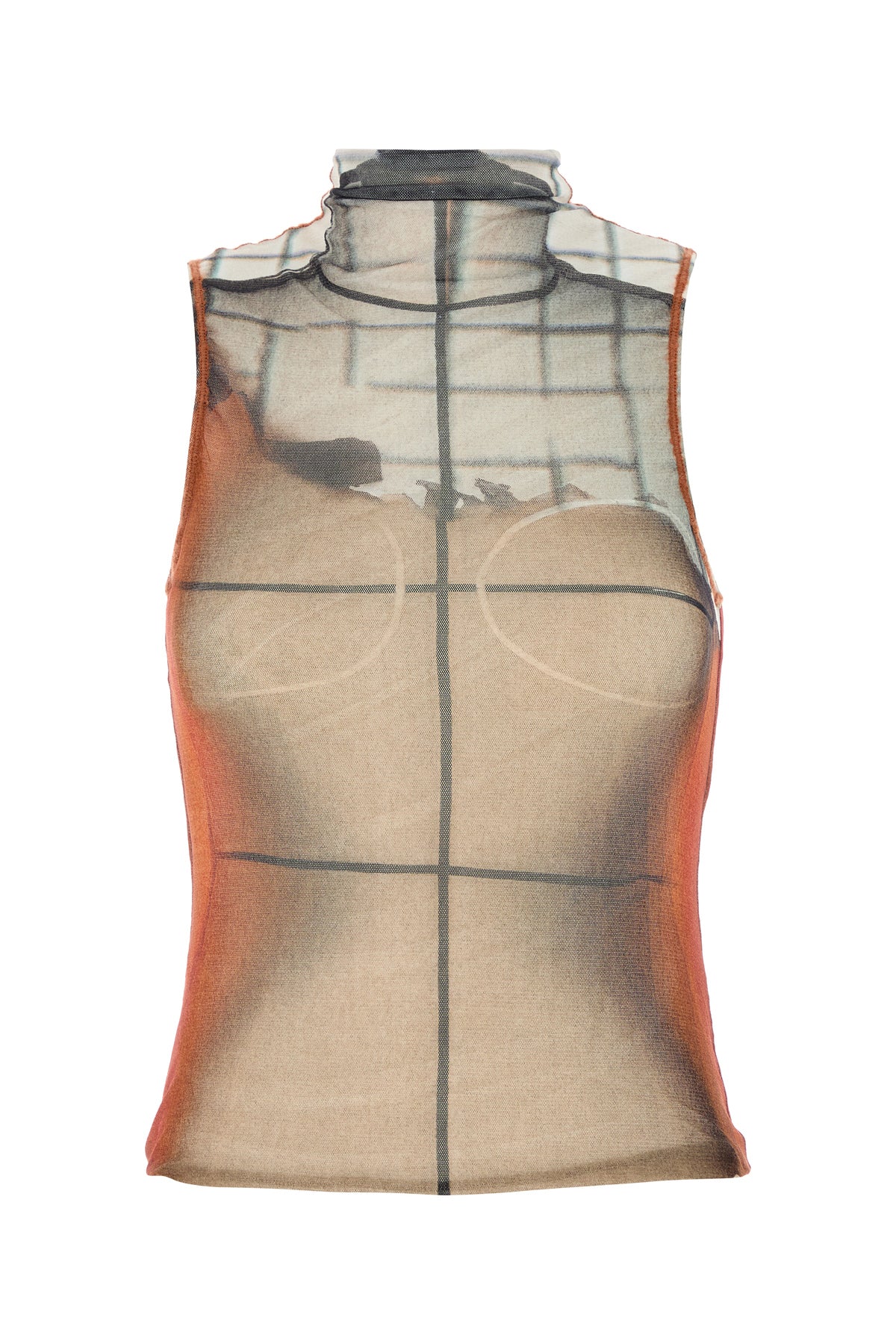 Tank top realized in tulle characterized by Fire print on the entire surface.