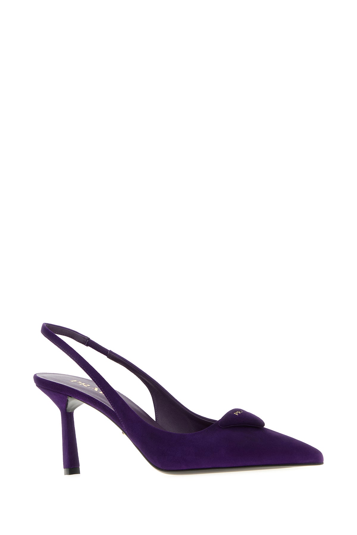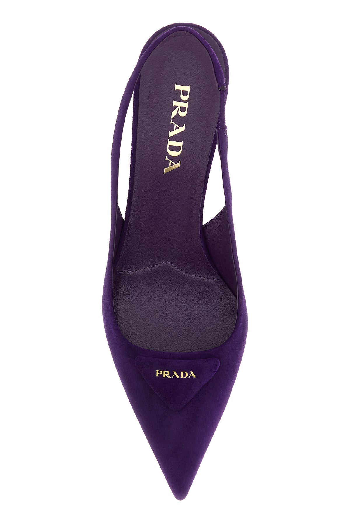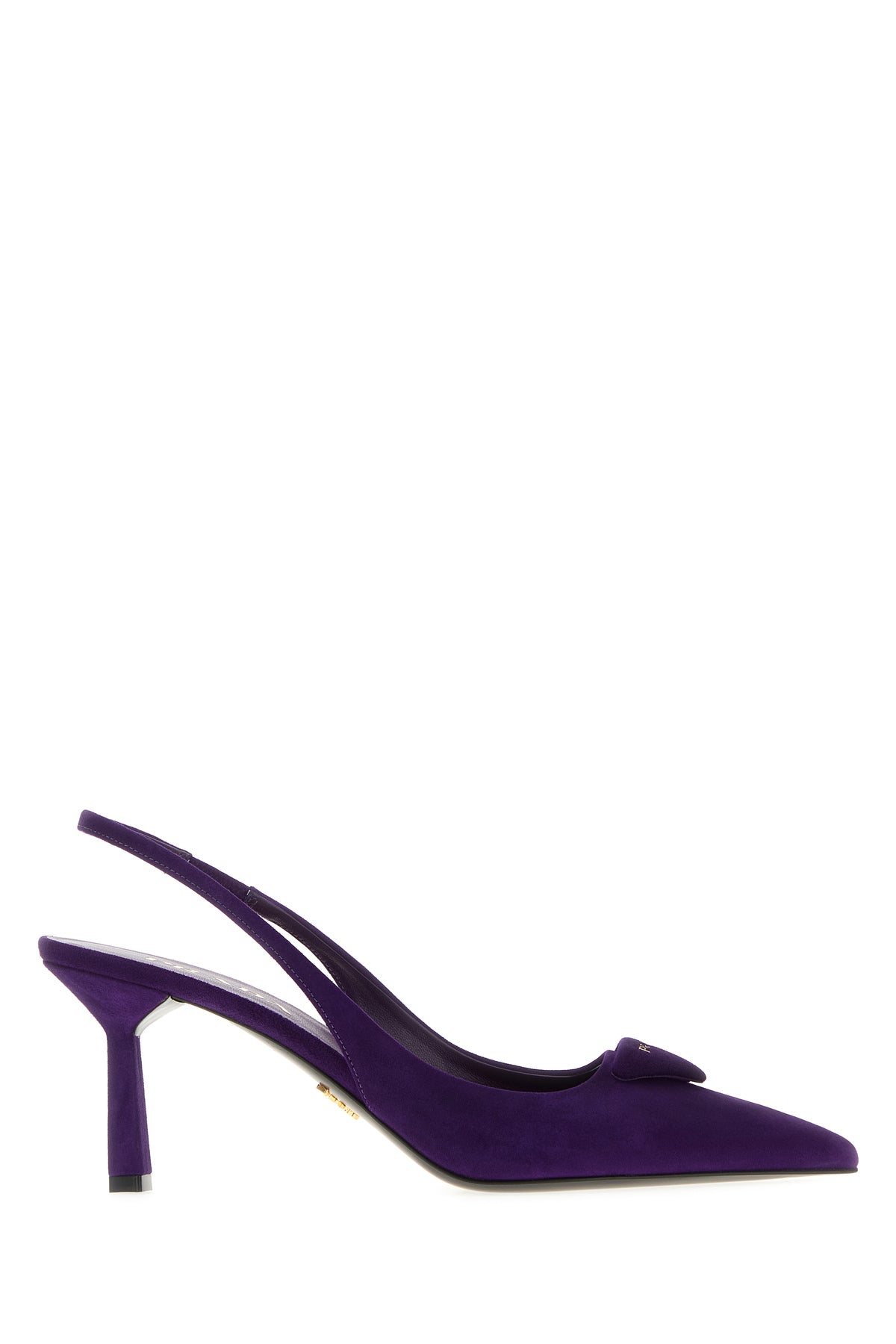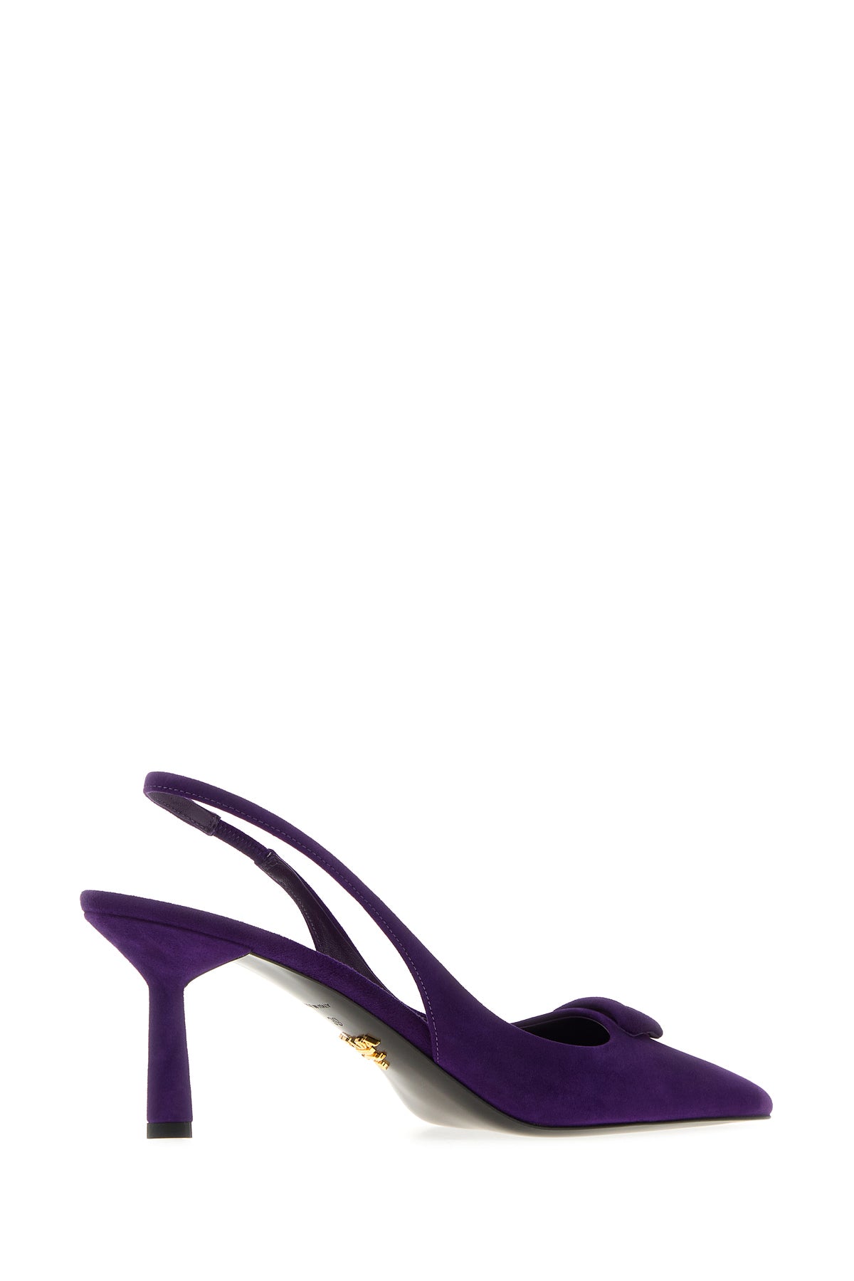 Slingback realized in suede enriched by iconic logoed leather triangle on the instep.