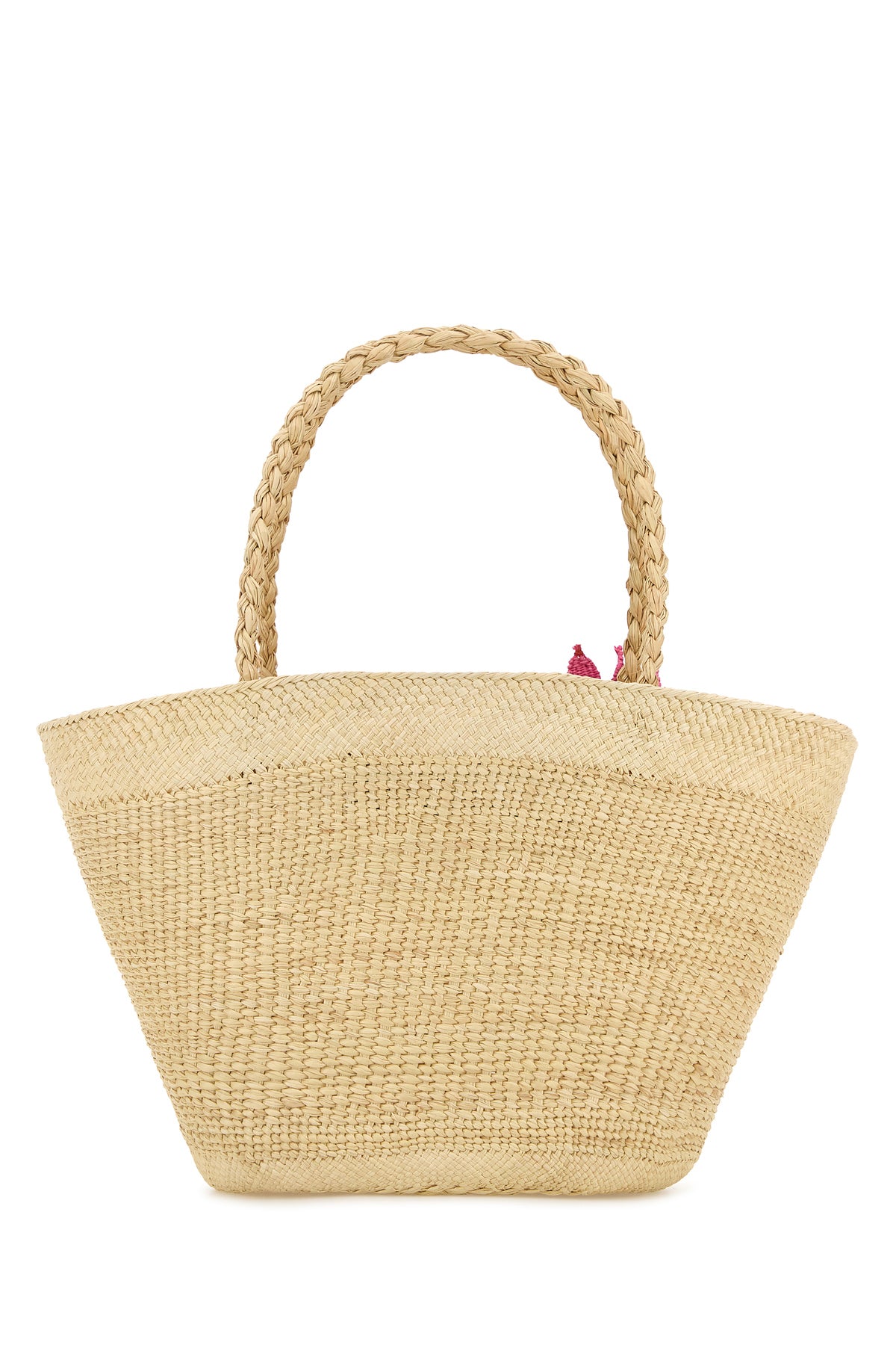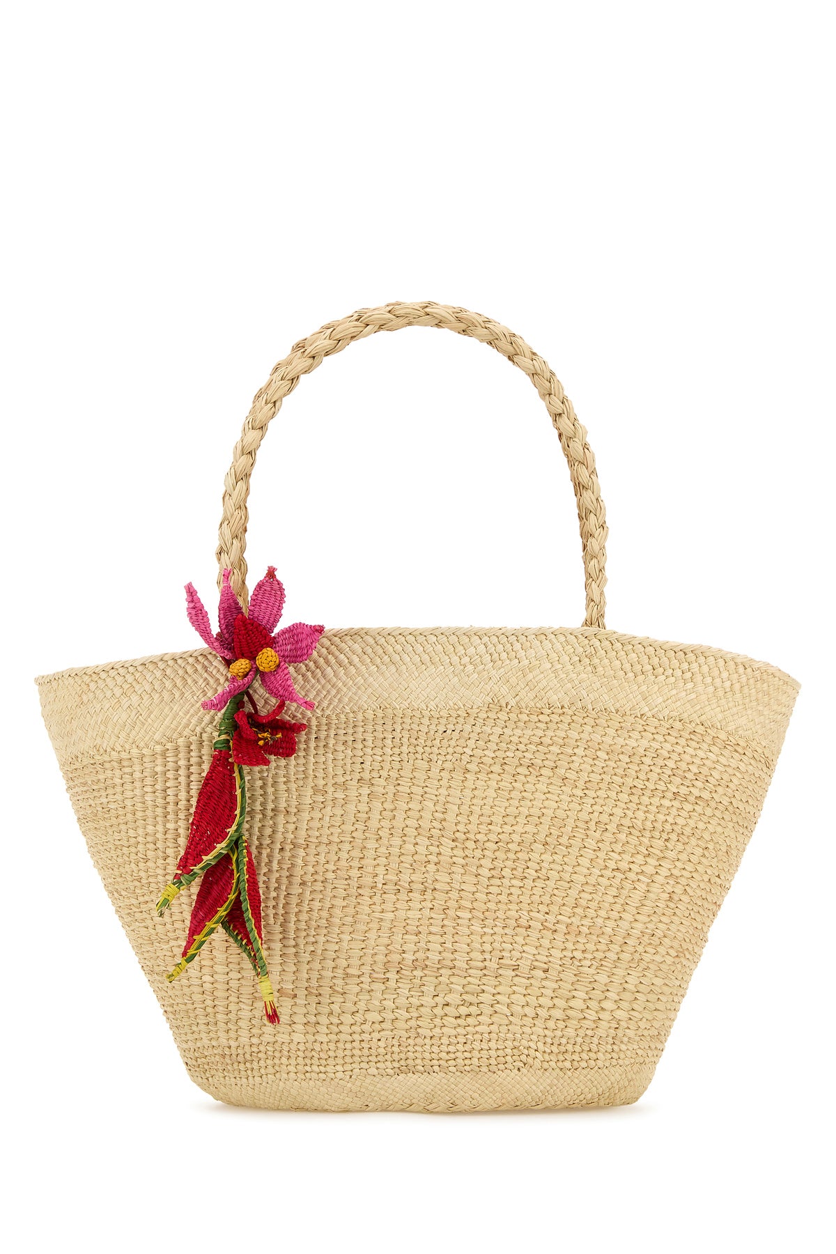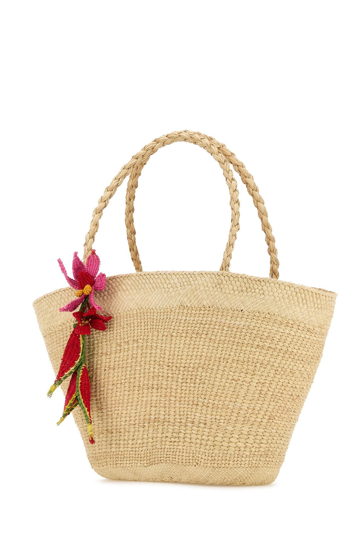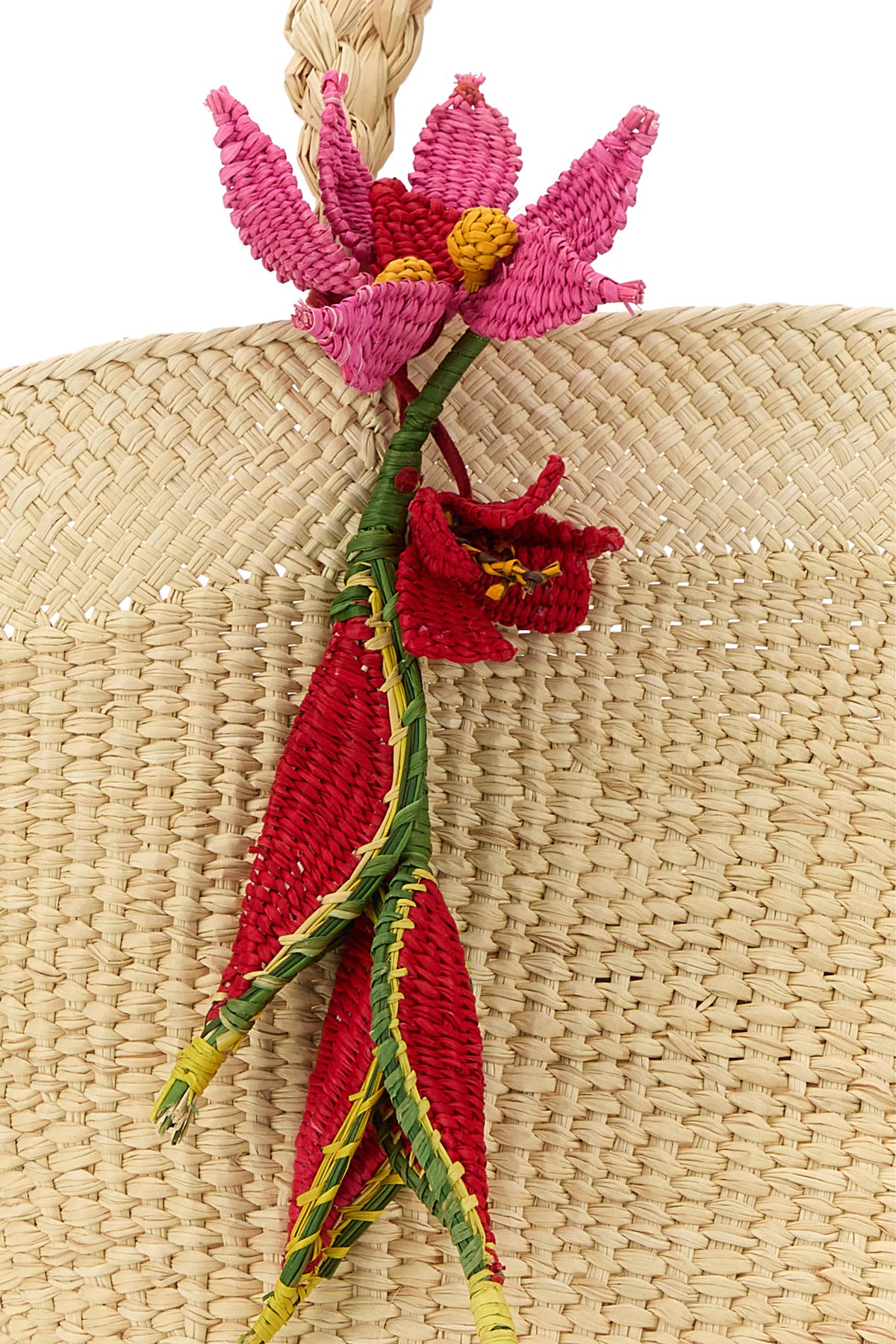 Bucket bag realized in raffia enriched by floral patch at the front.