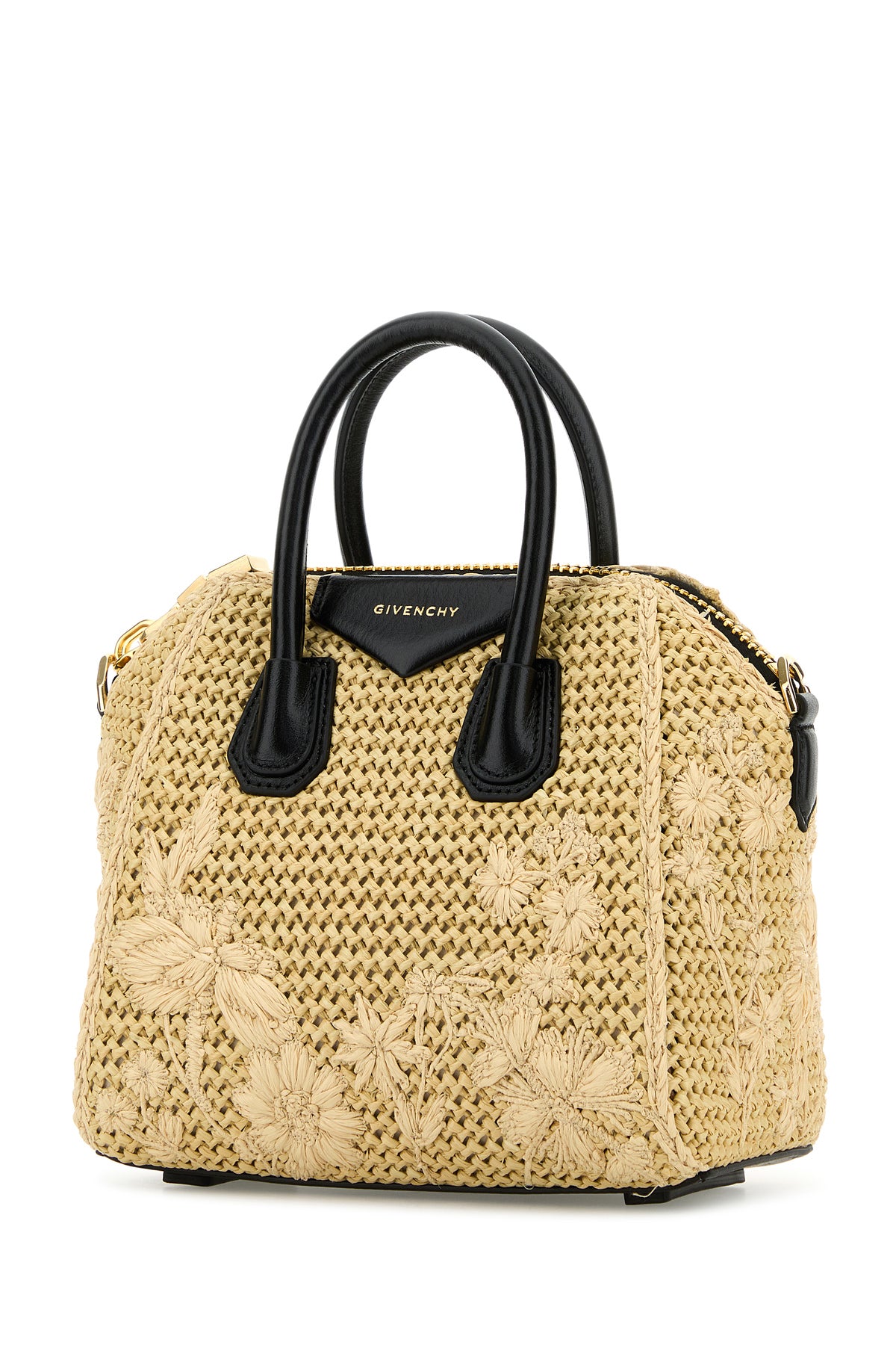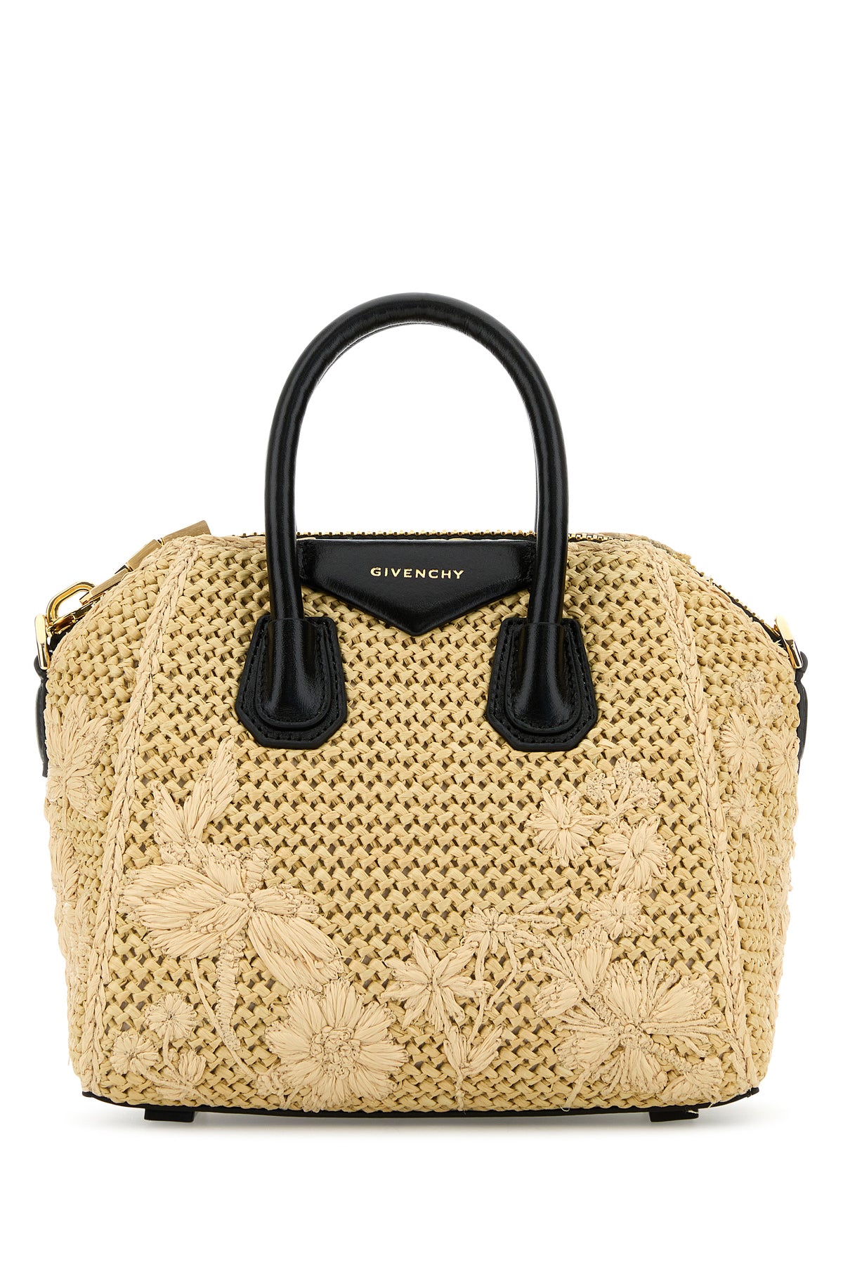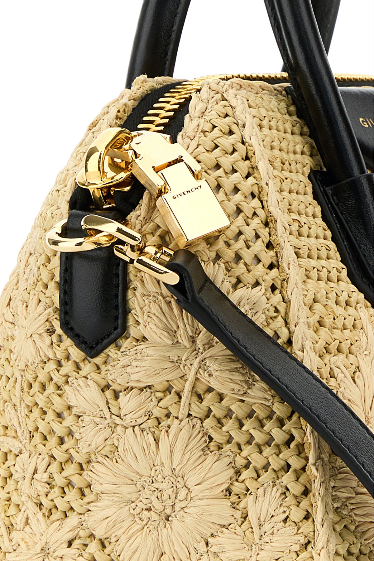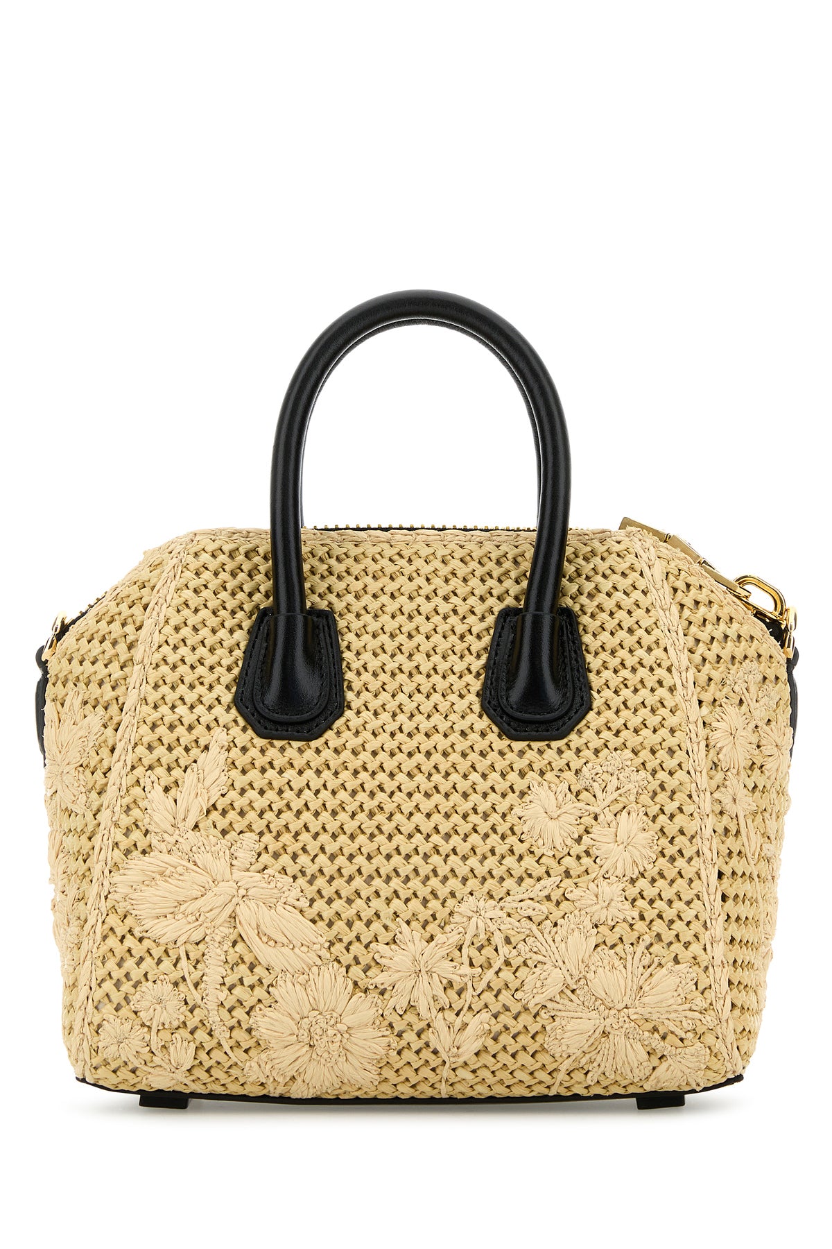 Handbag realized in woven raffia characterized by tonal peculiar embroideries on the entire surface enriched by contrasting leather logoed patch at the front.