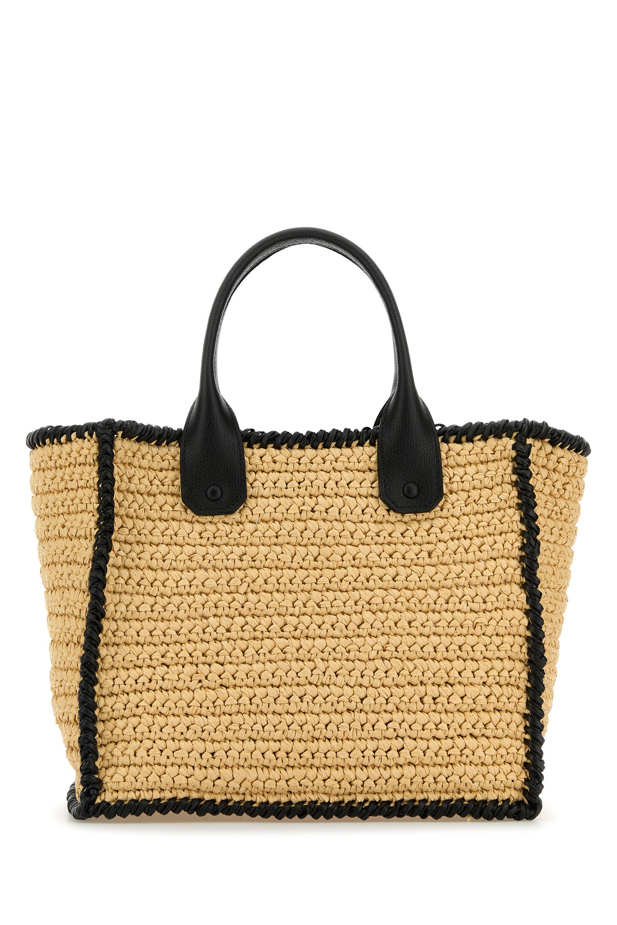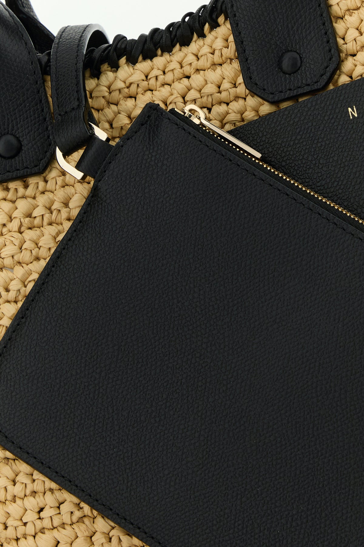 Shopping bag realized in raffia enrich by leather patch pocket at the front.
