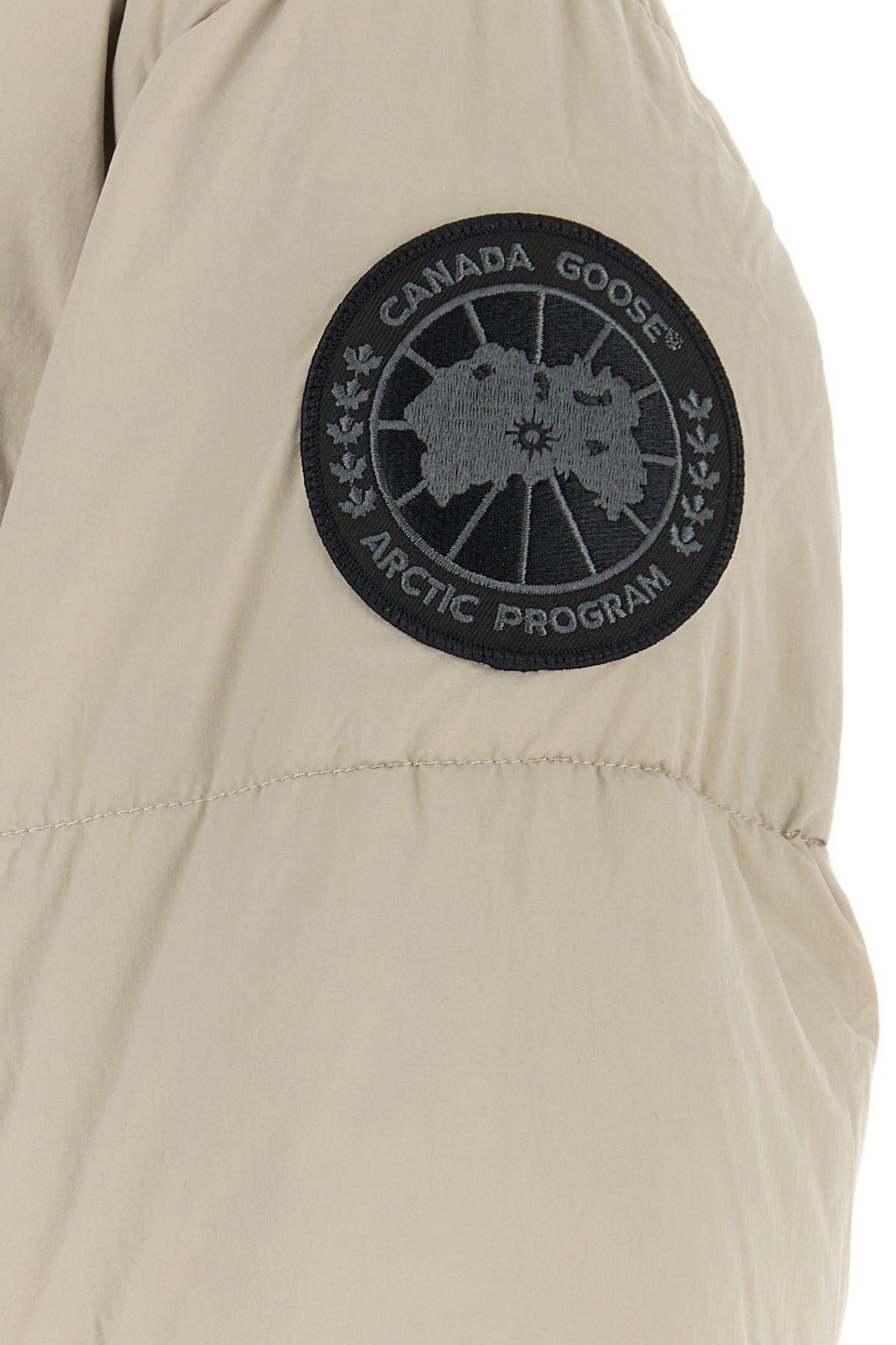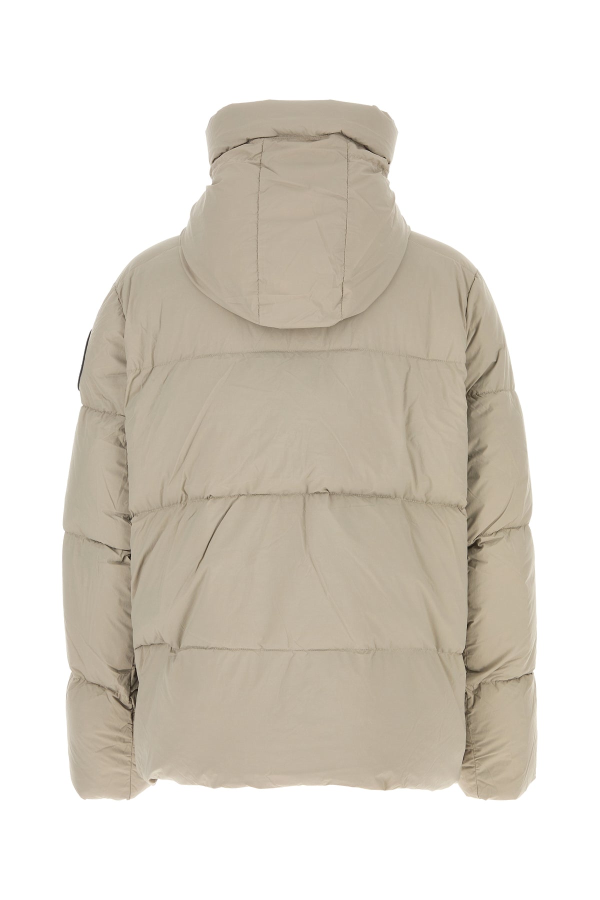 Down jacket realized in nylon enriched by tonal logoed patch on the sleeve.