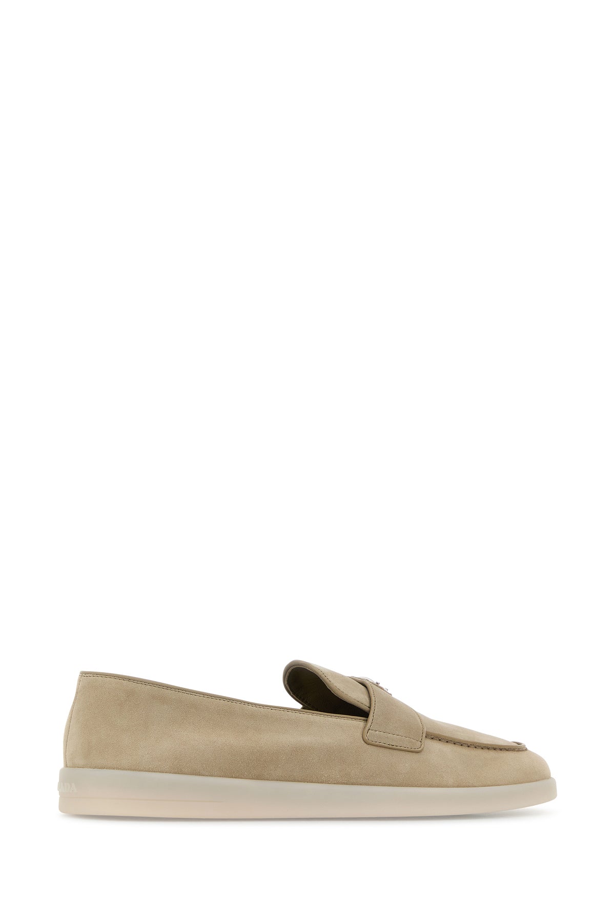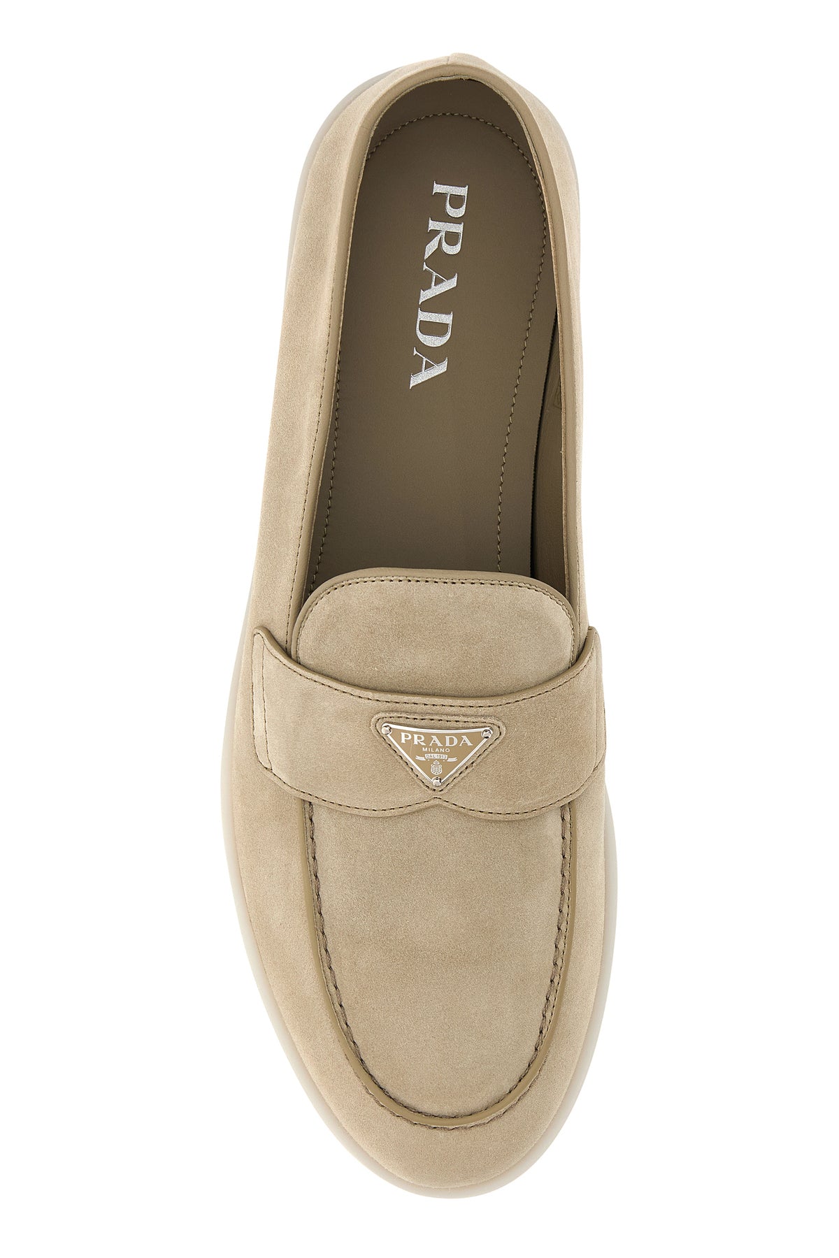 Loafers realized in suede characterized by logo in relief at the back enriched by iconic logoed metal triangle on the vamp.