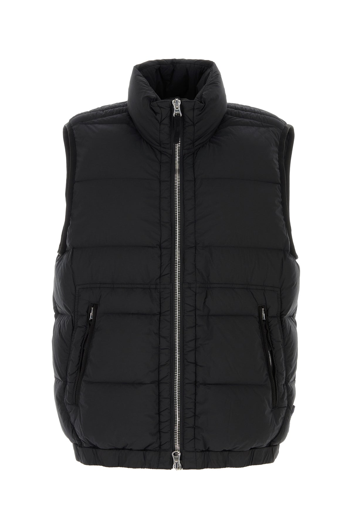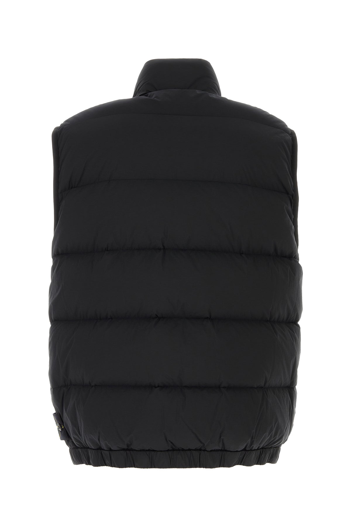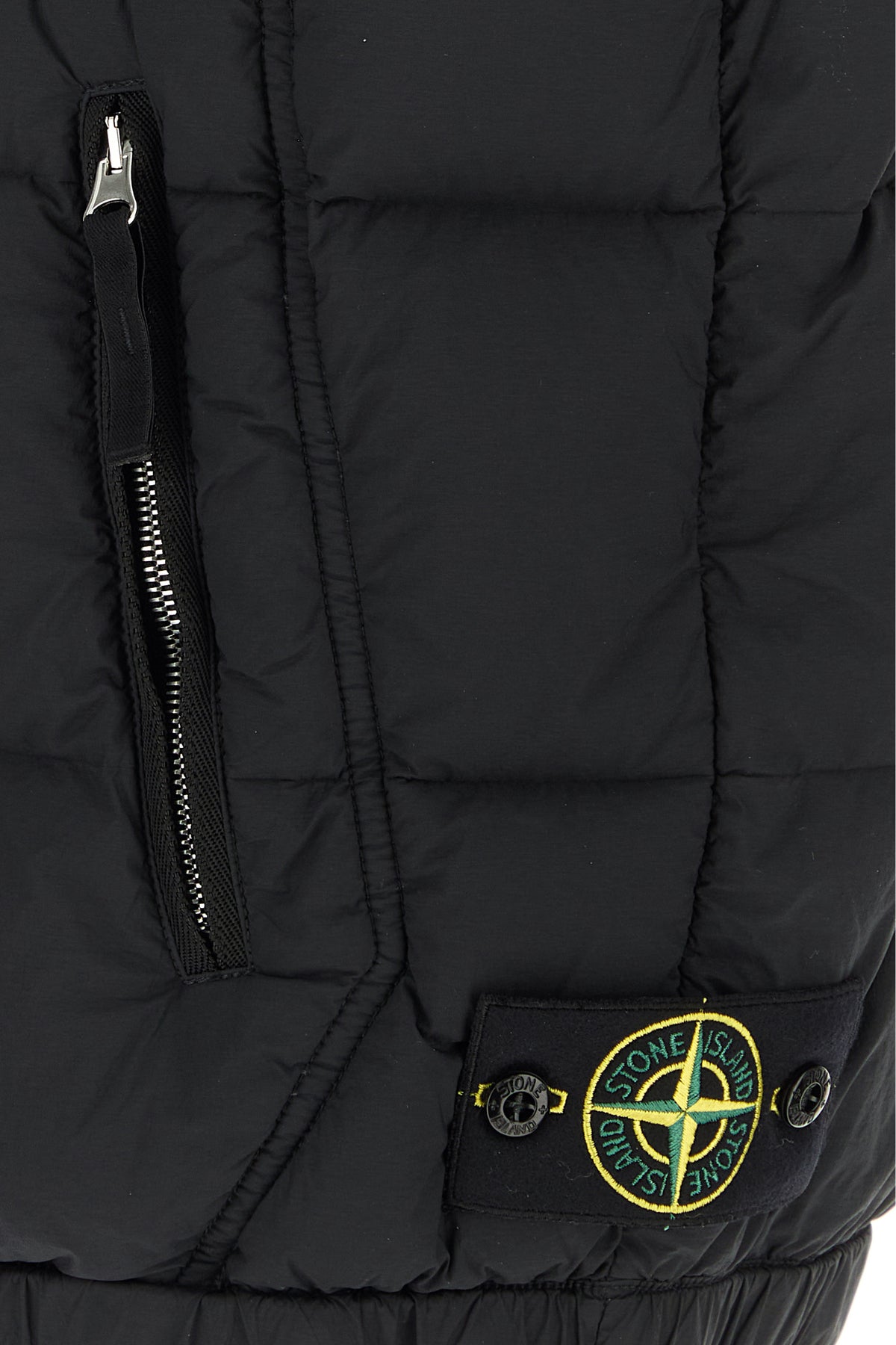 Sleeveless down jacket realized in stretch nylon enriched by detachable logoed label on the side.